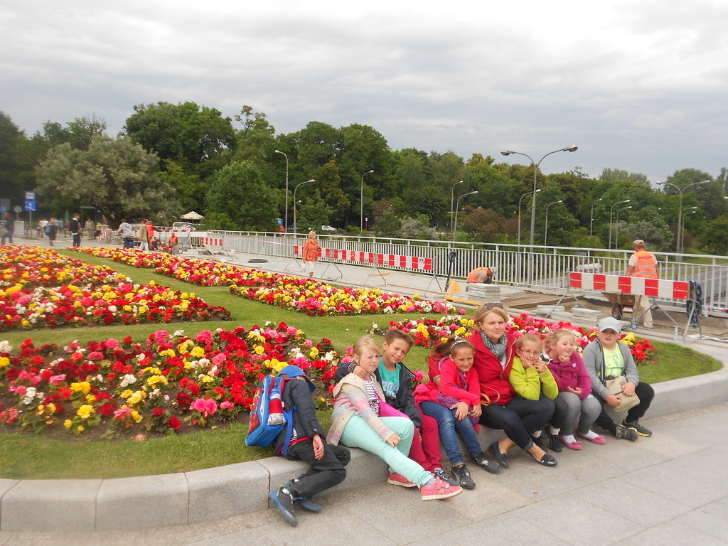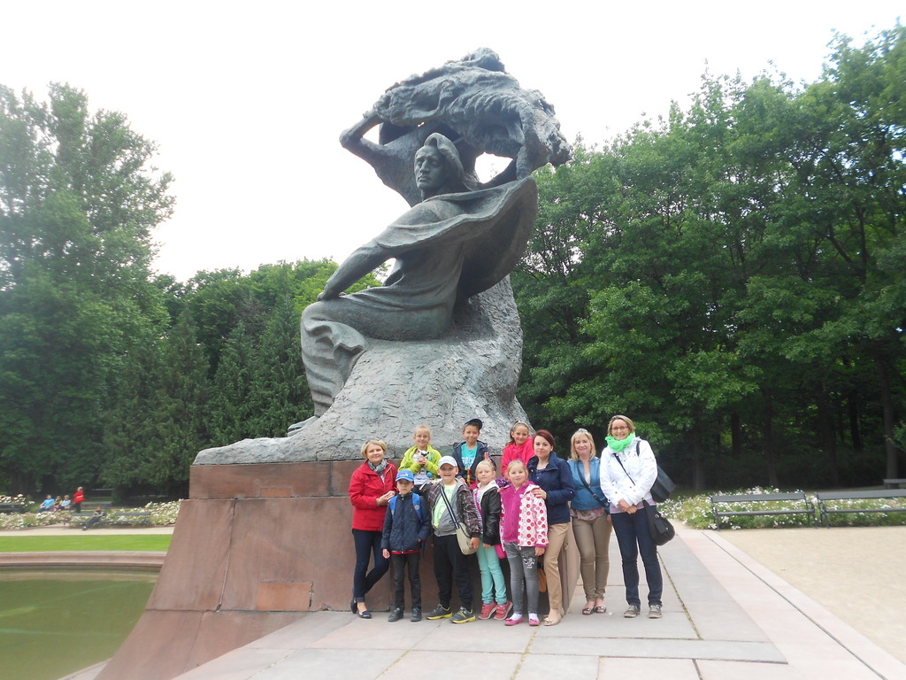 Następnym punktem programu były Łazienki Królewskie. Pan Fryderyk Chopin czekał na nas i przywitał muzyką z kolejnej grającej ławeczki. W parku czekały też wiewiórki, pawie i ryby w stawie oraz pyszne lody i gofry. Widzieliśmy też dom w którym mieszka nasz prezydent. To Belweder a nazwa ta oznacza –piękny widok. Z Łazienek udaliśmy się do Pałacu Kultury i Nauki i wjechaliśmy windą na 30 piętro na taras widokowy. Ku naszemu zdziwieniu winda pokonała tą wysokość w 20 sekund. Widok z góry niezapomniany – ludzie jak mrówki, samochody jak zabawki, domy jak domki z klocków. Bardzo zmęczeni, ale szczęśliwi udaliśmy się w drogę powrotną do domu. Trochę było tłoczno i mimo bolących nóg musieliśmy stać podczas podróży, ale nawet to nie popsuło nam dobrego humoru.