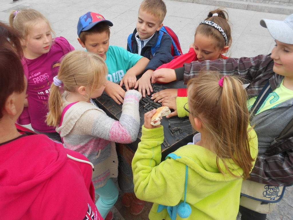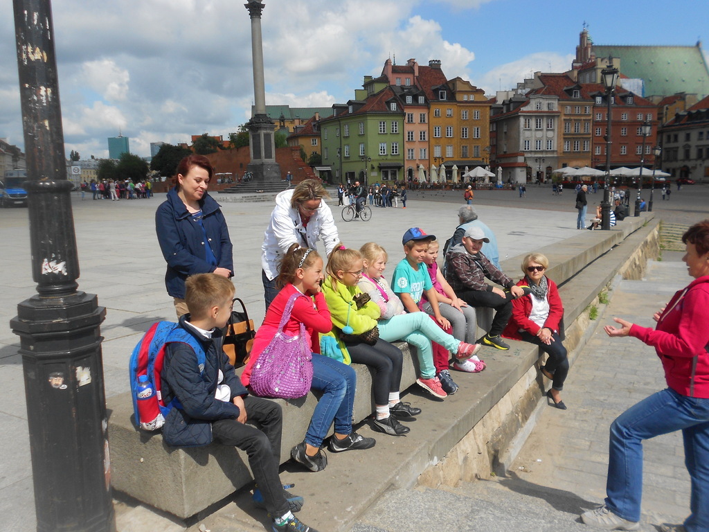 Po spotkaniu z panią przewodnik na Placu Zamkowym rozpoczęliśmy spacer po Starym Mieście. Wszystkim podobały się kolorowe kamienice na rynku Starego Miasta. Zachwyt wzbudzały też bardzo wąskie uliczki oraz ich nazwy i kształty np. ul. Kanonia w kształcie trójkąta z królującym pośrodku dzwonem, który ma czarodziejską moc spełniania życzeń. Wystarczy obejść go dokoła i głośno wypowiedzieć swoje życzenie. Zobaczyliśmy Warszawską Syrenkę, która niestrudzenie mieczem broni miasto, pomnik Małego Powstańca, mury obronne i Barbakan. Wielką radość sprawiła nam przejażdżka ruchomymi schodami przy Trasie W-Z – są naprawdę bardzo strome. Traktem Królewskim powędrowaliśmy w kierunku Nowego Światu, zatrzymując się ważnych historycznie dla miasta miejscach. Zatrzymaliśmy się na chwilę przy Pałacu Prezydenckim, posłuchaliśmy muzyki płynącej z ławeczek poświęconych Fryderykowi Chopinowi i udaliśmy się na Plac Zwycięstwa pod Grób Nieznanego Żołnierza. Pięknie o tej porze roku wygląda Ogród Saski z rzeźbami i fontannami. Pani przewodnik przez cały czas opowiadała dzieciom o historii miasta i ważnych postaciach historycznych, których pomniki mogliśmy oglądać podczas spaceru.