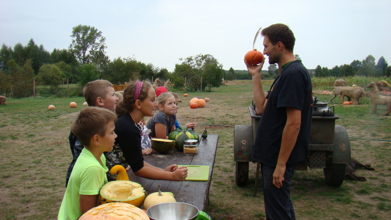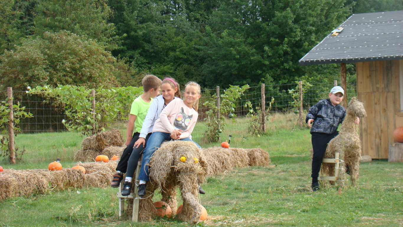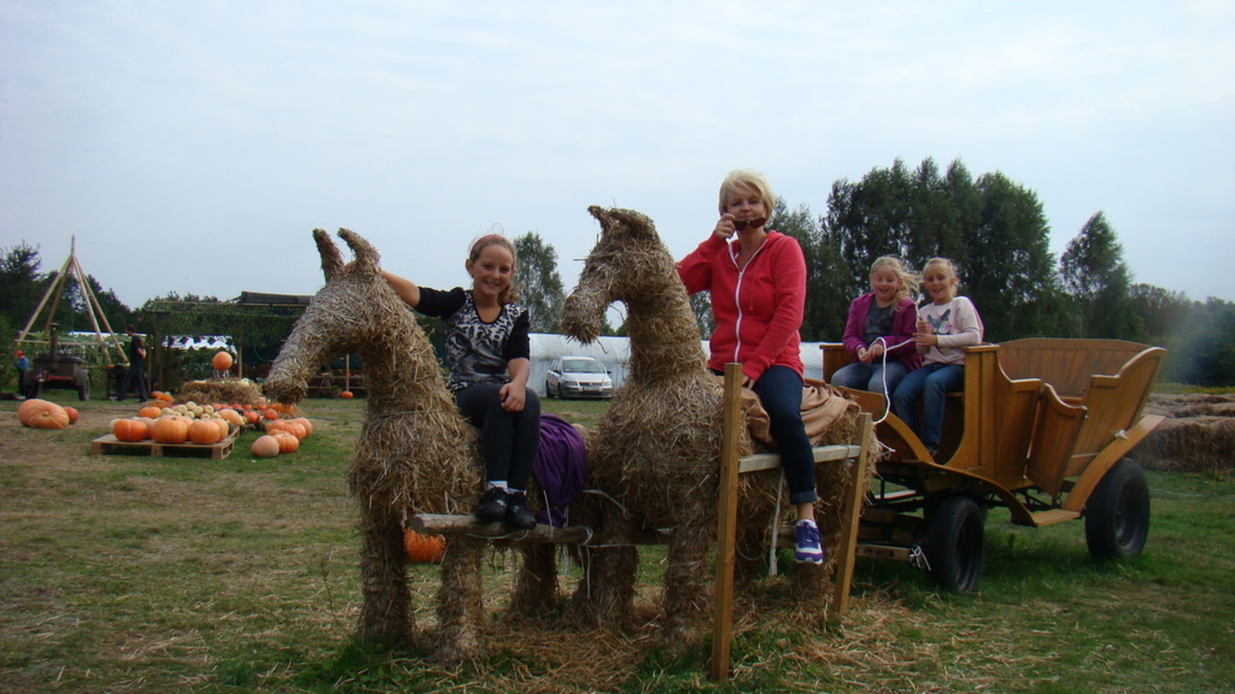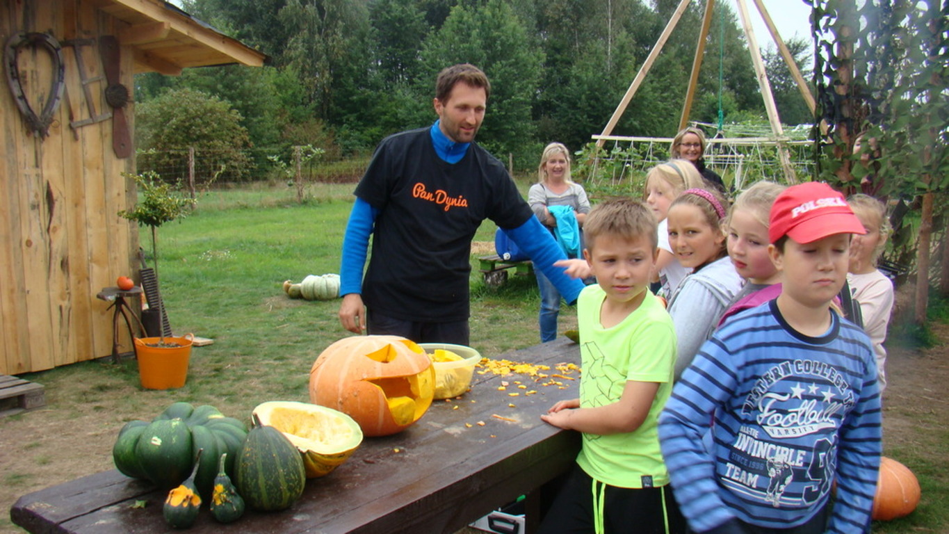Jeśli komuś dynia kojarzy się wyłącznie z Halloween , ten koniecznie powinien odwiedzić pomarańczową krainę tysiąca dyń o wdzięcznej nazwie Dynioland. My odwiedziliśmy to miejsce 11 września 2014 roku i przekonaliśmy się, że świat dyń ma wiele odsłon. Podczas 3,5 godzinnego pobytu mogliśmy zobaczyć i dotknąć ponad 40 gatunków dyń z całego świata. Na dzieci czekało wiele atrakcji m.in. labirynty w słomie i na polu kukurydzy, w których poszukiwaliśmy ukrytych dyń. Największą atrakcją okazało się mini ZOO – to słomiane pełniące rolę placu zabaw i to prawdziwe, w którym karmiliśmy koźlątka i króliki. Gospodarze zadbali również o nasze brzuszki i przygotowali dla nas zupę z dyni, prażone pestki dyni oraz frytki oczywiście też z dyni. Pobyt na Farmie zakończyliśmy ogniskiem z pieczeniem kiełbasek.