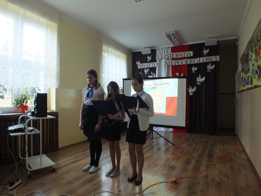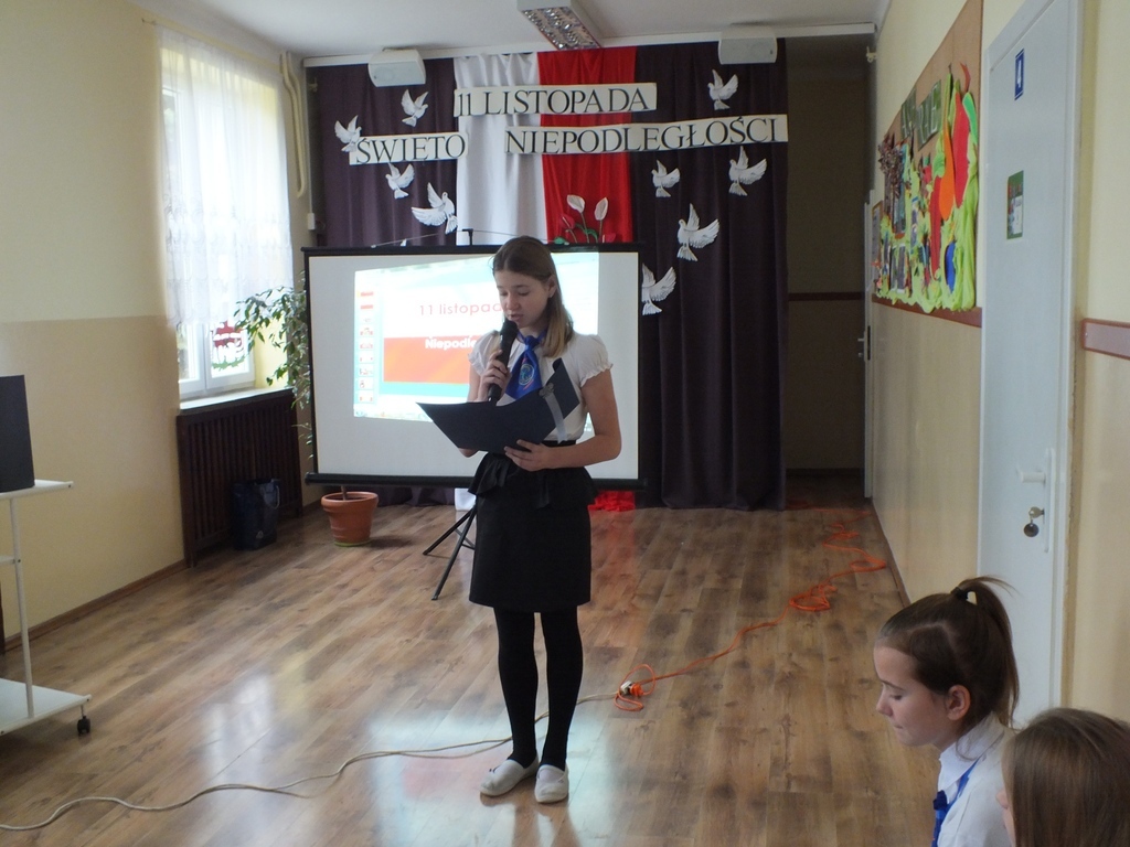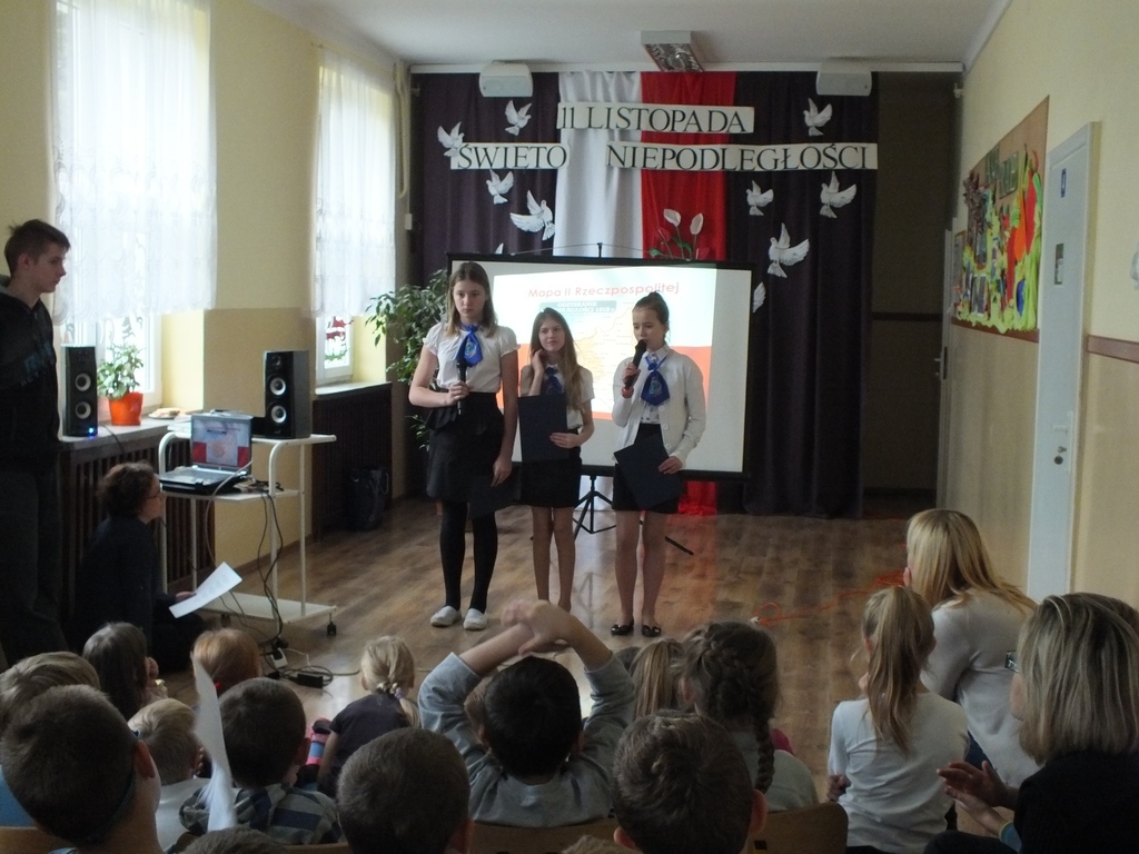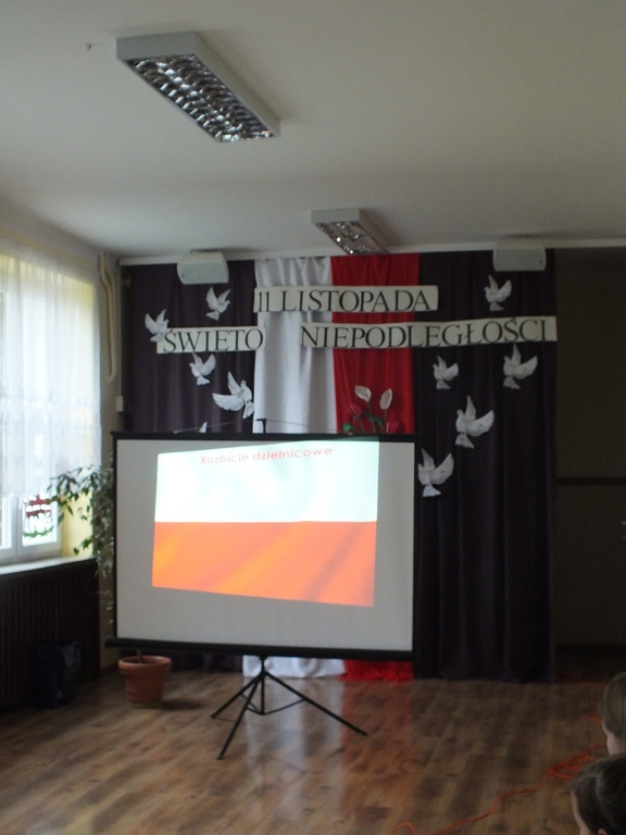 12 listopada uczciliśmy 96 rocznicę odzyskania przez Polskę niepodległości. W tym roku widzowie mieli okazję obejrzeć multimedialną lekcję historii Polski od początków państwa polskiego do odzyskania niepodległości w 1918 roku. Na slajdach pojawili się m.in. pierwsi władcy z dynastii Piastów, Krzyżacy, Stanisław August Poniatowski i oczywiście Józef Piłsudski. Uczniowie poznali genezę rozbiorów Polski przez trzech sąsiadów a także okoliczności w jakich po 123 latach nasze państwo wróciło na mapy świata. Nie mogło oczywiście zabraknąć Roty, którą na koniec przedstawienia zaśpiewali wszyscy widzowie.