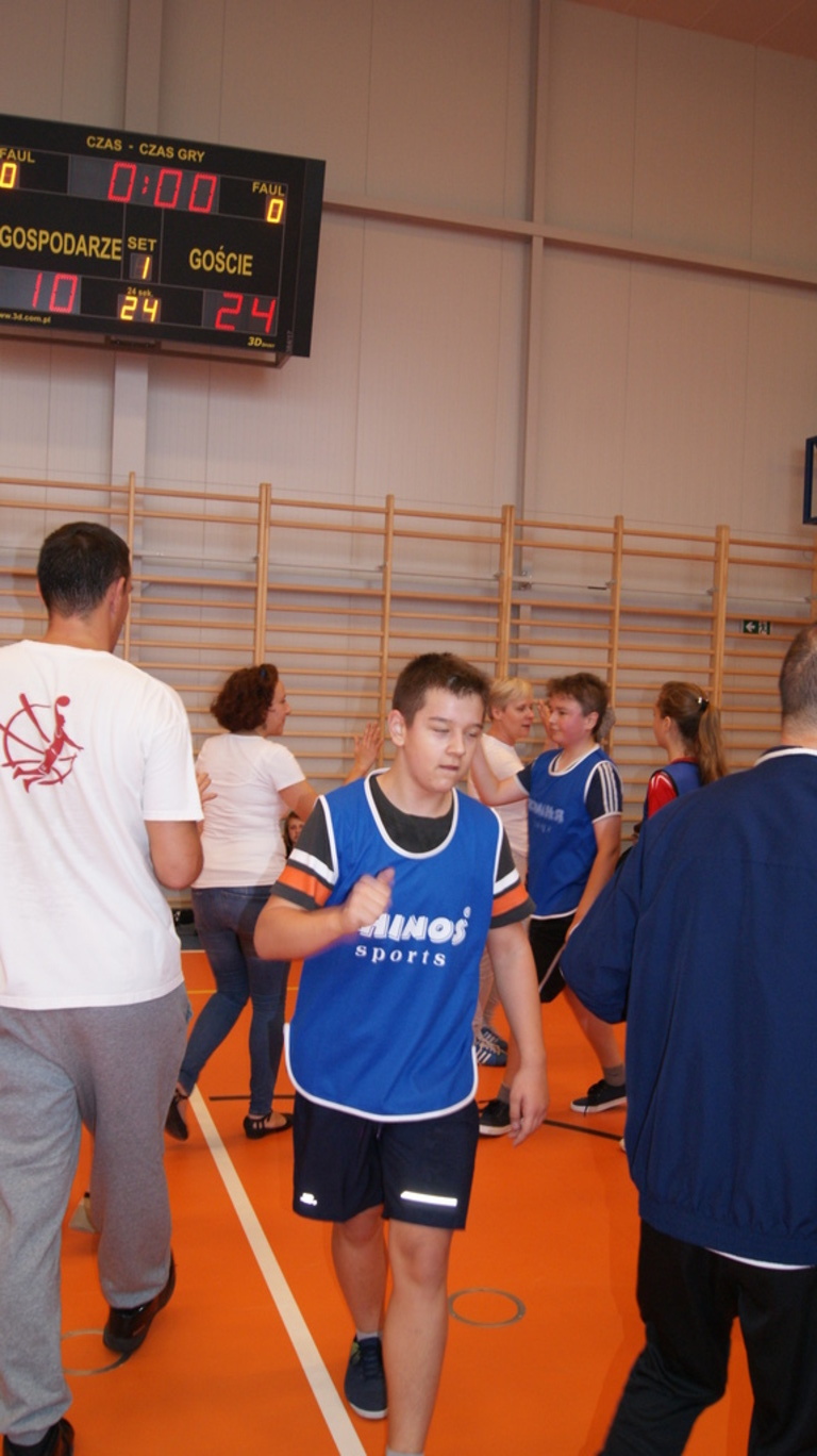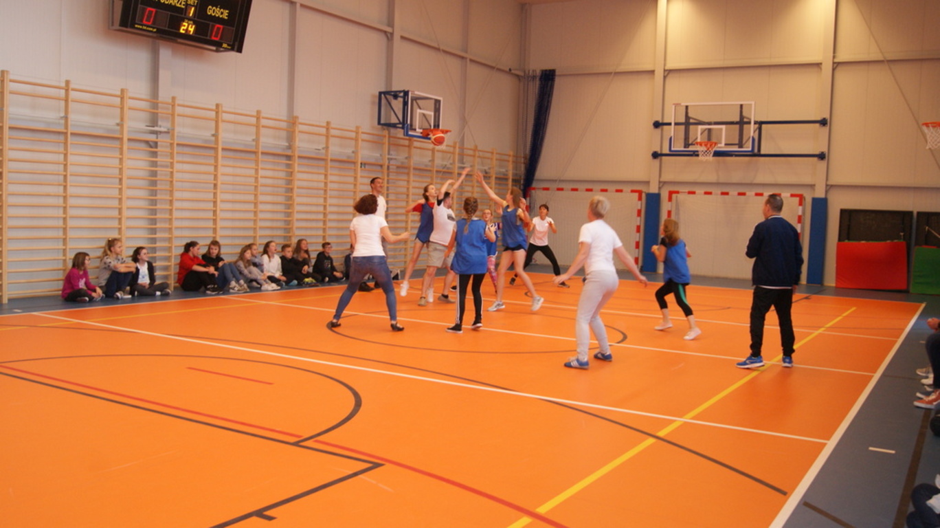 Drużyna Nauczycieli rywalizowała z drużyną Uczniów. Nauczycieli reprezentowali : Pedagog, Psycholog, Wuefistka, Informatyk i Anglista . W zespole uczniów wystąpili : Ola, Kasia , Nadia, Nina, Amelia, Adrian ,Kuba , Kacper ,Mikołaj i Adrian. Po rozegraniu czterech kwart mecz zakończył się wygraną Nauczycieli 24:10.
