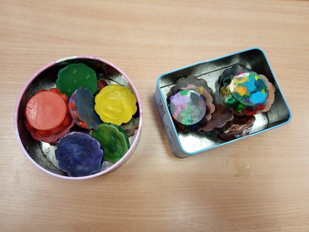 Dzieci miały okazję poznać kredki, które można zrobić samemu, wykorzystują stare i połamane kredki woskowe...