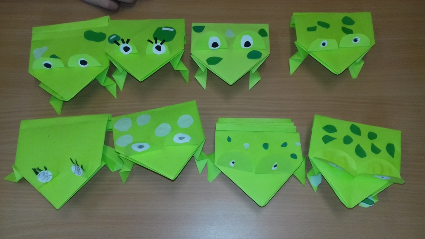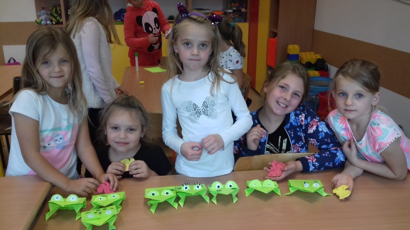 Dzieci w ramach zajęć plastycznych na świetlicy wykonały skaczące żabki.