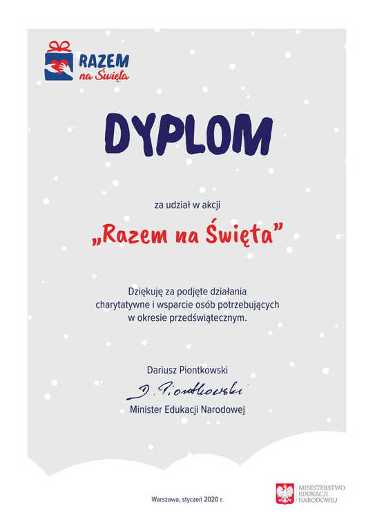 Szanowni Państwo, w imieniu Ministra Edukacji Narodowej Dariusza Piontkowskiego bardzo serdecznie dziękuję za włączenie się do naszej akcji „Razem na Święta”. Inicjatywa miała na celu zachęcenie uczniów do działań charytatywnych i wsparcia osób potrzebujących w okresie przedświątecznym. W tej edycji (grudzień 2019 roku) do naszej akcji przyłączyło się ponad 1 mln 100 tys. uczniów i prawie 117,5 tys. nauczycieli. Otrzymaliśmy od Państwa ponad 10 tys. zgłoszeń! Dziękujemy za dzielenie się dobrem i wspieranie innych! |
