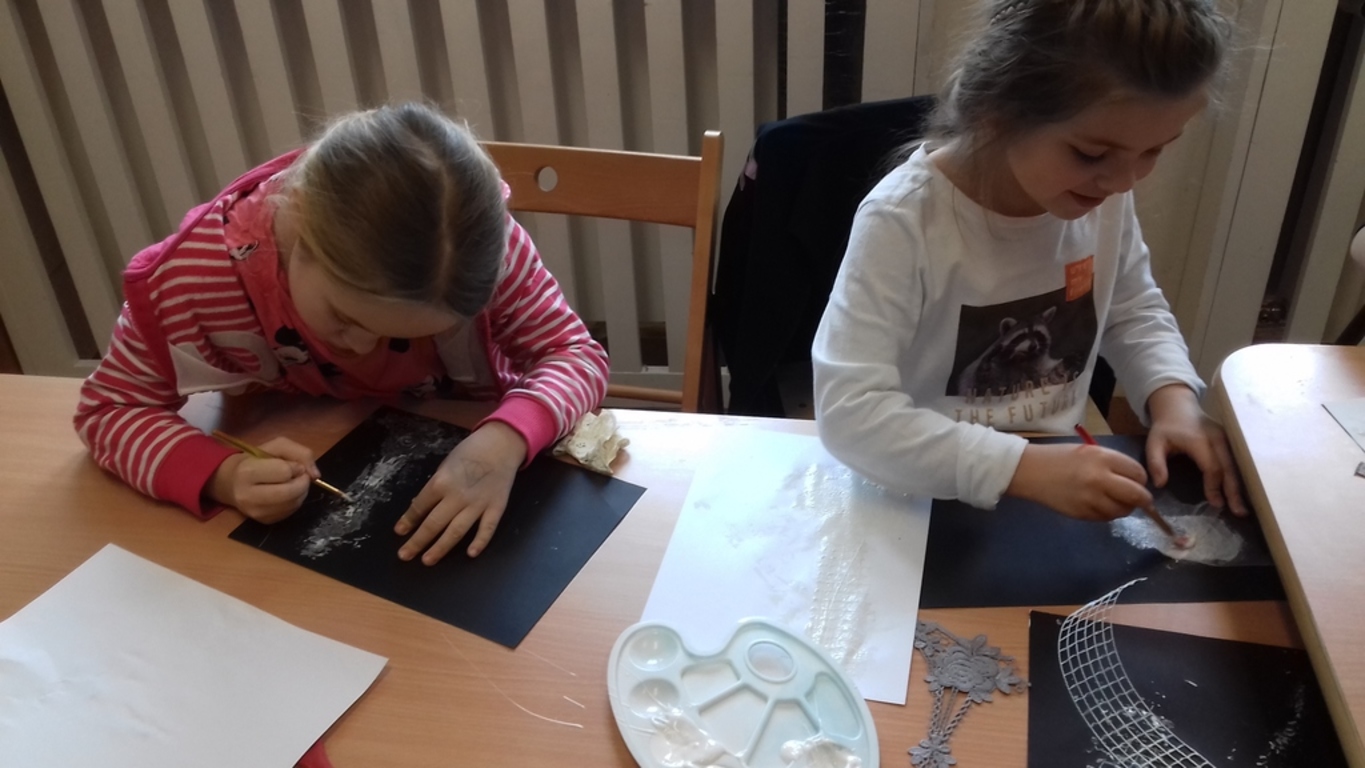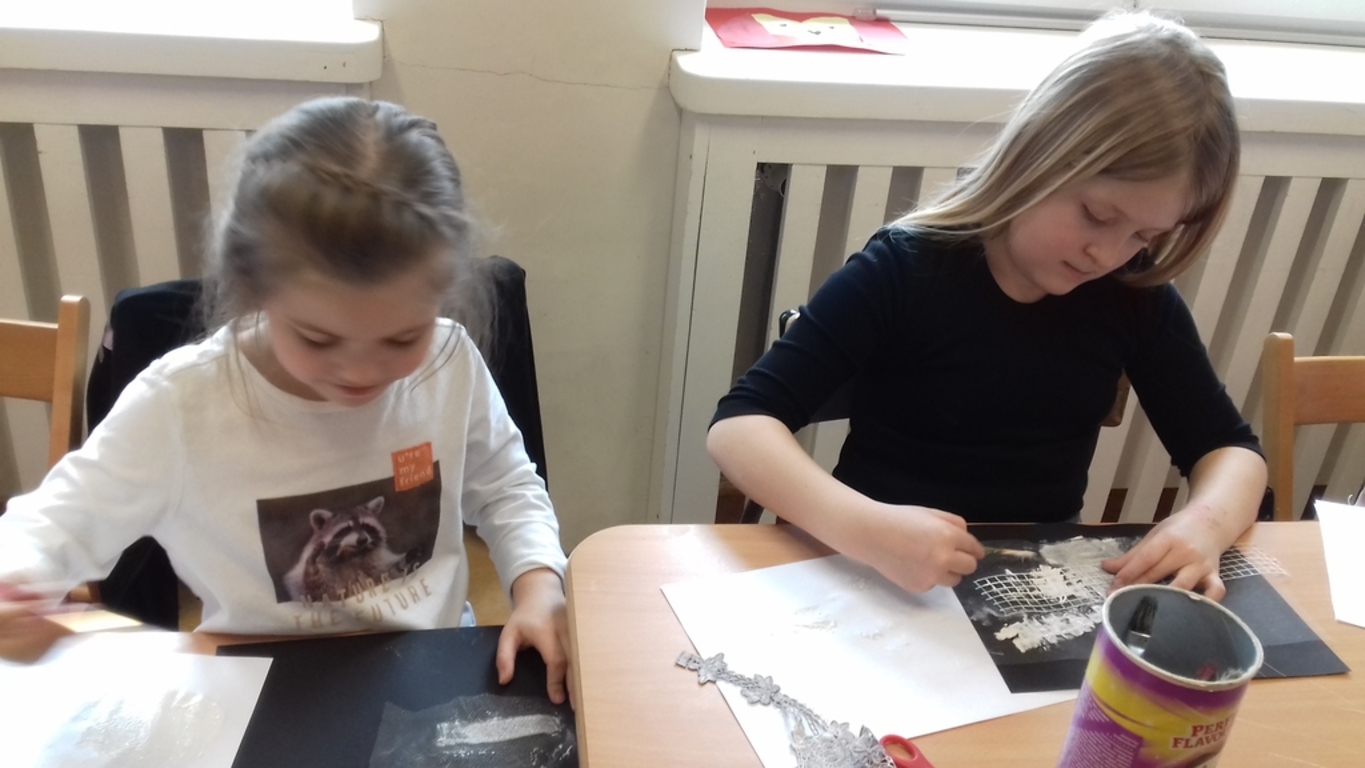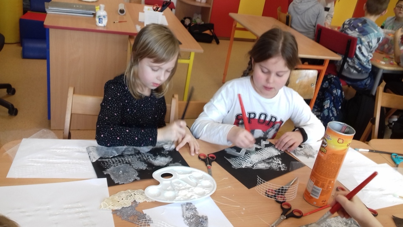 Wspominając tegoroczne ferie, na naszej świetlicy wykonaliśmy zimowe pejzaże. Stempelki z koronki, tiulu i wstążki doskonale odzwierciedliły piękno gór zimą...
