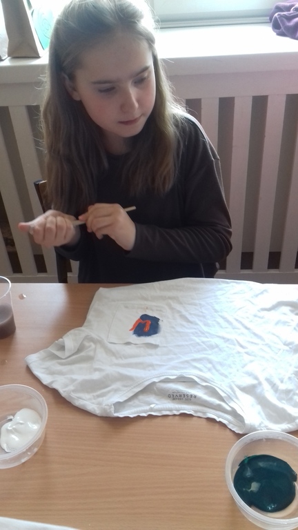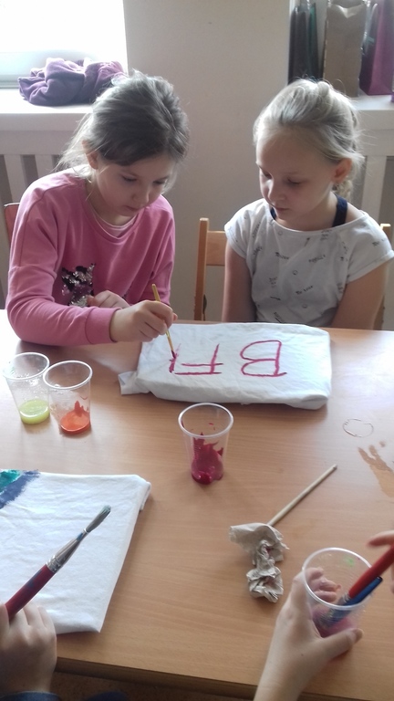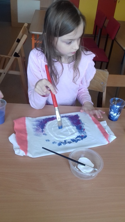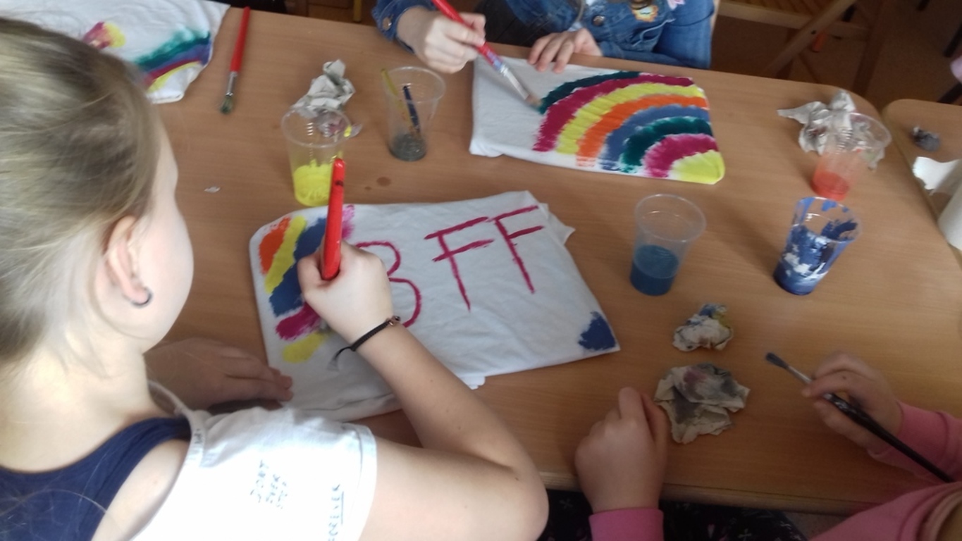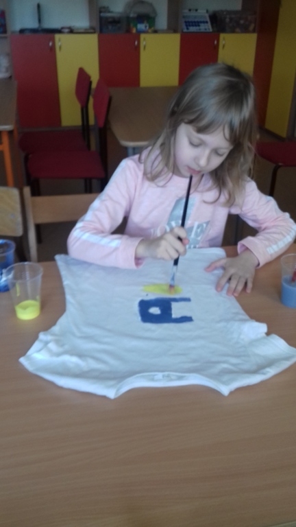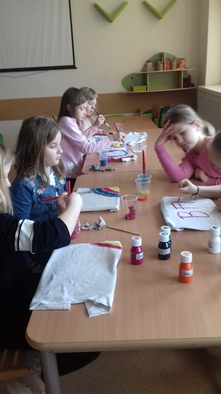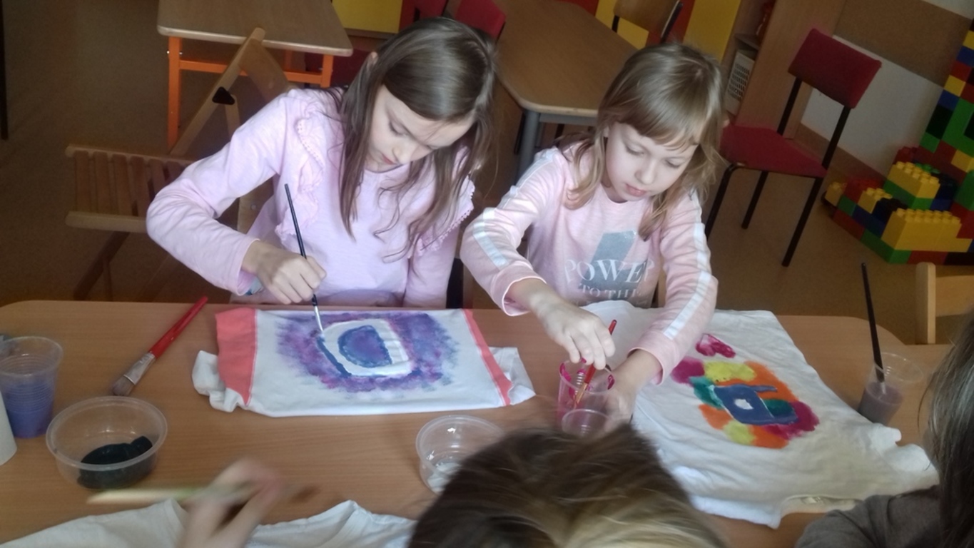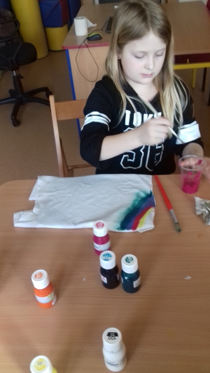 Malować można na papierze, szkle, płótnie. My na zajęciach świetlicowych postanowiliśmy pomalować farbami do tkanin nasze koszulki. Powstały nadruki takie jak my i nasza szkoła...barwne i radosne.
