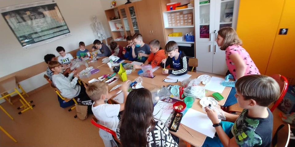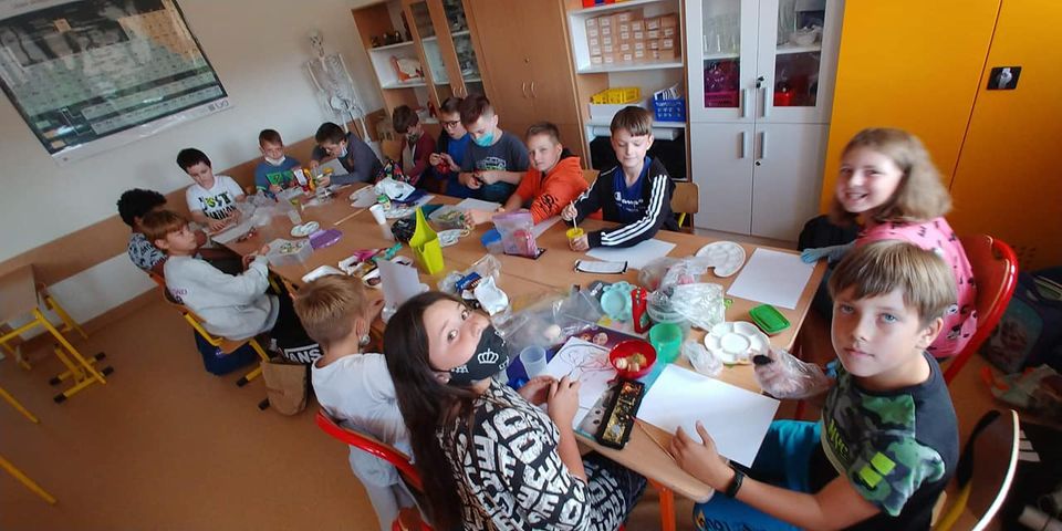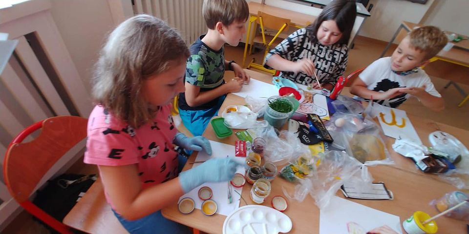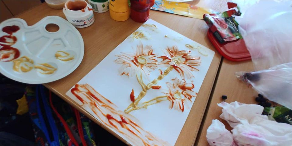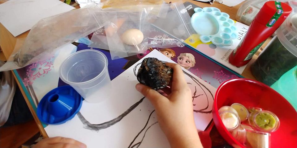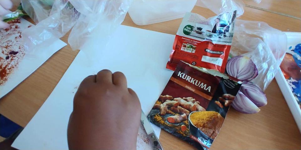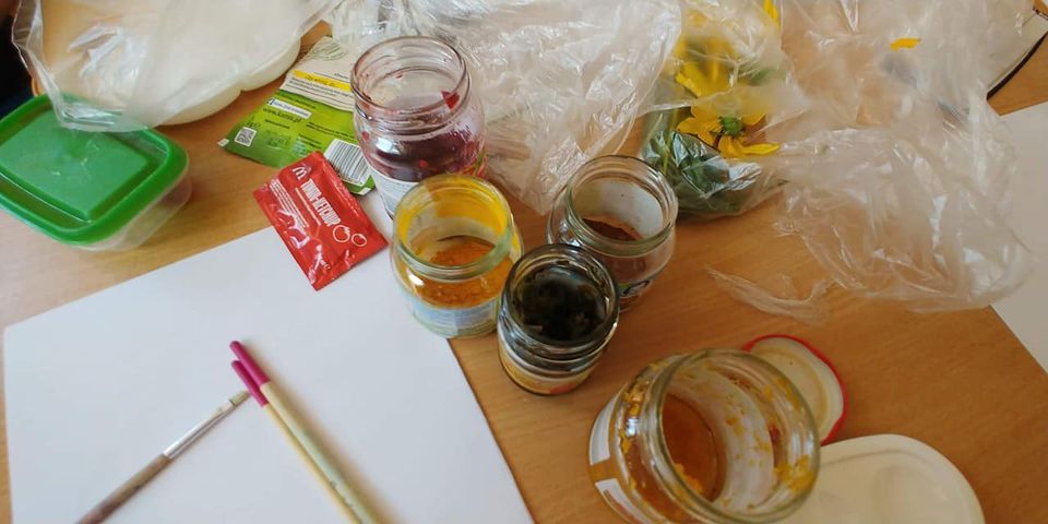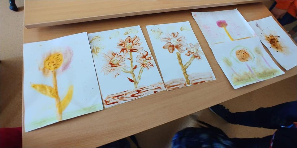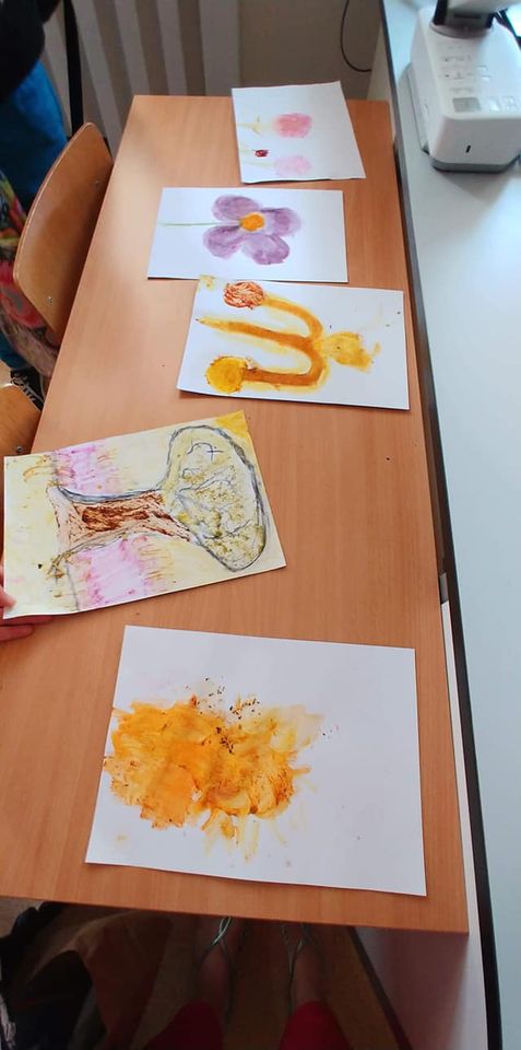 Lekcja plastyki w klasie 4 i 5 przebiegała dziś pod hasłem "barwniki naturalne". Uczniowie otrzymali zadanie, żeby przygotować jak najwięcej wspomnianych barwników na lekcję. Wykazali się dużą kreatywnością i dzisiejsze prace były wykonane m.in. burakami, węglem drzewnym, żółtkiem z surowego jajka, kurkumą, keczupem, marchewką, skórkami od orzechów włoskich, trawą, elementami kwiatów i owoców, papryką, cebulą. Pachniało w całej szkole. Prezentuję Państwu zdjęcia z tych niezwykłych zajęć. Zachwycona nauczycielka plastyki.