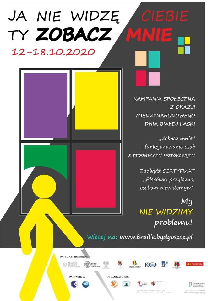 W dniach 12-18.10.2020r. nasza szkoła przyłącza się do kampanii społecznej "Ja nie widzę Ciebie, ty zobacz mnie" zorganizowanej przez K-P SOSW NR 1 IM. L .Braille'a w Bydgoszczy z okazji Międzynarodowego Dnia Białej Laski.