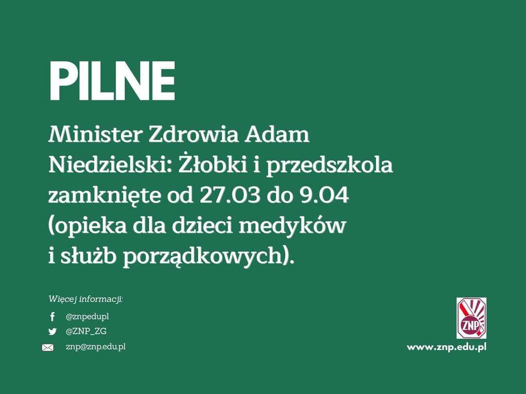 "Ze względu na bezpieczeństwo dzieci i rodziców, zamknięte zostaną żłobki i przedszkola. Wyjątkiem będzie sprawowanie opieki nad dziećmi pracowników medycznych i służb porządkowych (m.in. żołnierzy, funkcjonariuszy policji i straży pożarnej).