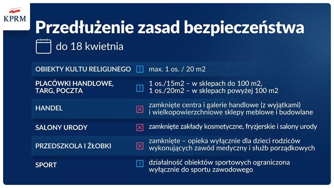 Zgodnie z informacją podaną w dniu dzisiejszym przez Kancelarię Premiera, następuje przedłużenie obowiązujących zasad bezpieczeństwa do 18 kwietnia 2021r.⚠️