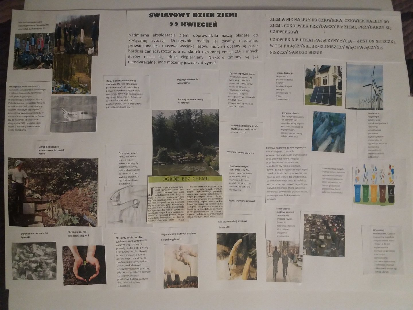 Obchodzony jest również w Polsce i dlatego w naszej szkole zorganizowano w dniach 15 -22 kwietnia w klasach IV-VIII tydzień dla Ziemi. Na zajęciach z wychowawcą i przyrody przeprowadzono zajęcia tematyczne, na zajęciach biologii odbył się konkurs wiedzy przyrodniczej.