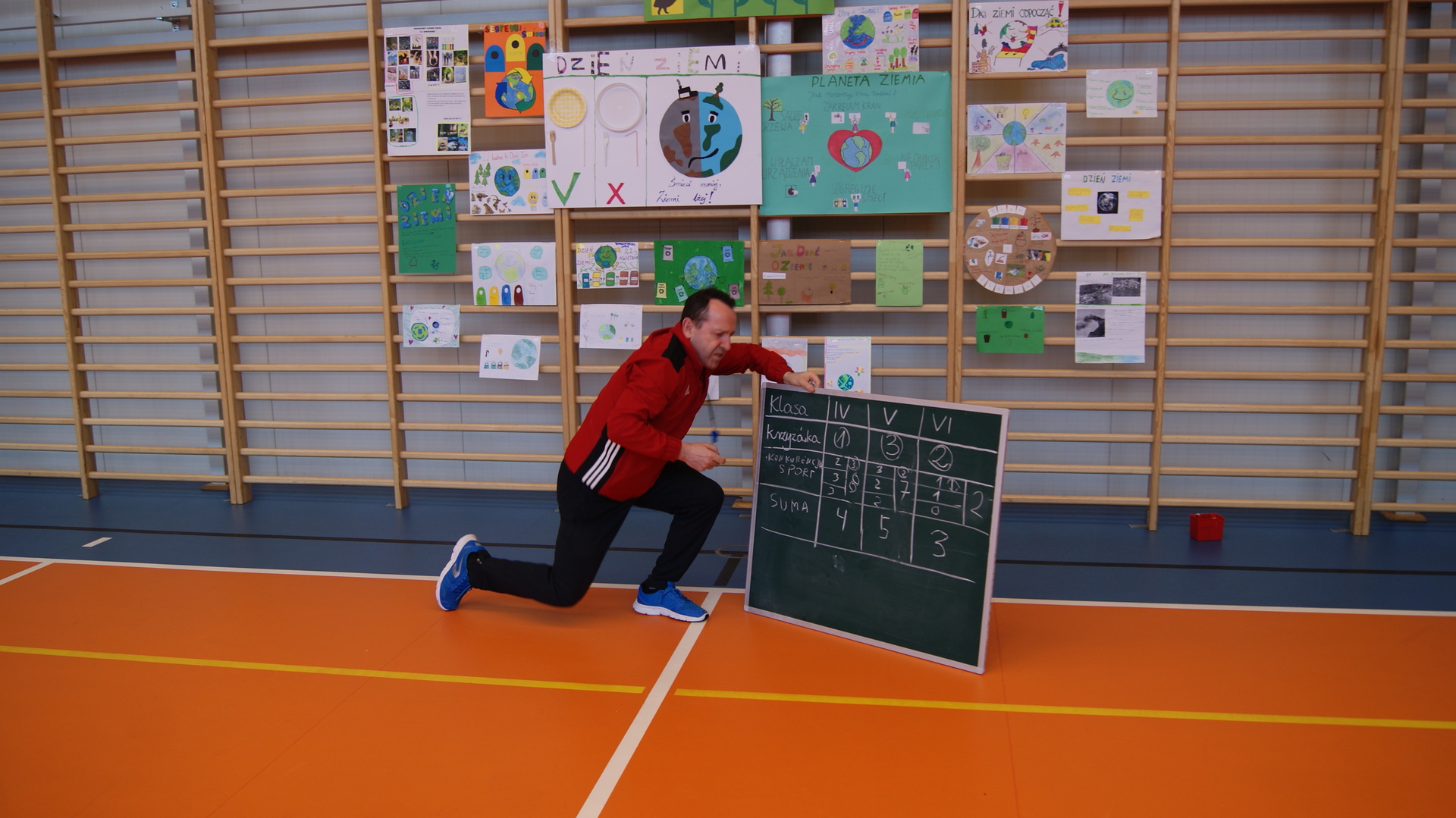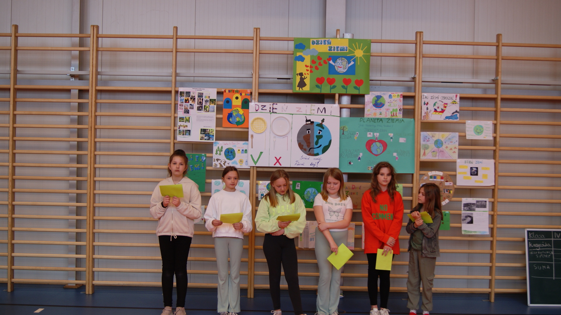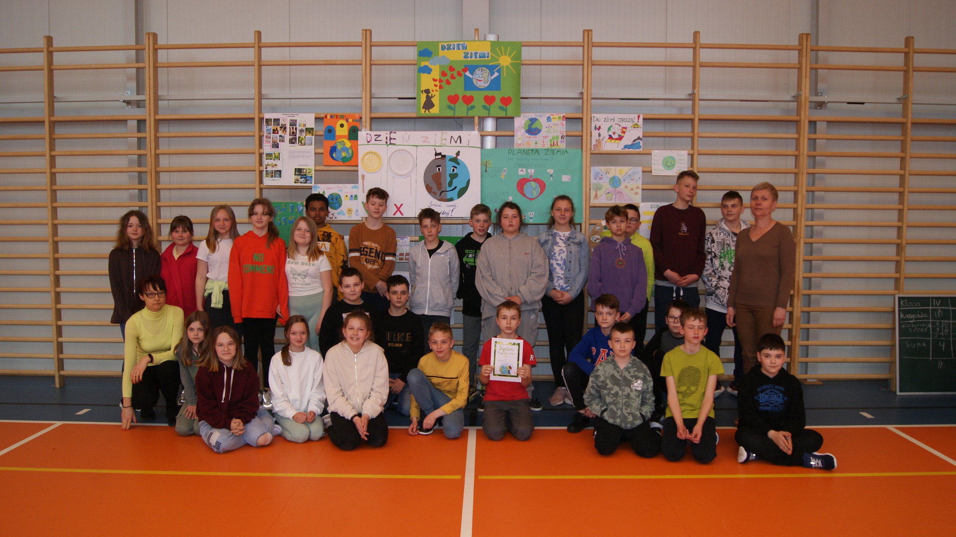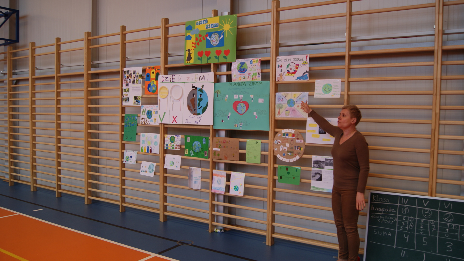 Następnie klasy 4-6 spotkały się na hali sportowej w celu podsumowania działań ekologicznych. Klasa 4 przygotowała krótką historię powstania obchodów Dnia Ziemi i przedstawiła pozostałym uczestnikom. Klasa 4- 6 podały kilka pomysłów na działania ekologiczne, które można stosować przez cały rok. Następnie uczestnicy rywalizowali w konkursie wiedzy rozwiązując krzyżówkę ekologiczną. Przeprowadziliśmy również kilka konkurencji sportowych wykorzystując do zabawy odpady. Największą wiedzą ekologiczna i sprawnością fizyczną wykazała się klasa V, która otrzymała tytuł przyjaciela Ziemi. Najstarsi uczniowie wzięli udział w akcji sprzątania lasów, odbyli pogadanki na lekcjach biologii dotyczące alternatywnych źródeł energii, konieczności ograniczenia emisji dwutlenku węgla, odpowiedzialności za przyszłość naszej planety.