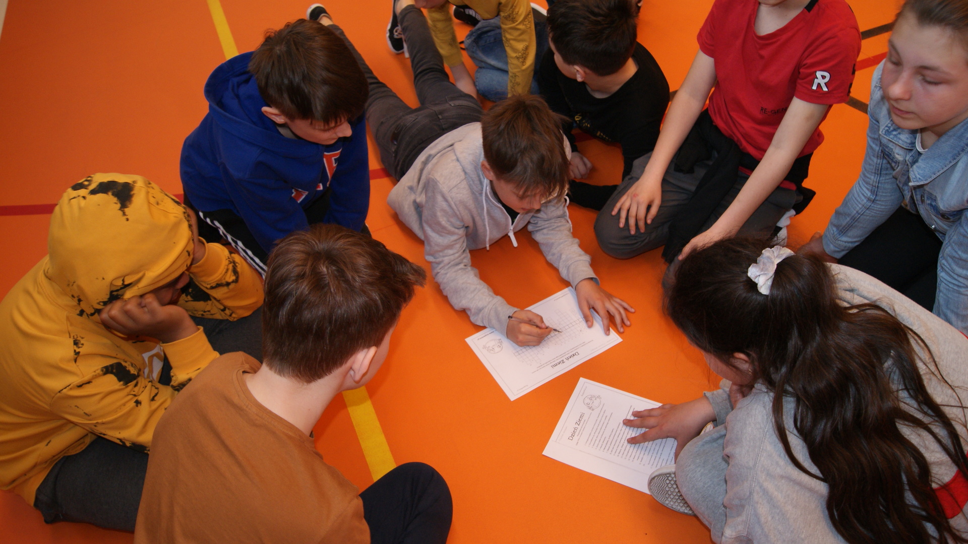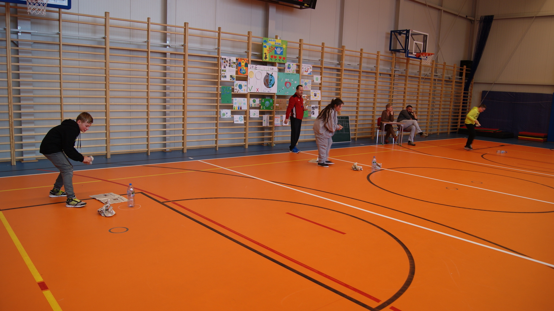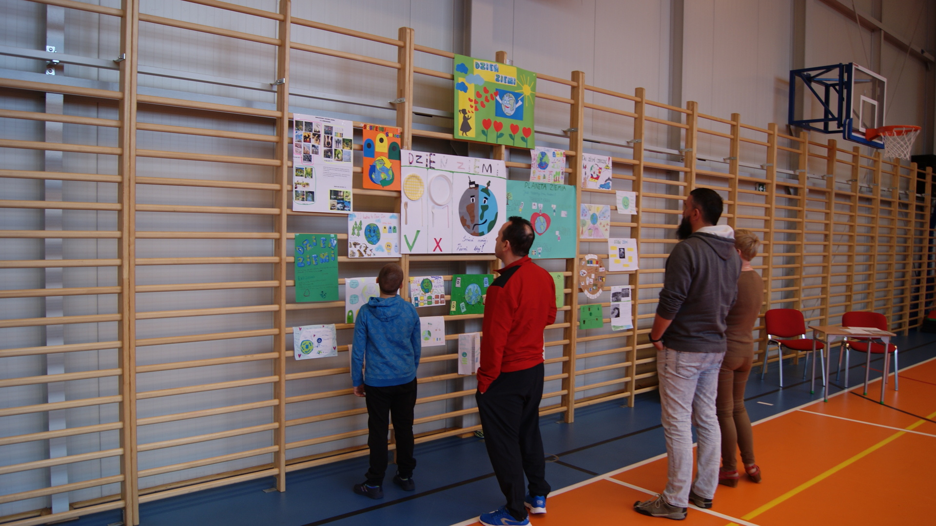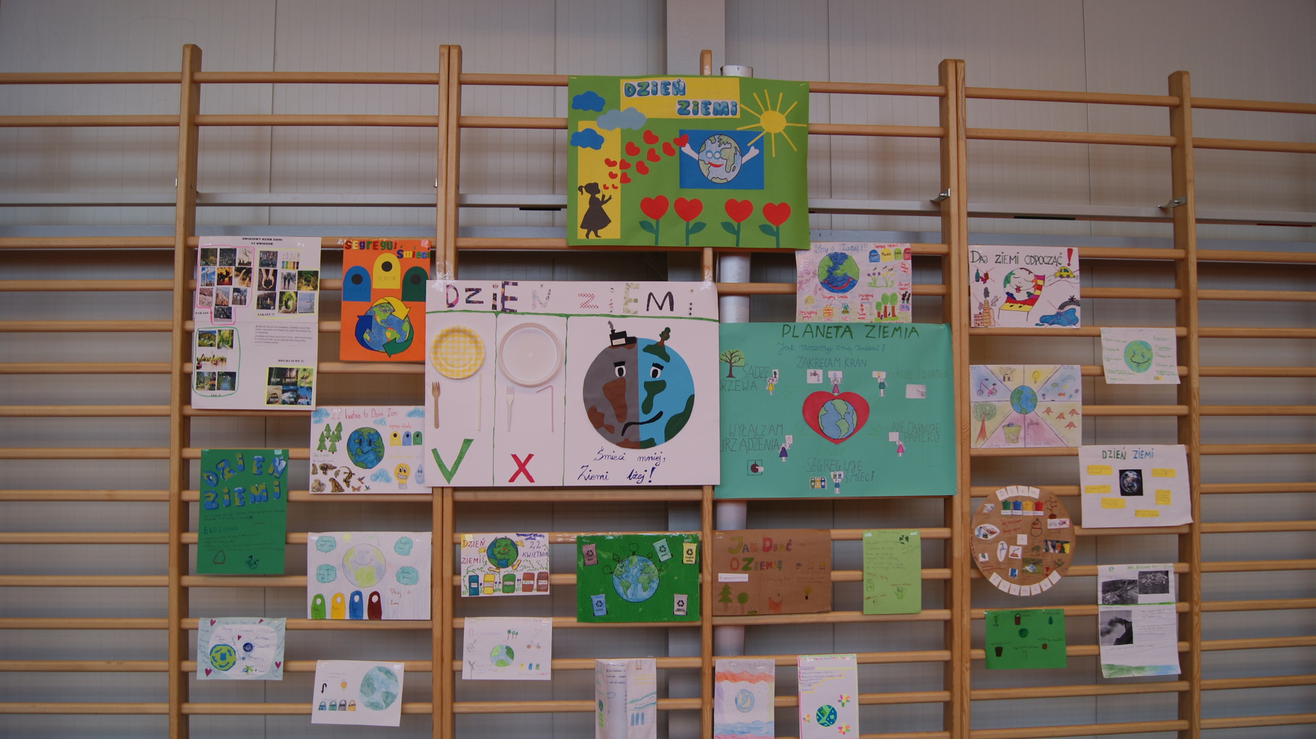 Następnie klasy 4-6 spotkały się na hali sportowej w celu podsumowania działań ekologicznych. Klasa 4 przygotowała krótką historię powstania obchodów Dnia Ziemi i przedstawiła pozostałym uczestnikom. Klasa 4- 6 podały kilka pomysłów na działania ekologiczne, które można stosować przez cały rok. Następnie uczestnicy rywalizowali w konkursie wiedzy rozwiązując krzyżówkę ekologiczną. Przeprowadziliśmy również kilka konkurencji sportowych wykorzystując do zabawy odpady. Największą wiedzą ekologiczna i sprawnością fizyczną wykazała się klasa V, która otrzymała tytuł przyjaciela Ziemi. Najstarsi uczniowie wzięli udział w akcji sprzątania lasów, odbyli pogadanki na lekcjach biologii dotyczące alternatywnych źródeł energii, konieczności ograniczenia emisji dwutlenku węgla, odpowiedzialności za przyszłość naszej planety.