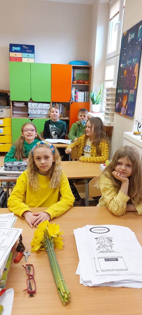 . Po długiej zimie z tęsknotą wyczekujemy tego dnia i jest to duży powód do radości dla wszystkich zmęczonych zimnem i wcześnie zapadającym mrokiem. W tym roku, mimo iż pogoda nie dopisała i wiosna przywitała nas deszczem, dzieci z klas 1-3 uczciły jej przybycie ubrane w zielone i żółte barwy ![]()