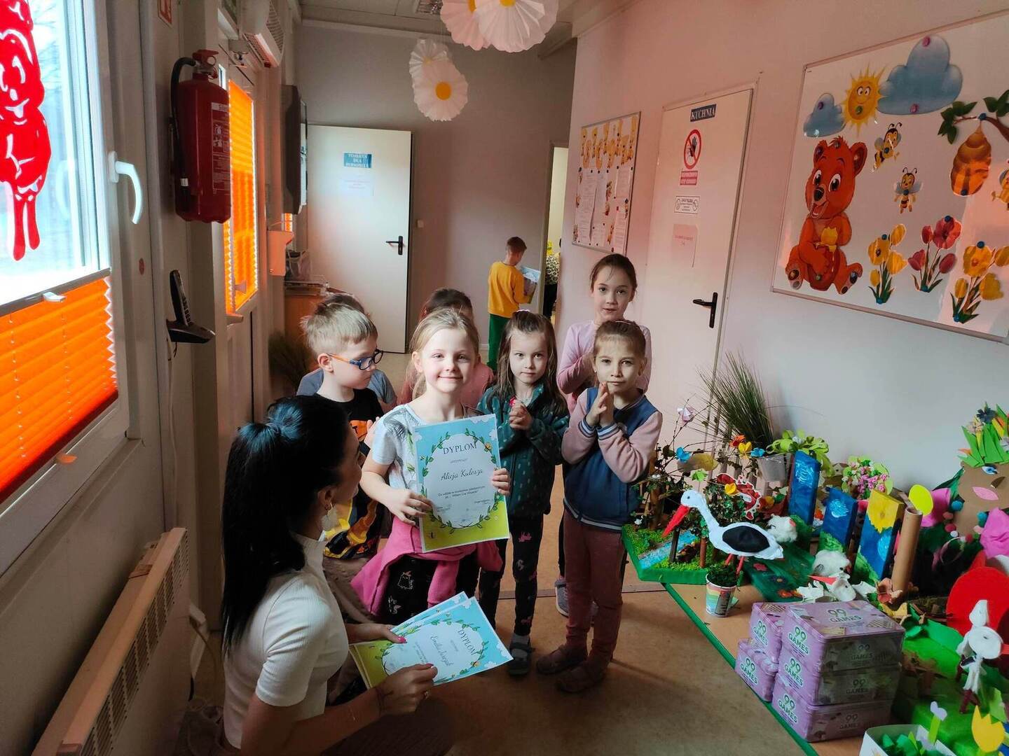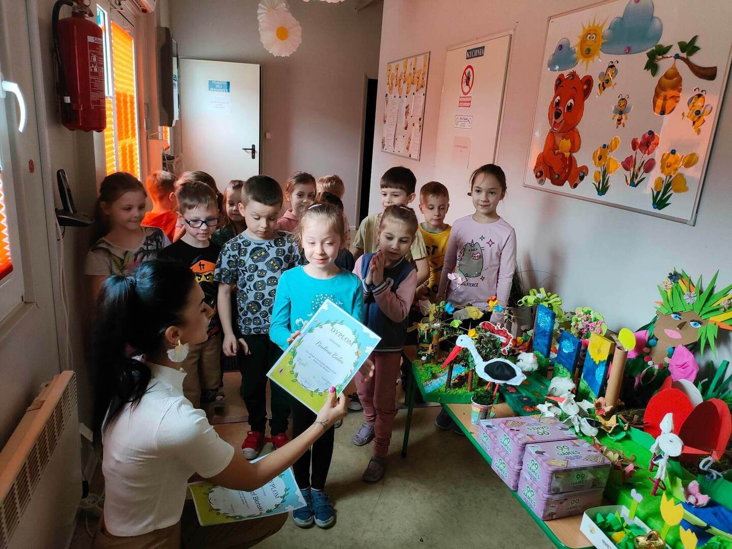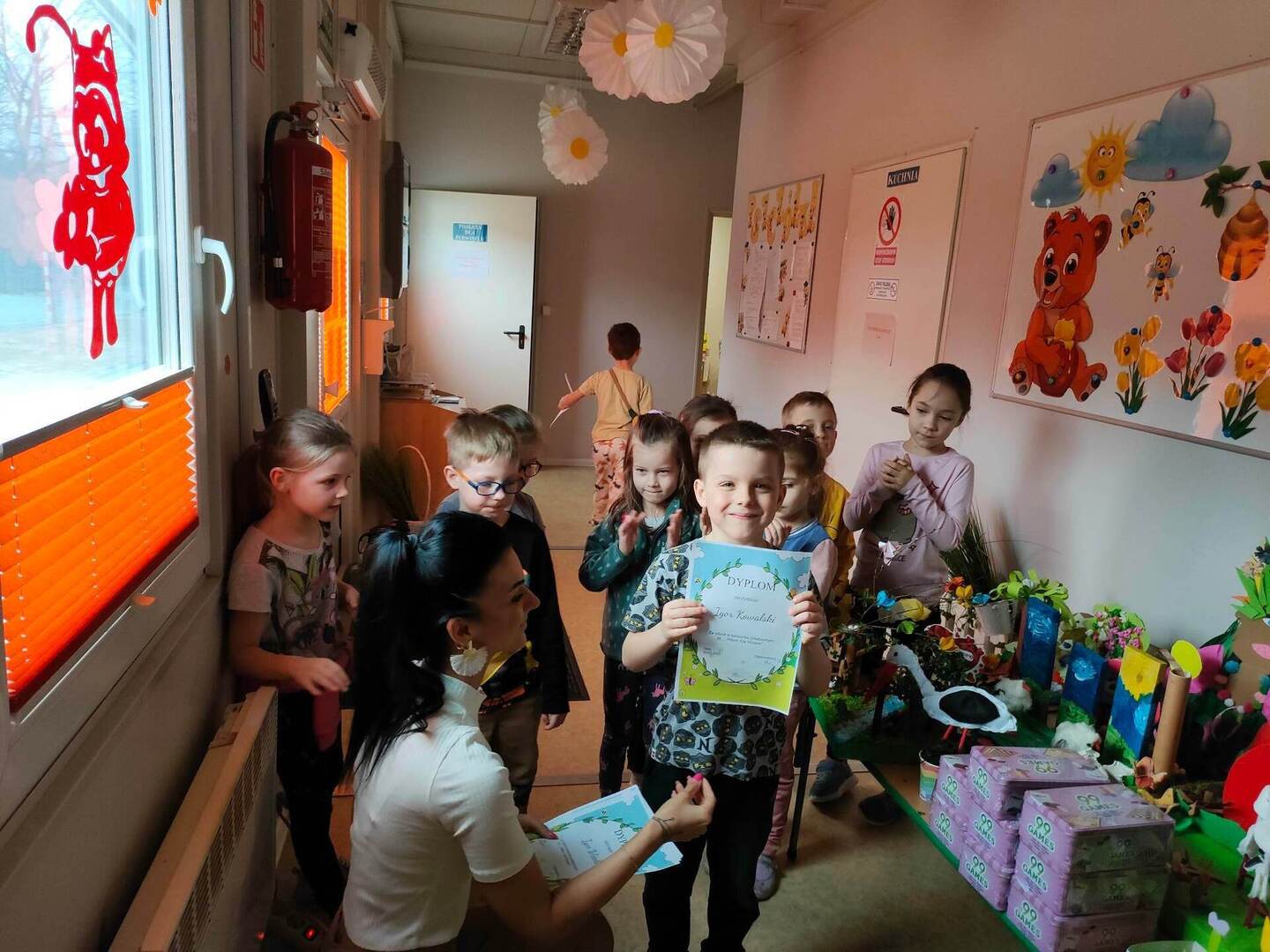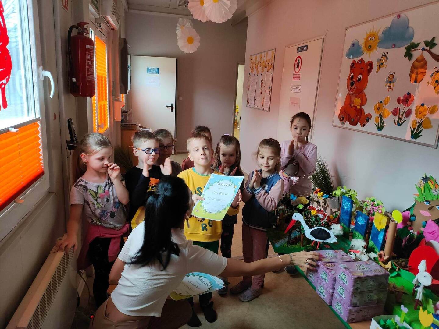 W naszym przedszkolu, każdy maluch wie jak wygląda wiosna i jakie są jej oznaki. Dowodem na to, są przepiękne prace plastyczne w ramach konkursu "Witam Cię Wiosno" wykonane przez grupę "Pszczółki" oraz "Misie". Konkurs już rozstrzygnięty, wyłonienie zwycięzcy było trudne, dlatego wszystkie dzieci zostały nagrodzone dyplomem oraz zabawką! Gratulujemy małym artystom! ![]()