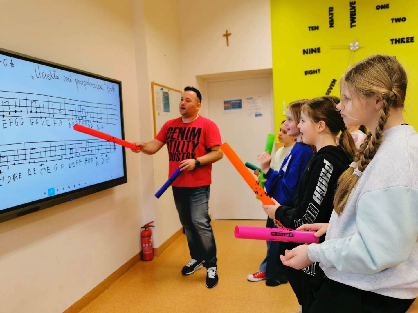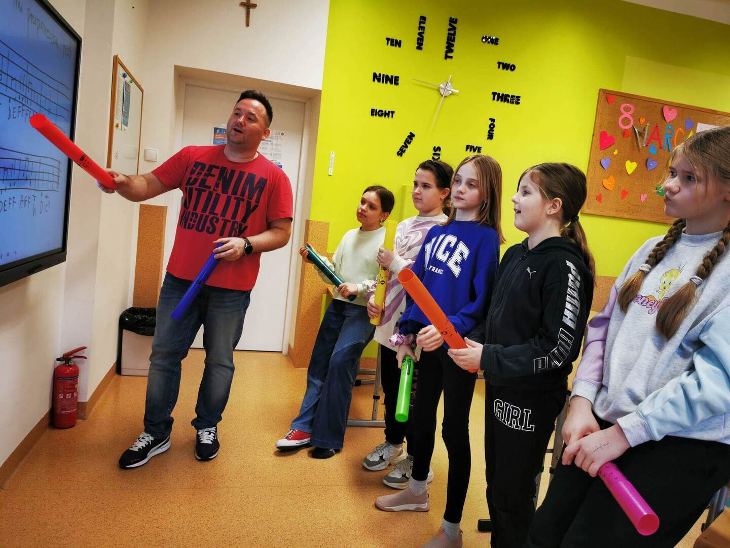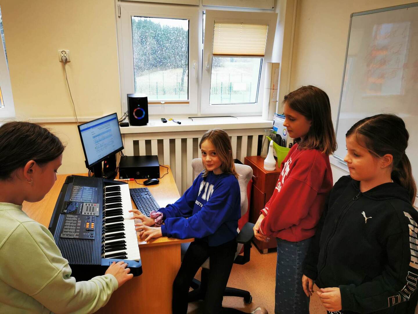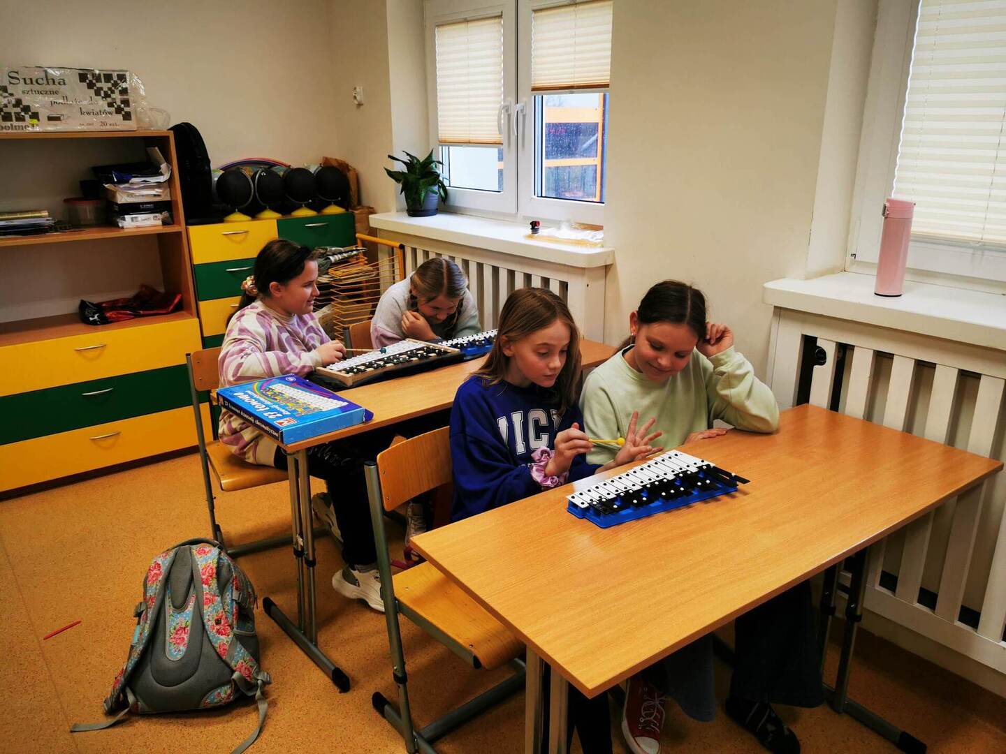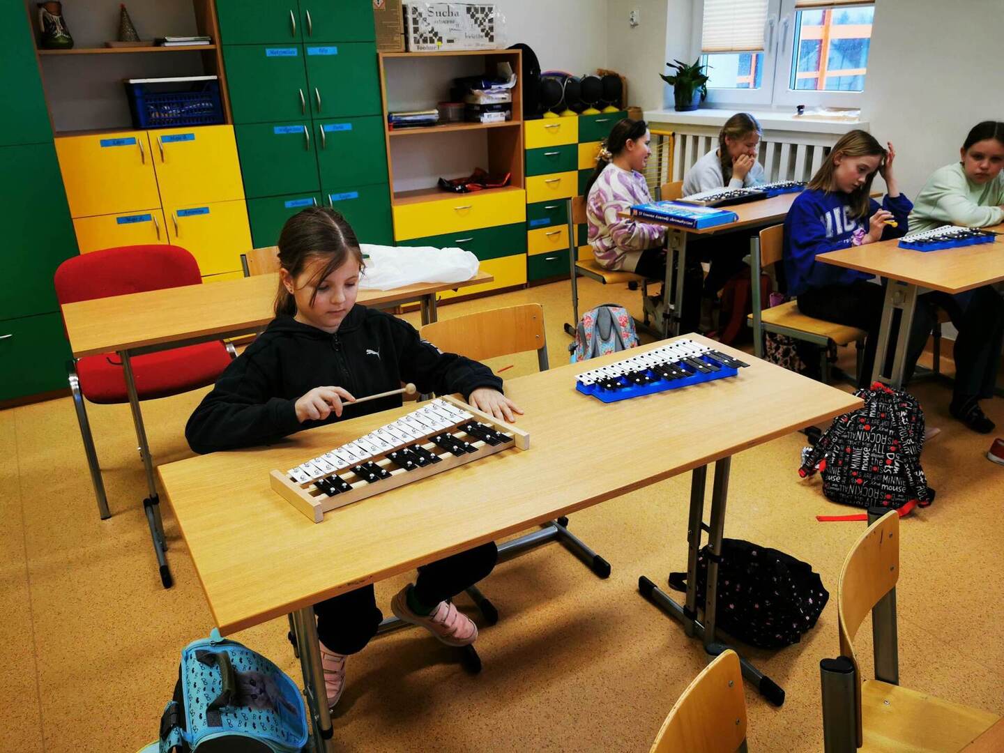 Podczas dodatkowych zajęć muzycznych dzieci mają możliwość rozwijania swoich zdolności i zainteresowań muzycznych poprzez: grę na instrumentach muzycznych oraz śpiew.