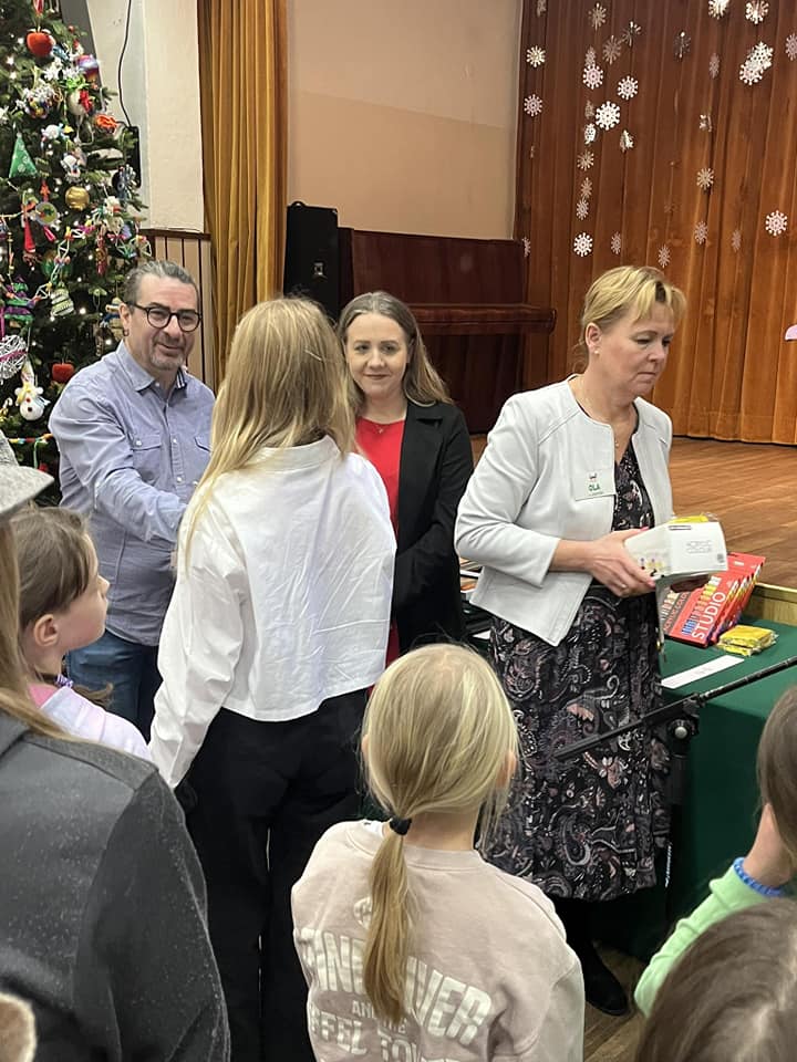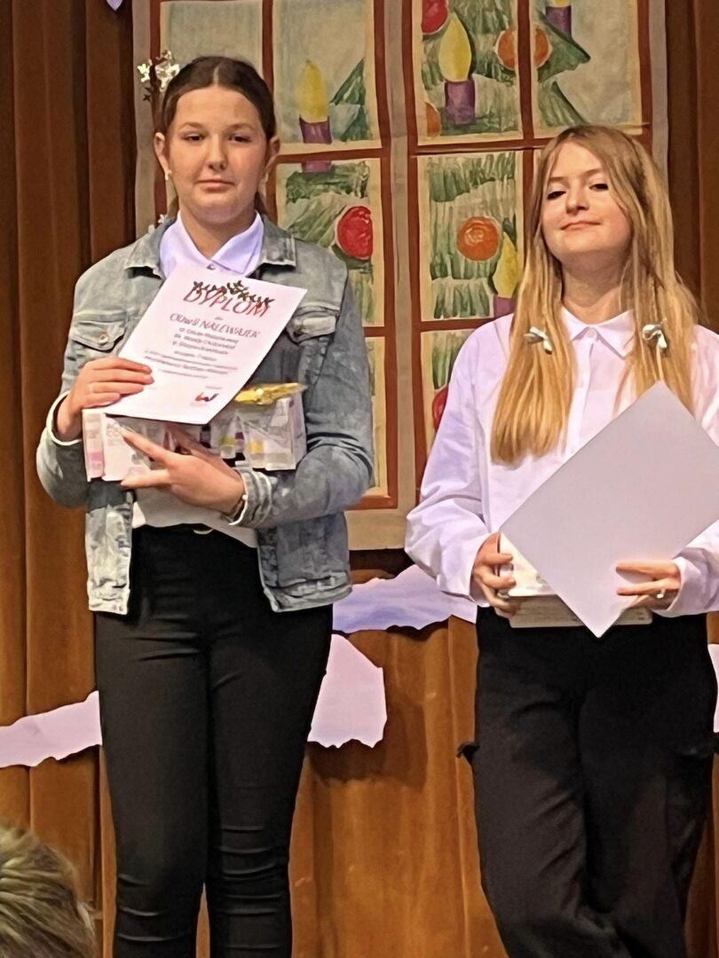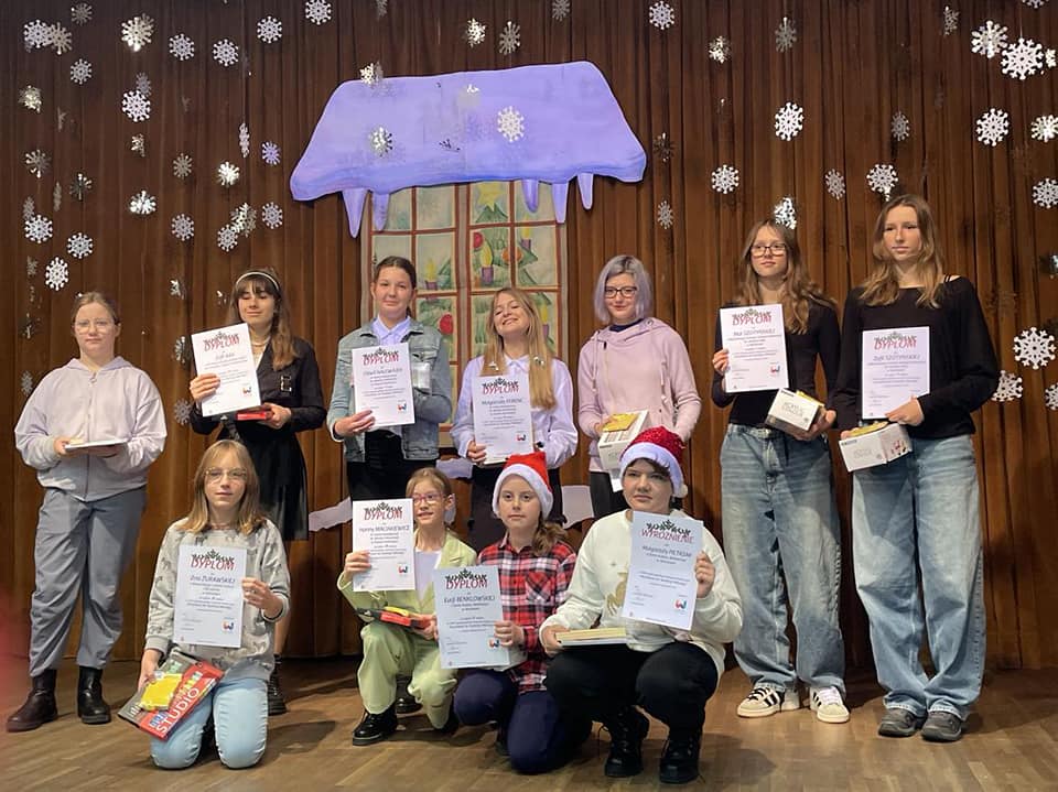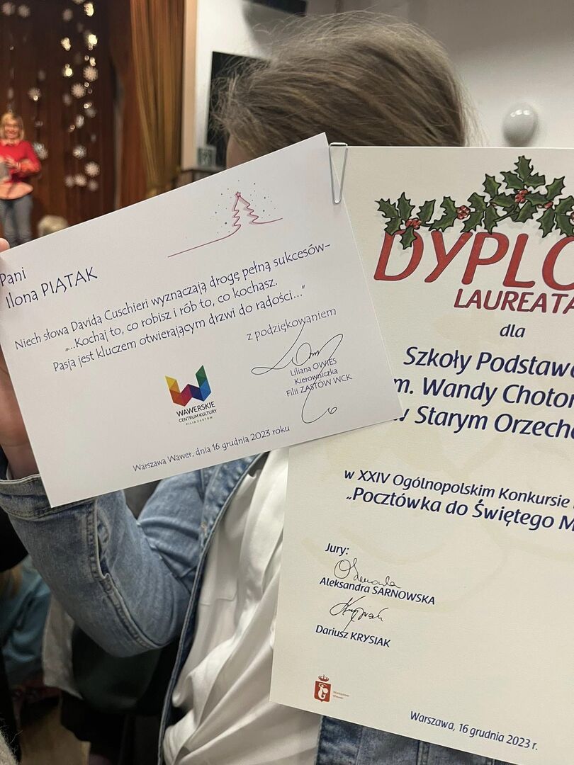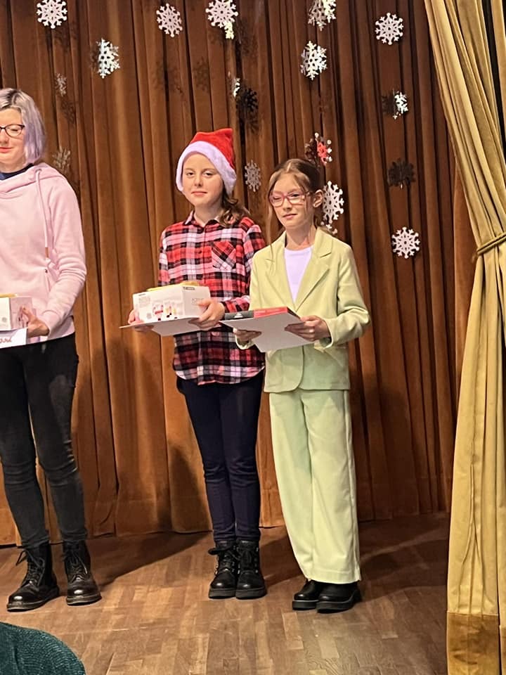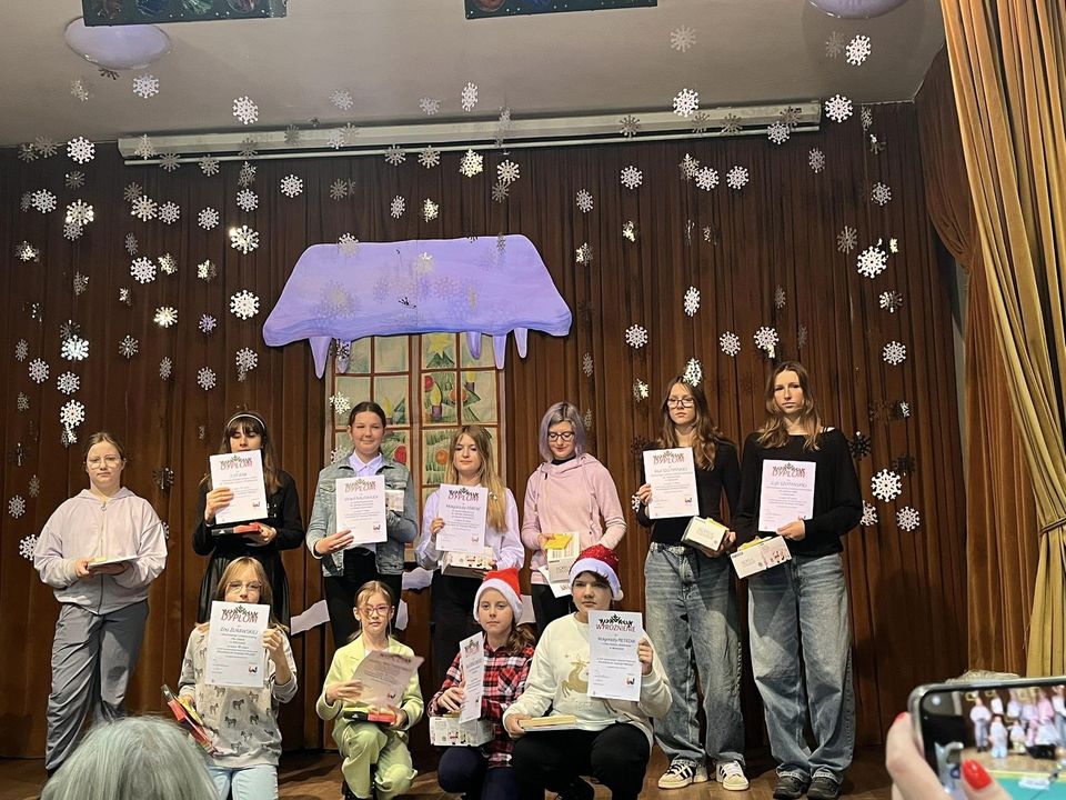 Kochani, prawie na żywo przekazujemy Wam fotograficzną relacje z Warszawy, z gali wręczenia nagród z Ogólnopolskiego Konkursu Plastycznego "Pocztówka do Świętego Mikołaja". Niedawno przekazaliśmy Wam informacje o naszych sukcesach a dziś nasze zdolne plastyczki odbierają nagrody. Tak prezentują się na scenie pośród innych zwycięzców.