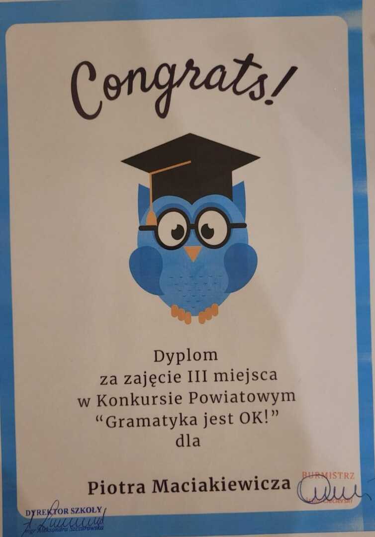 Śpieszymy do Państwa z ważną informacją dot. dokonań Naszych uczniów! Niezmiernie Nam miło przekazać Państwu, że Piotr M., uczeń klasy IV zdobył 3 miejsce w kat. klas IV w Powiatowym Konkursie z języka angielskiego „Gramatyka jest OK”. Tym bardziej jesteśmy dumni z Piotra, ponieważ konkurencja była ogromna, a udział w potyczkach gramatycznych wzięło wielu uczniów z całego powiatu Nowodworskiego. Brawo Piter, jesteś mistrzem gramatyki bez dwóch zdań! Serdecznie gratulujemy rodzicom wspaniałego syna!