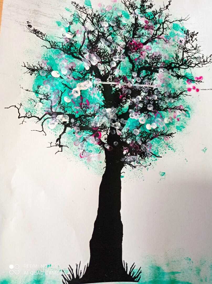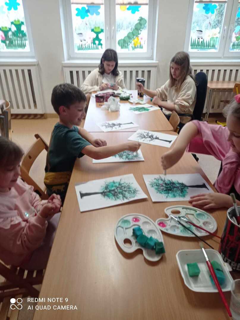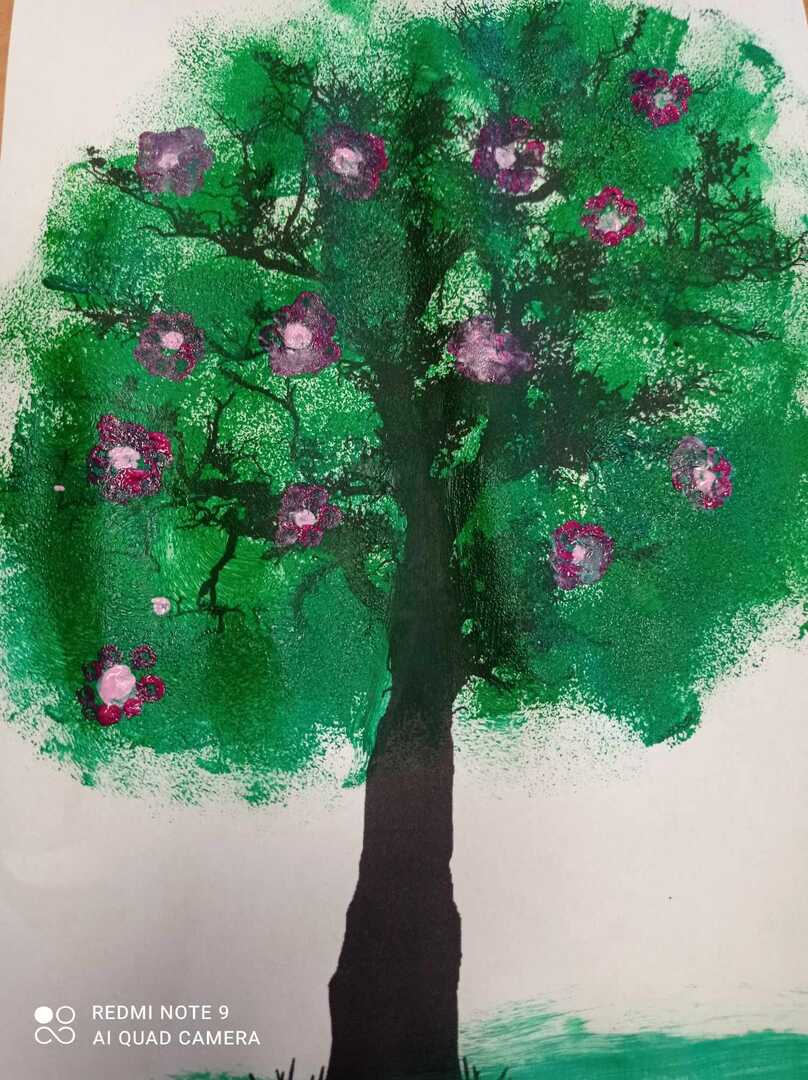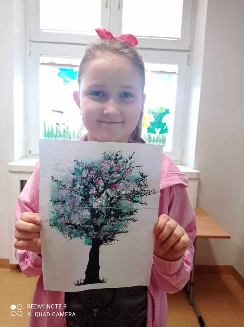 Wiosenne drzewa wykonane gąbką i patyczkami higienicznymi.