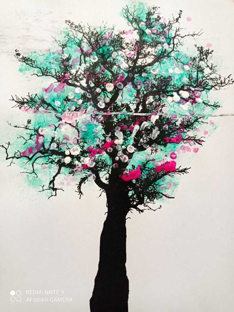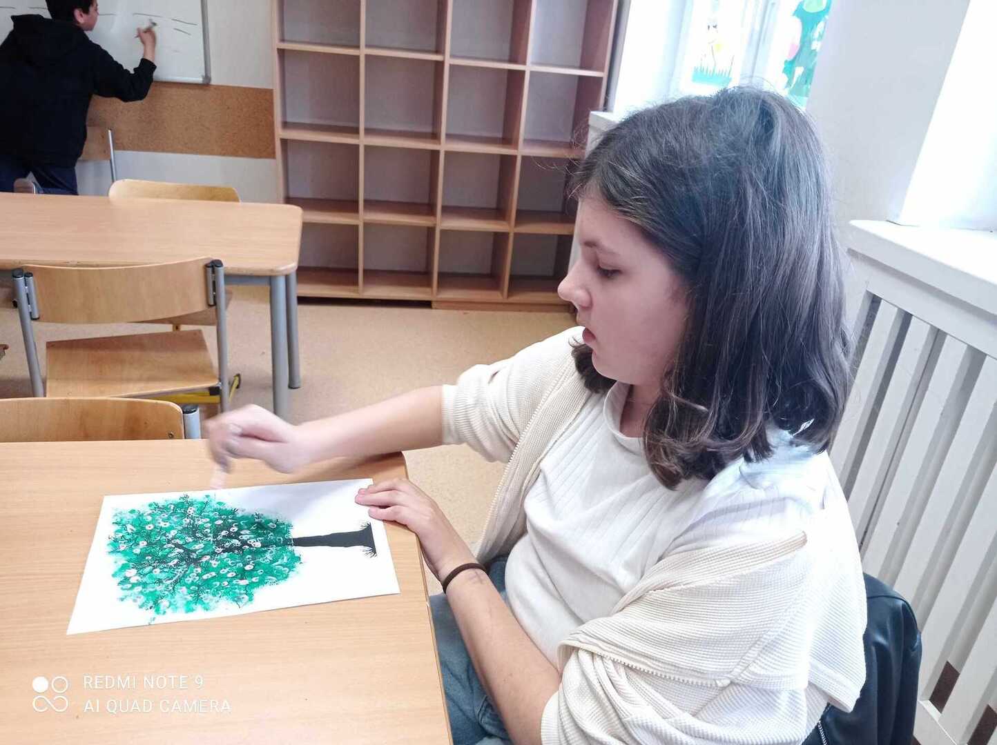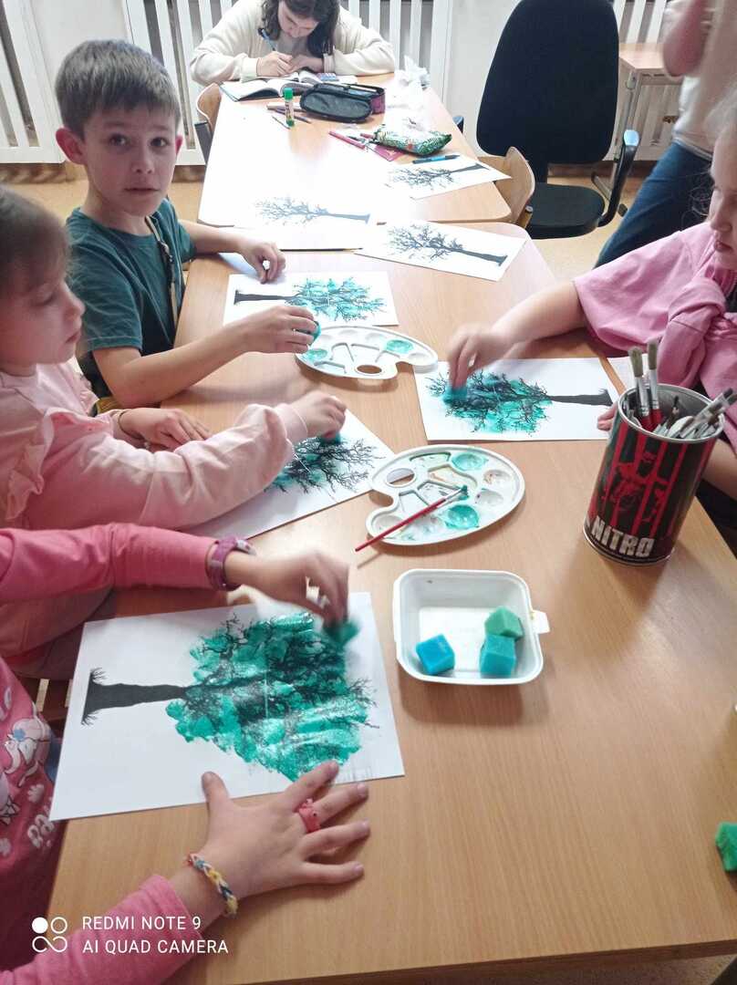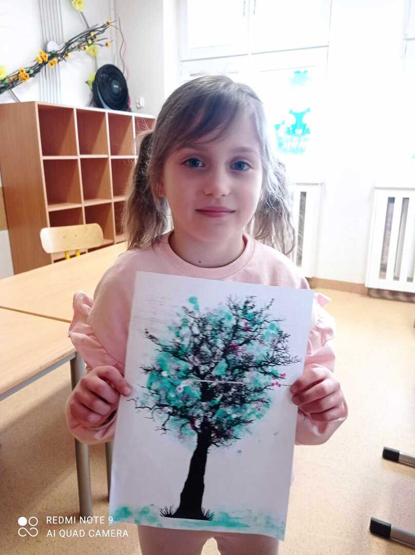 Wiosenne drzewa wykonane gąbką i patyczkami higienicznymi.