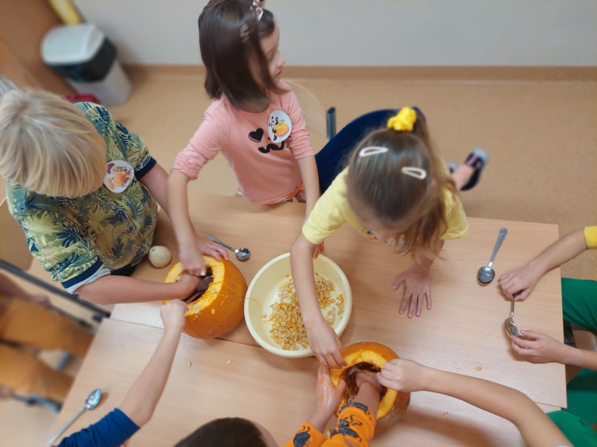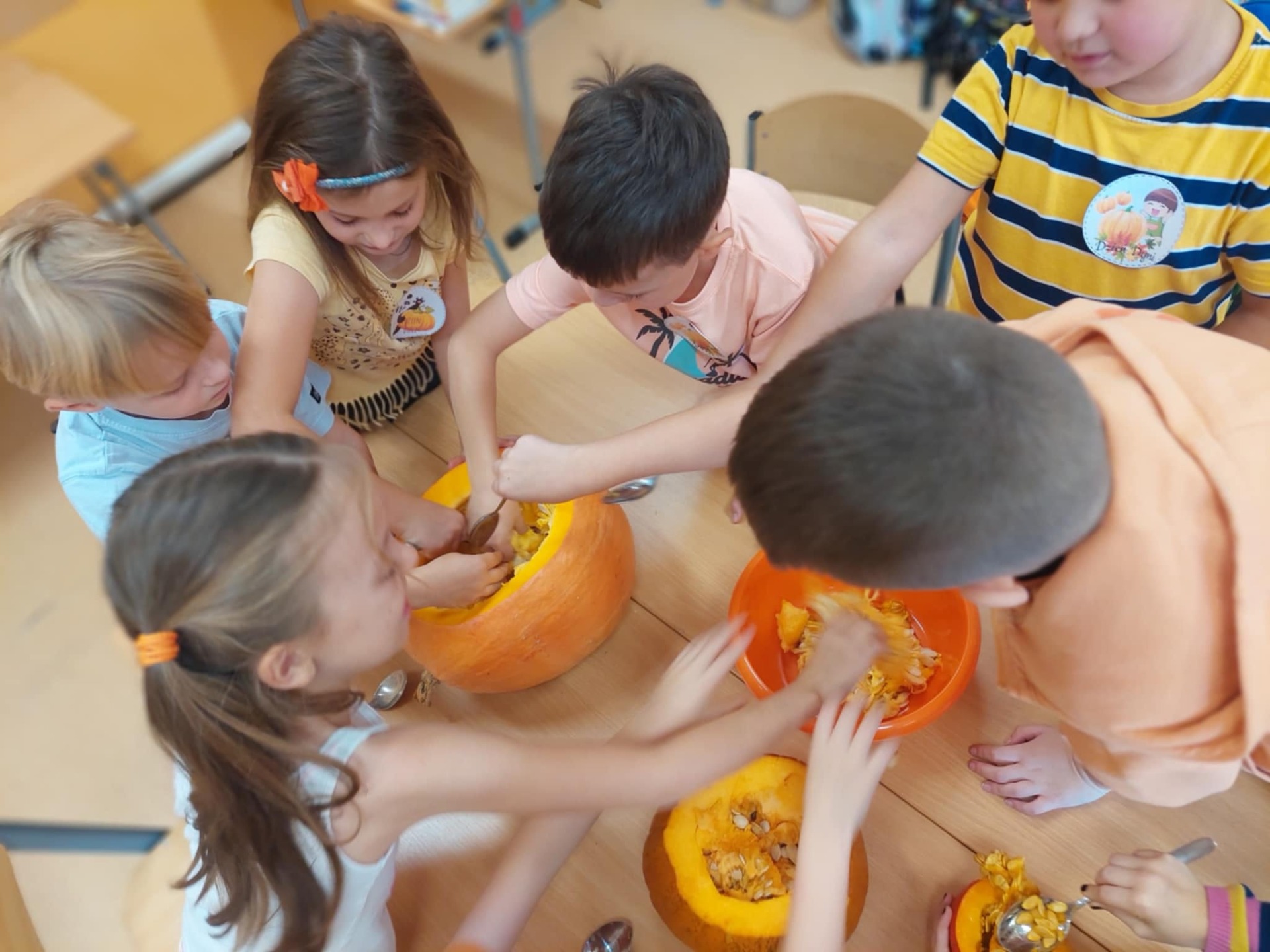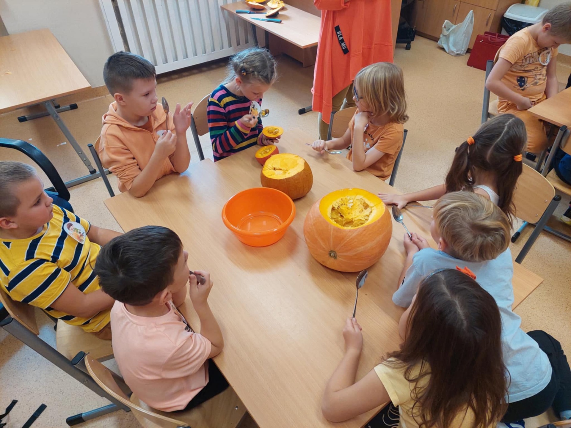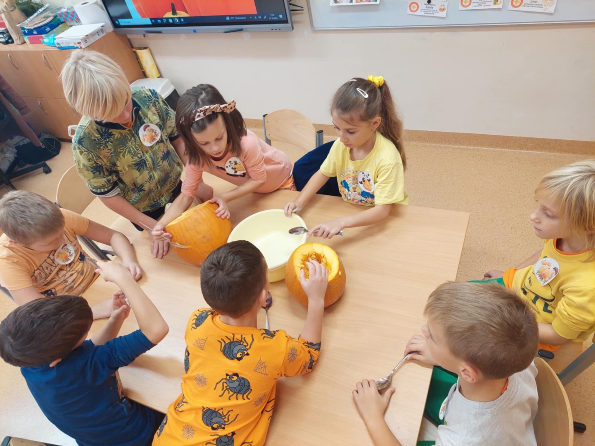 W klasie drugiej zrobiło się dziś pomarańczowo! A to za sprawą Dnia Dyni, która była główną bohaterką dzisiejszego dnia. Uczniowie dokładniej poznali budowę dyni, jej rodzaje oraz ciekawostki na jej temat. Nie zabrakło dyniowego kodowania oraz oczywiście rzeźbienia w dyni 🙂