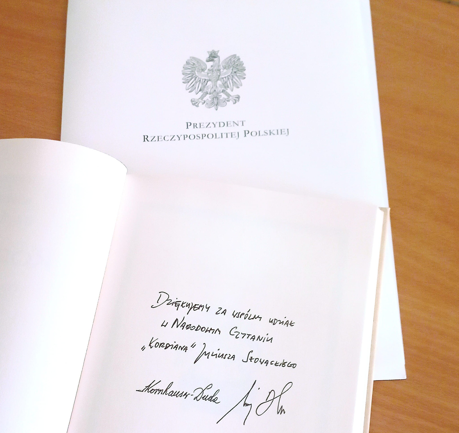 Pamiętacie, jak 12 września nasza szkoła wzięła udział w kolejnej edycji Narodowego Czytania? W tym roku nasi uczniowie i nauczyciele zmierzyli się z dziełem J. Słowackiego " Kordian". Za udział w akcji otrzymaliśmy oficjalne podziękowania od Prezydenta RP Andrzeja Dudy oraz egzemplarz " Kordiana" z dedykacją od pierwszej damy!