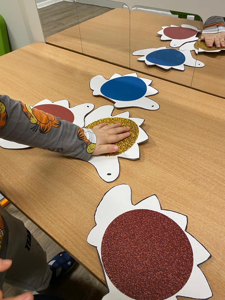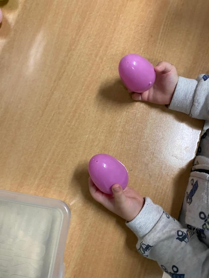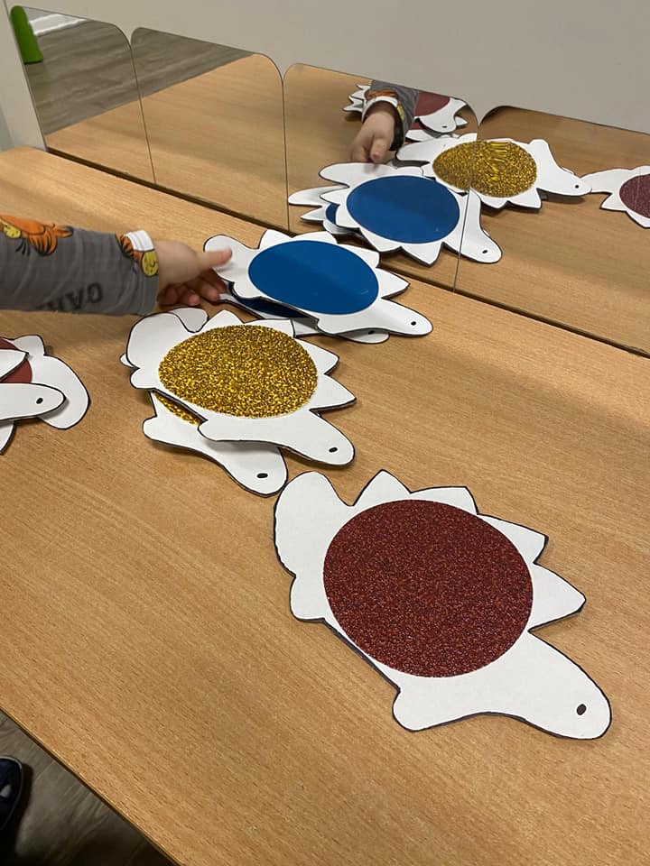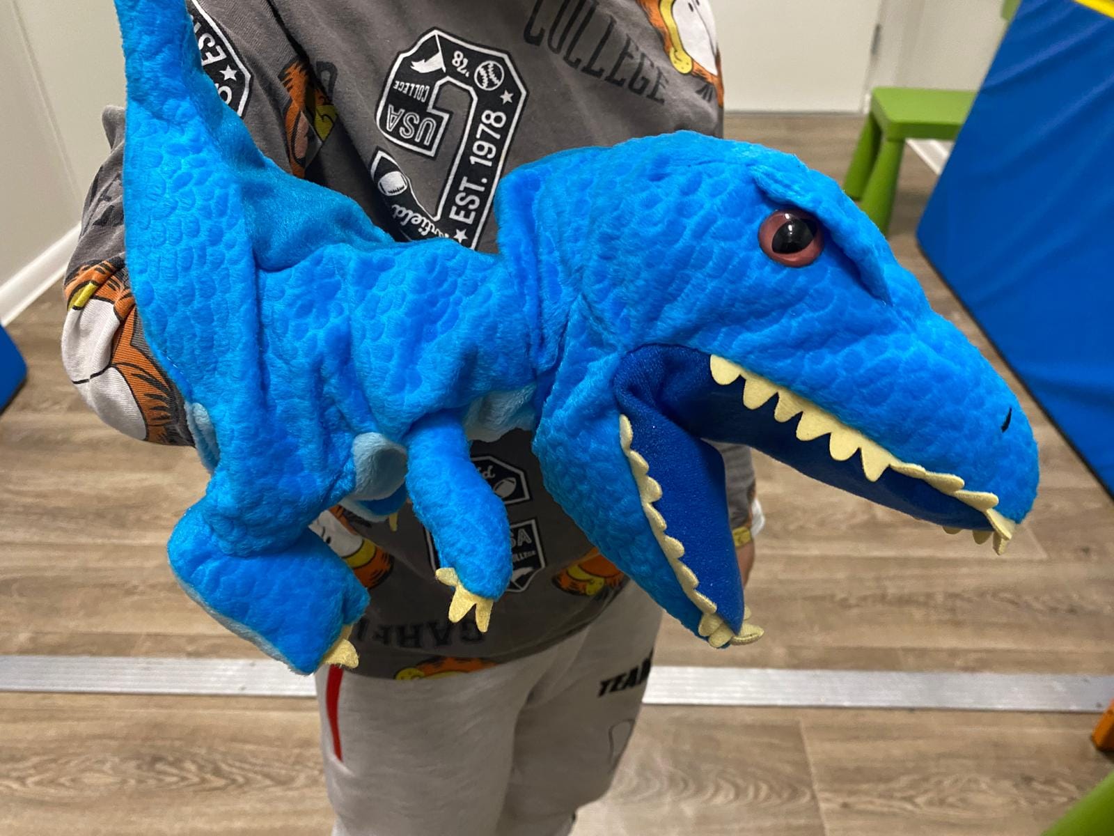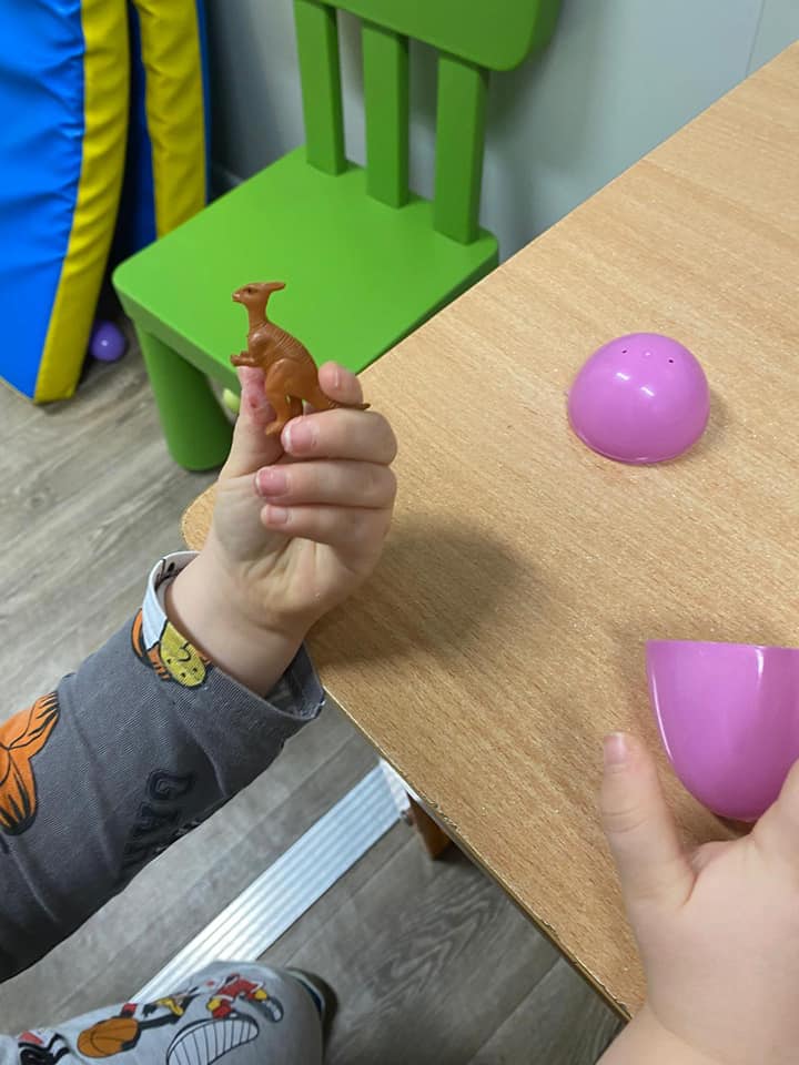 Dinozaury pomagały dziś przedszkolakom ćwiczyć język i buzię, nazywać kolory, liczyć. Grały z nimi na grzechotkach, uważnie patrząc na ułożony rytm śpiewały samogłoski, powtarzały sylaby. Dzieci szukały ukrytych jajek, dobierały je w pary i sprawdzały co jest w środku. Odkrywały też dinozaury ukryte w piasku!