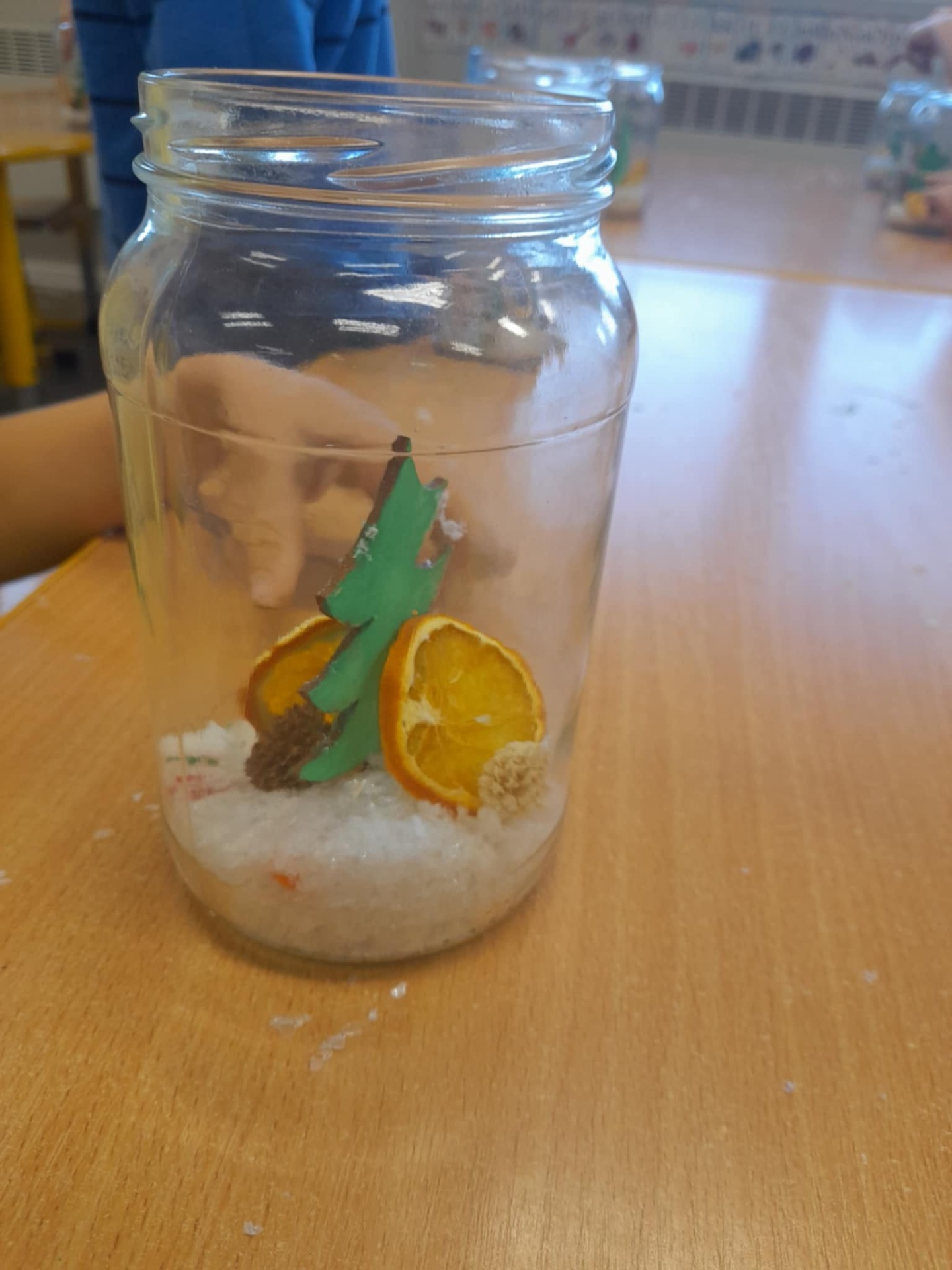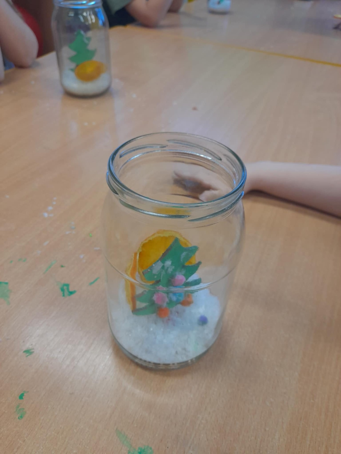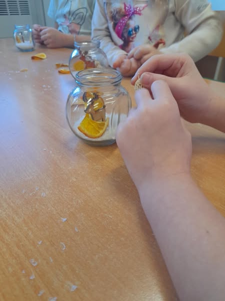 W naszym przedszkolu odbyły się magiczne warsztaty świąteczne, podczas których dzieci własnoręcznie przygotowywały wyjątkowe lampiony, W wykorzystując słoiki oraz naturalne materiały, takie jak gałązki choinkowe, suszona cytryna i drewniane ozdoby w kształcie choinek. Przedszkolaki stworzyły małe dzieła sztuki!