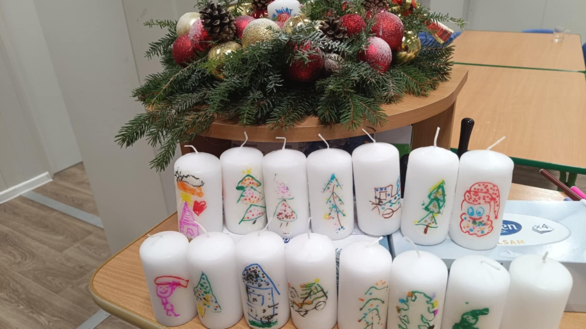 Grupa maluszków z wielkim zapałem i sercem przygotowała dla Państwa te piękne świece na których zostały umieszczone własnoręcznie namalowne przez dzieci obrazki w klimacie świąt. Każda świeczka jest wyjątkowa, jedyna w swoim rodzaju. Serdecznie zapraszamy na II Pomiechowski Jarmark Bożonarodzeniowy. Zachęcamy przyjdźcie i kupcie świeczkę, która rozświetli Wasze święta. Gwarantujemy, że każda świeczka niesie za sobą kawałek dziecięcej radości i świątecznego ciepła ☺️