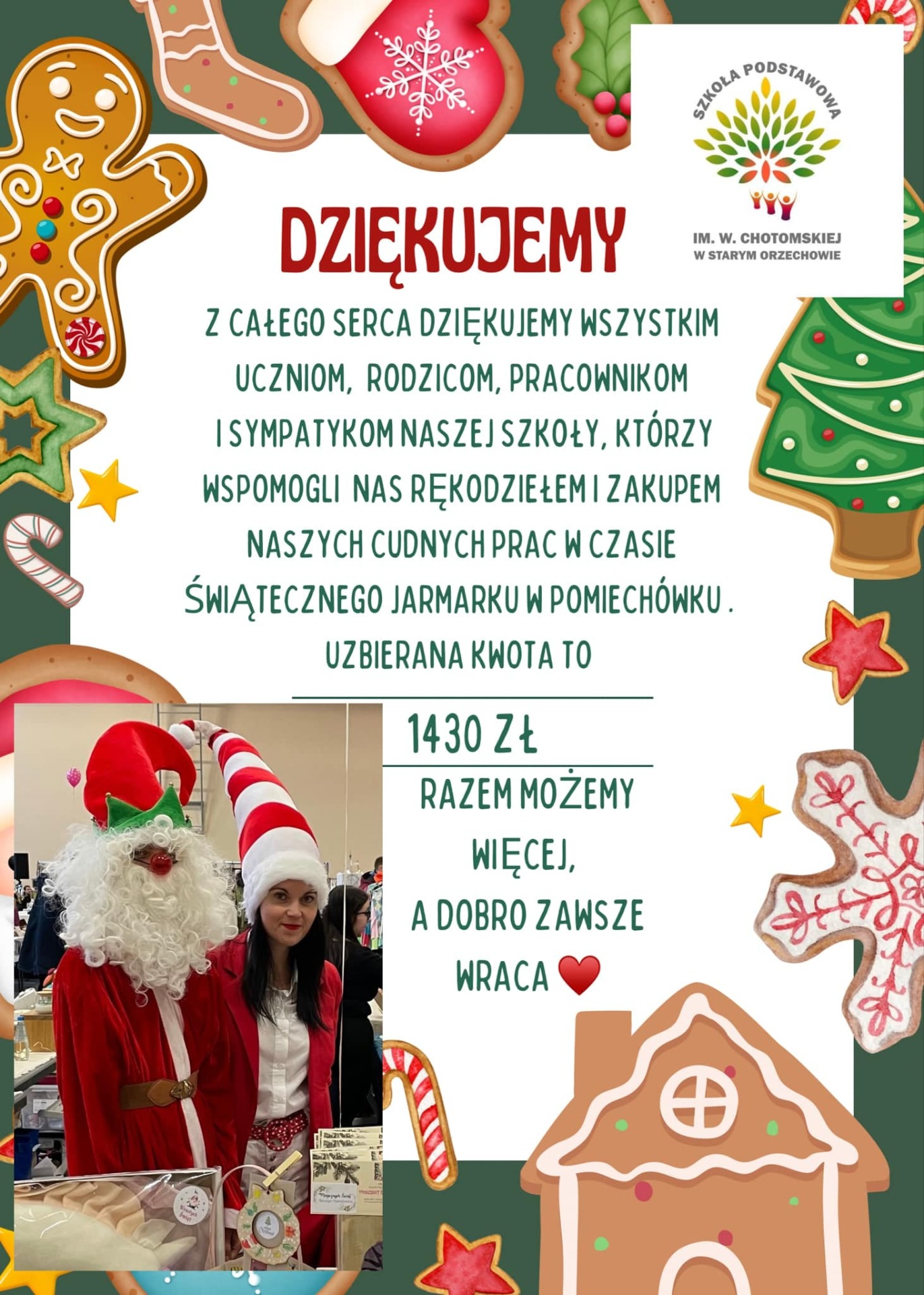 II Jarmark Bożonarodzeniowy w Pomiechówku dobiegł końca. Serdecznie dziękujemy wszystkim którzy odwiedzili dziś nasze stoisko i tym samym wsparli naszą szkołę. Dziękujemy p. Kasi Książyk, nauczycielce naszej szkoły za ogrom pracy włożony w przygotowanie i obsługę stoiska. Kasiu, jesteś wielka! Do zobaczenia za rok!