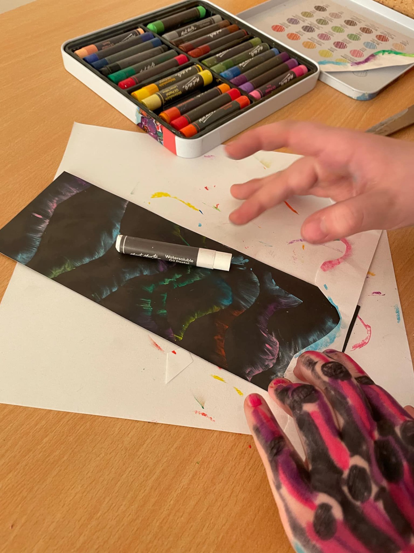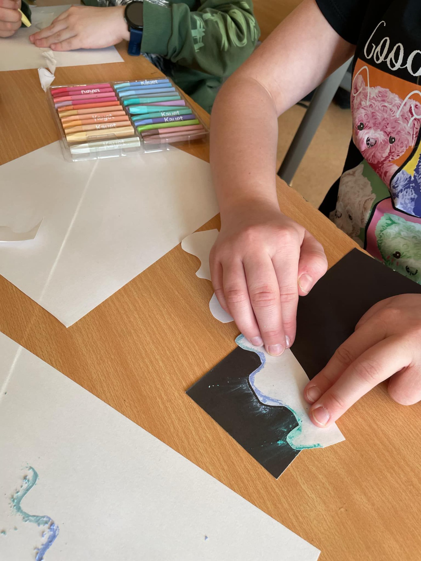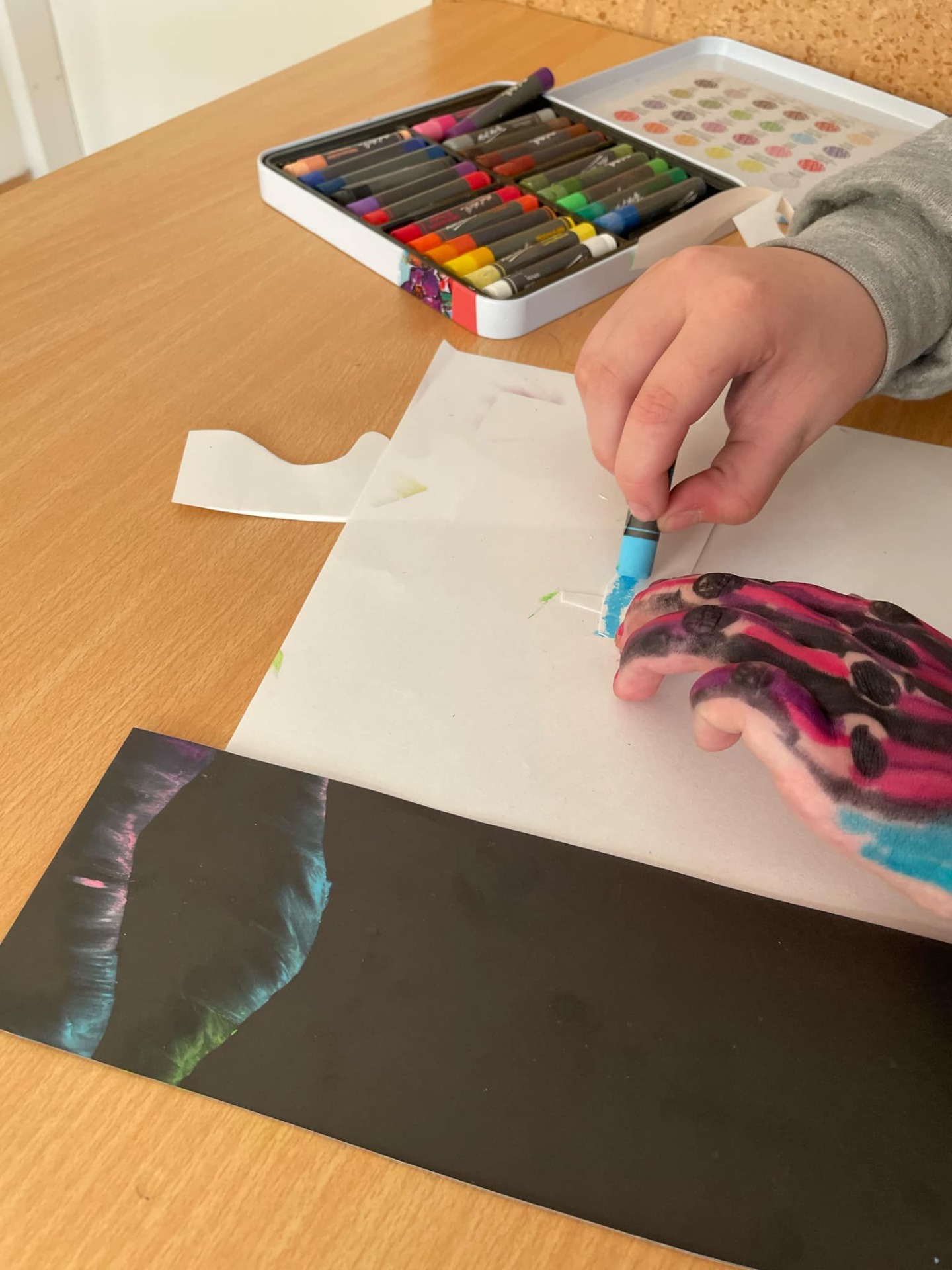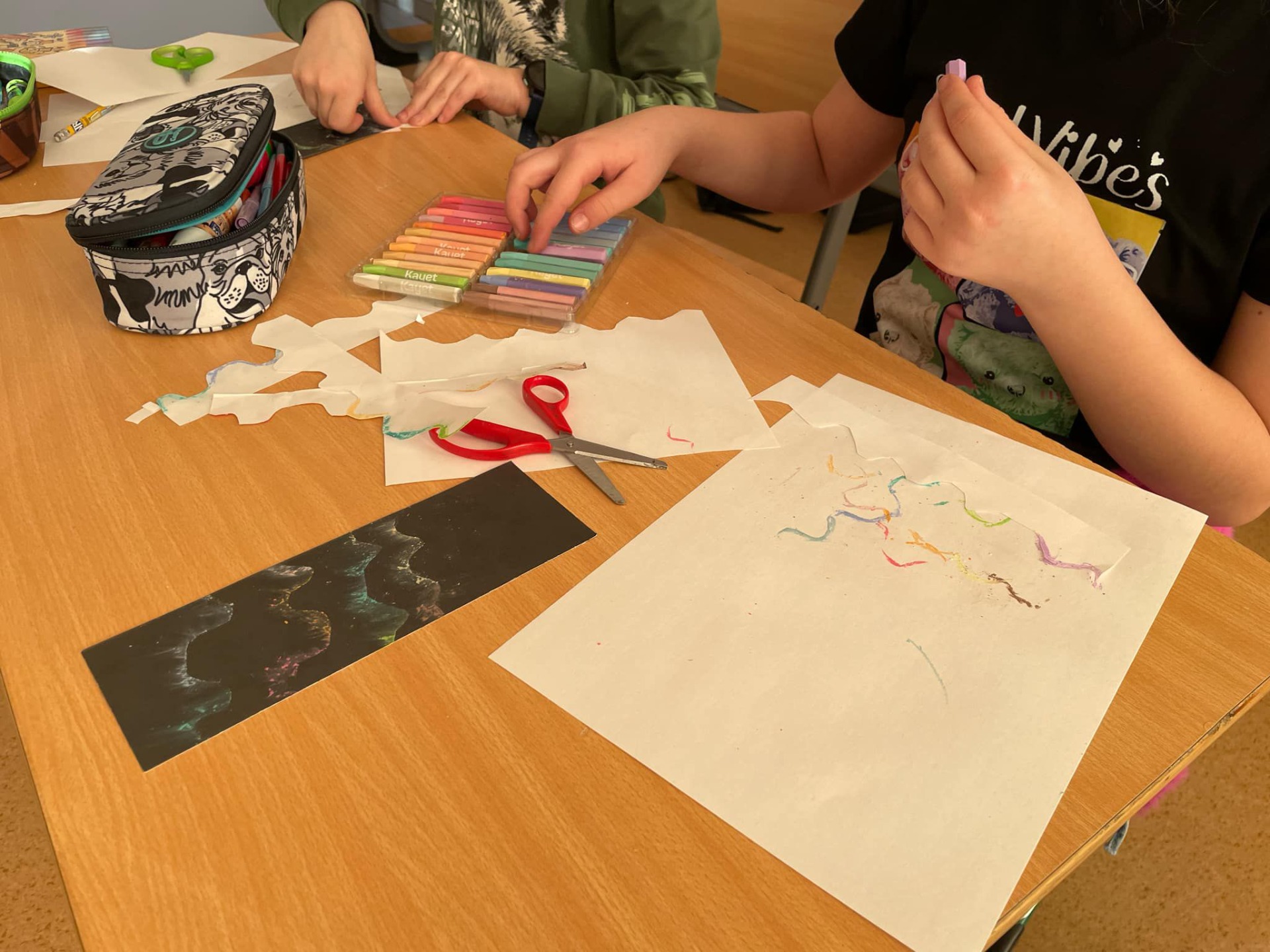 Dziś na zajęciach plastycznych w klasach młodszych uczniowie po raz pierwszy poznali technikę pracy z pastelami olejnymi i wykonali zorzę polarną 😊