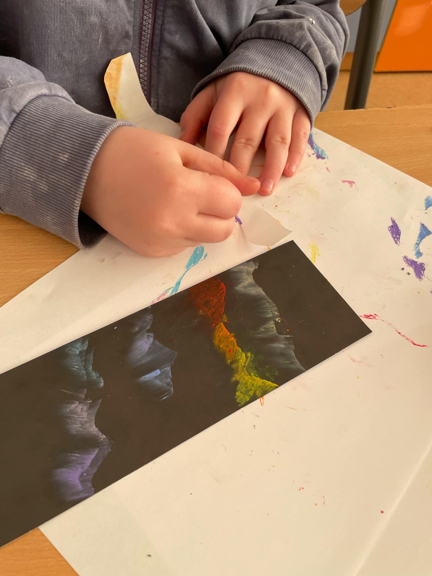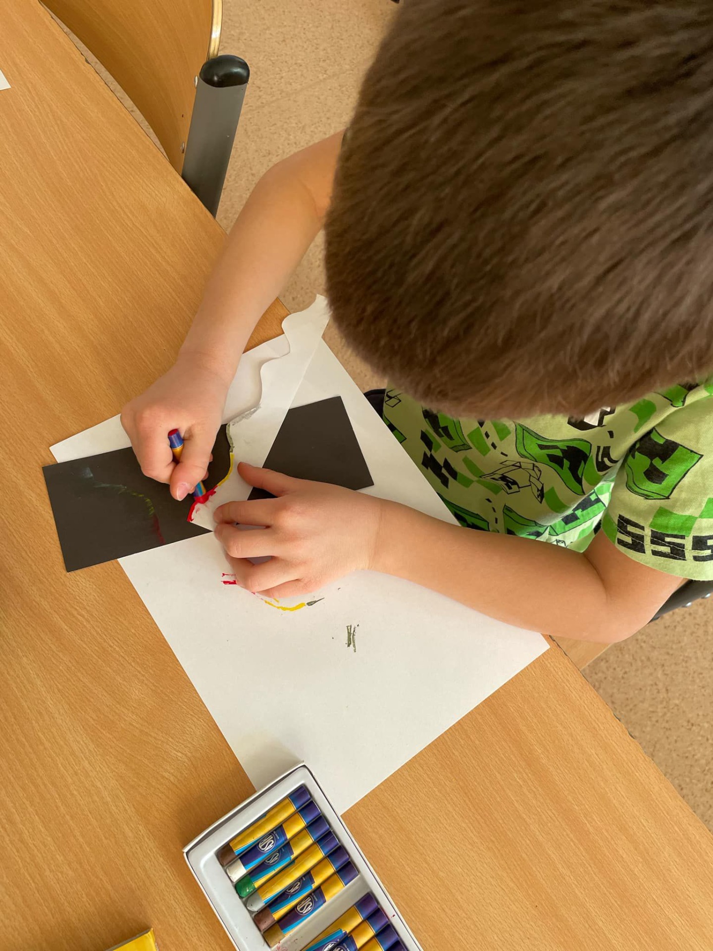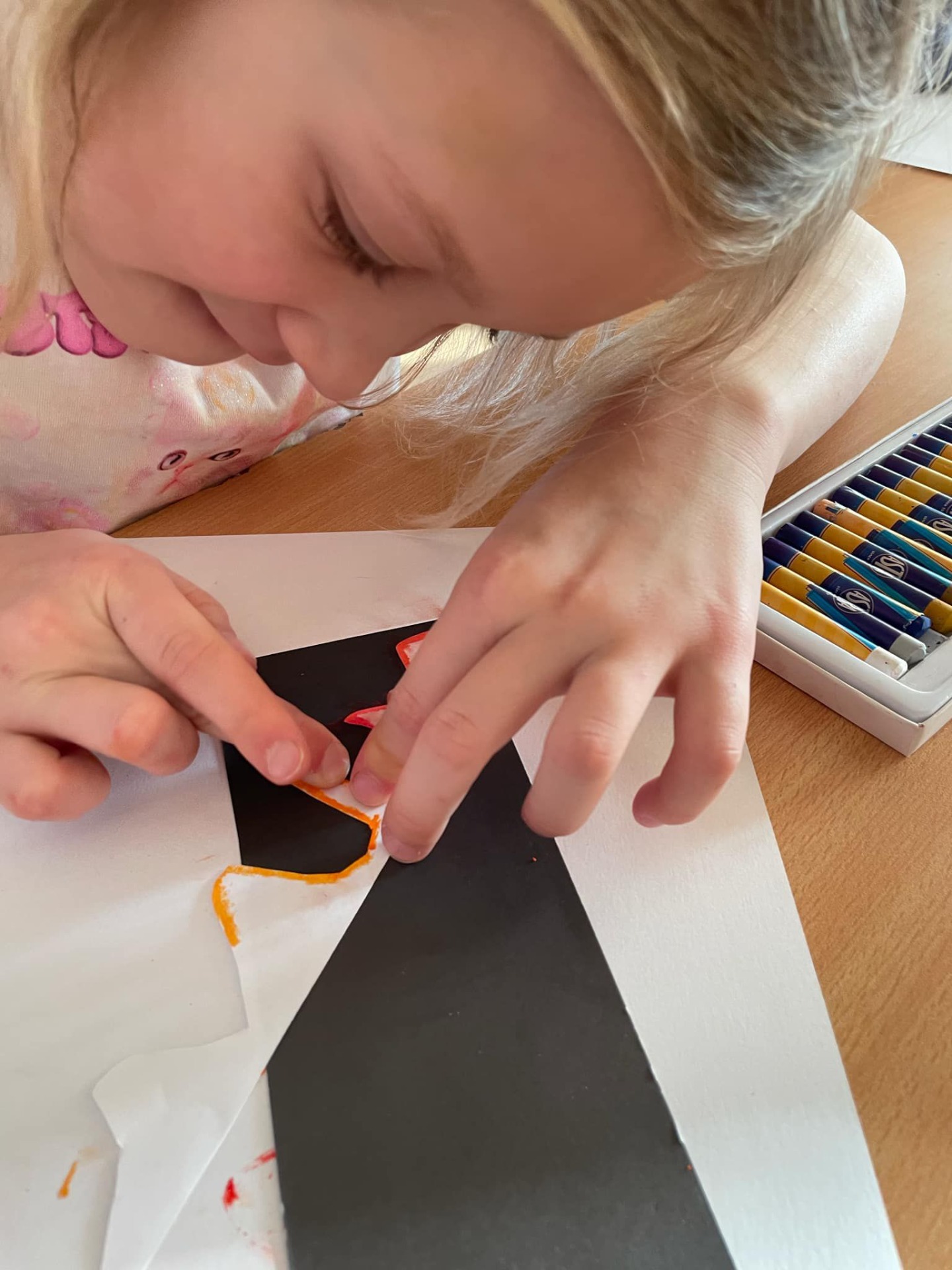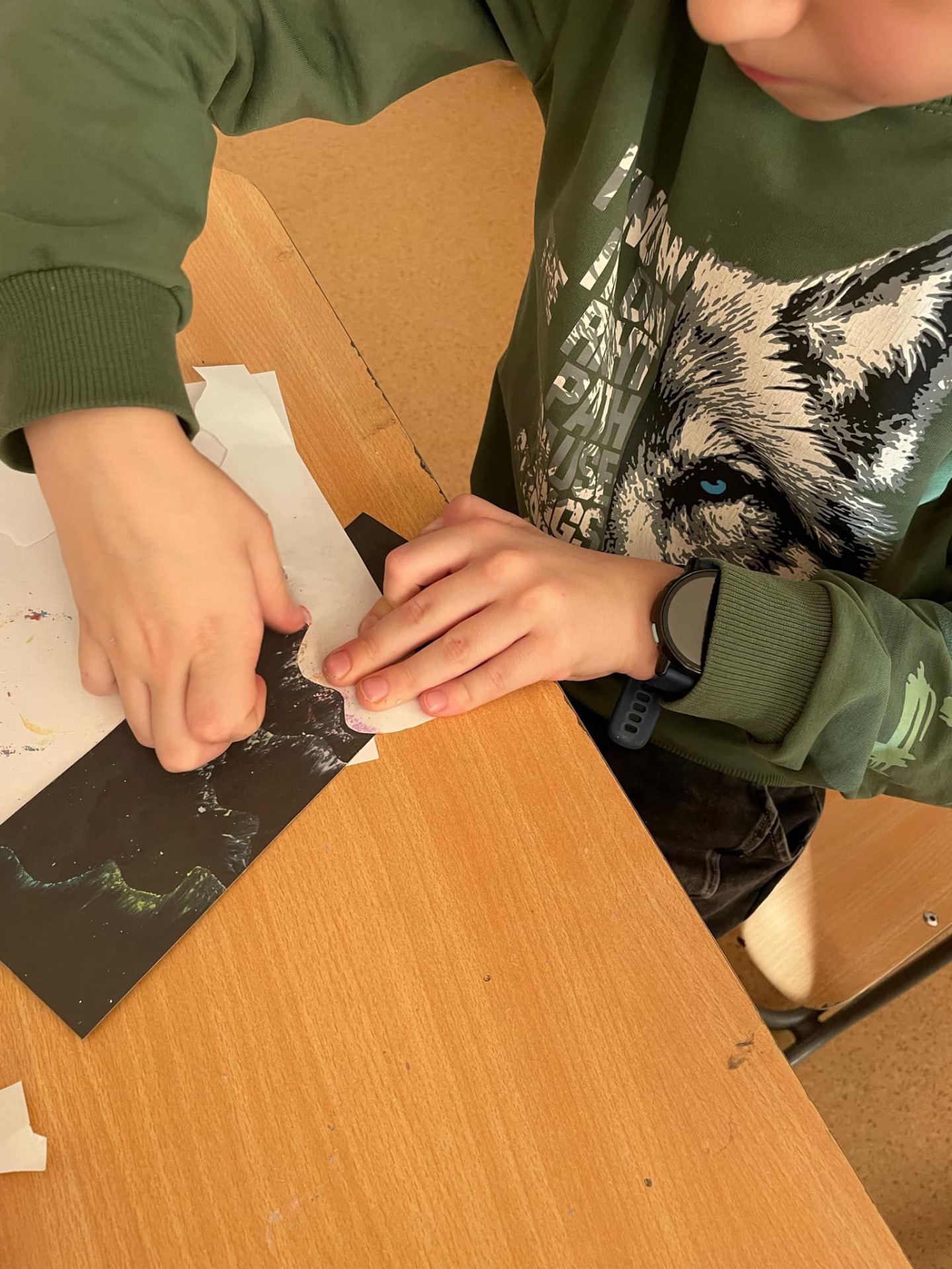 Dziś na zajęciach plastycznych w klasach młodszych uczniowie po raz pierwszy poznali technikę pracy z pastelami olejnymi i wykonali zorzę polarną 😊