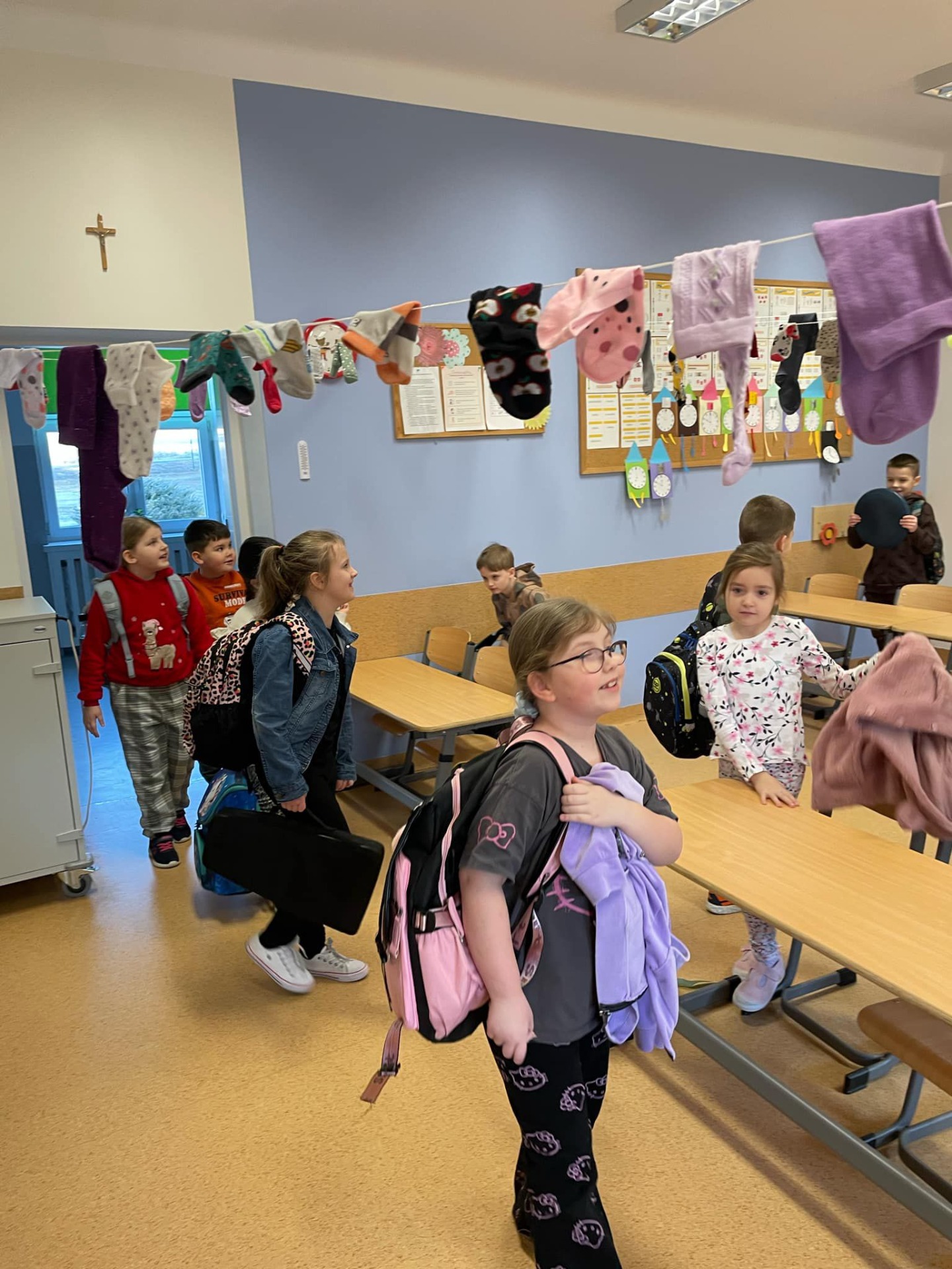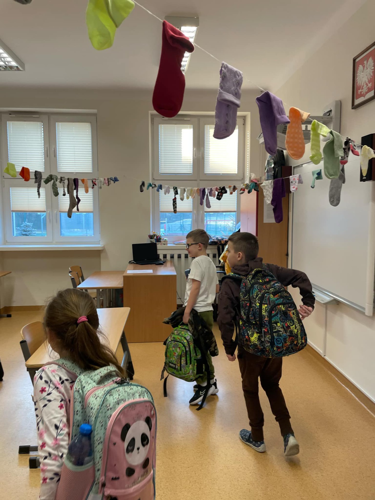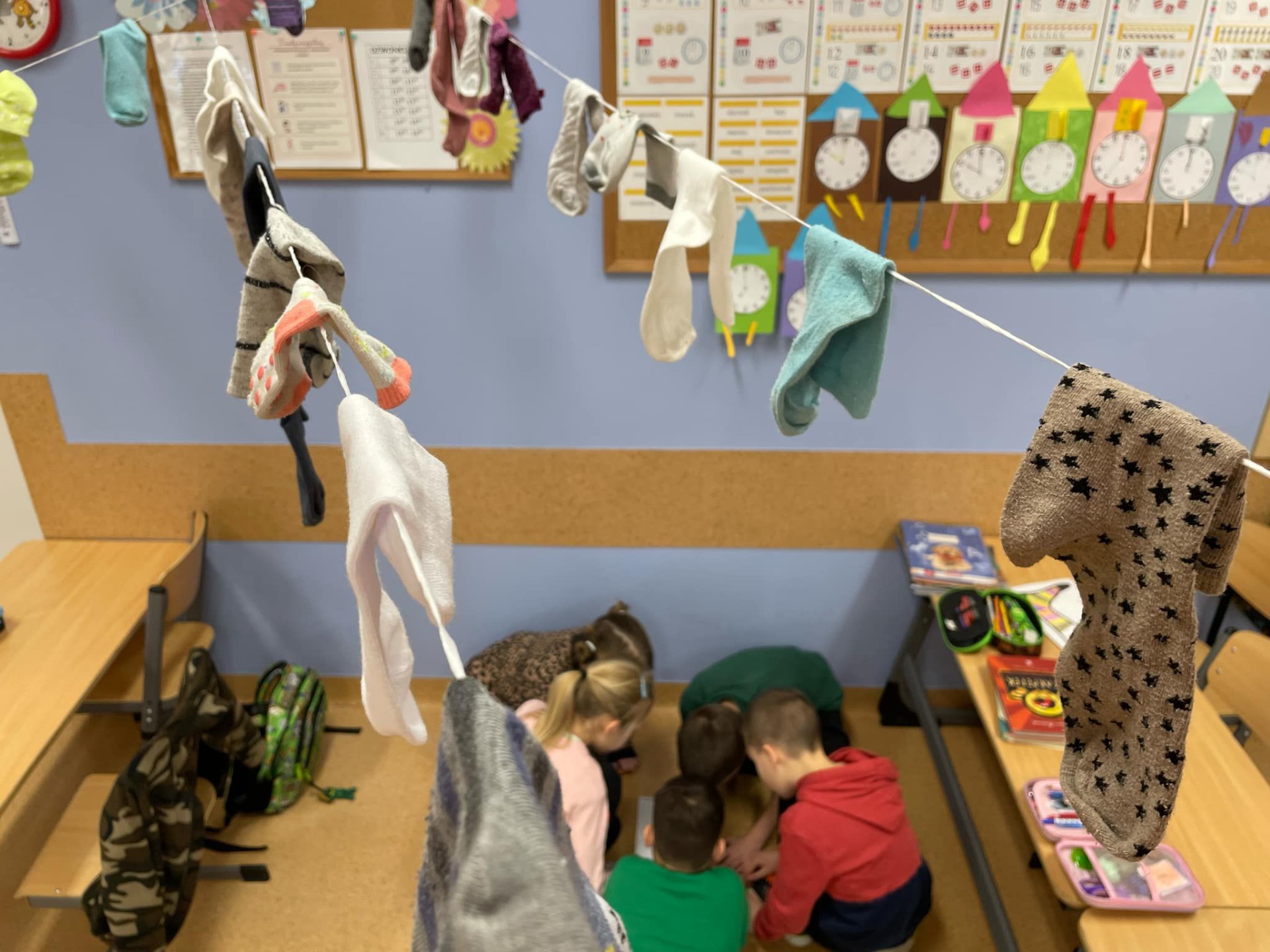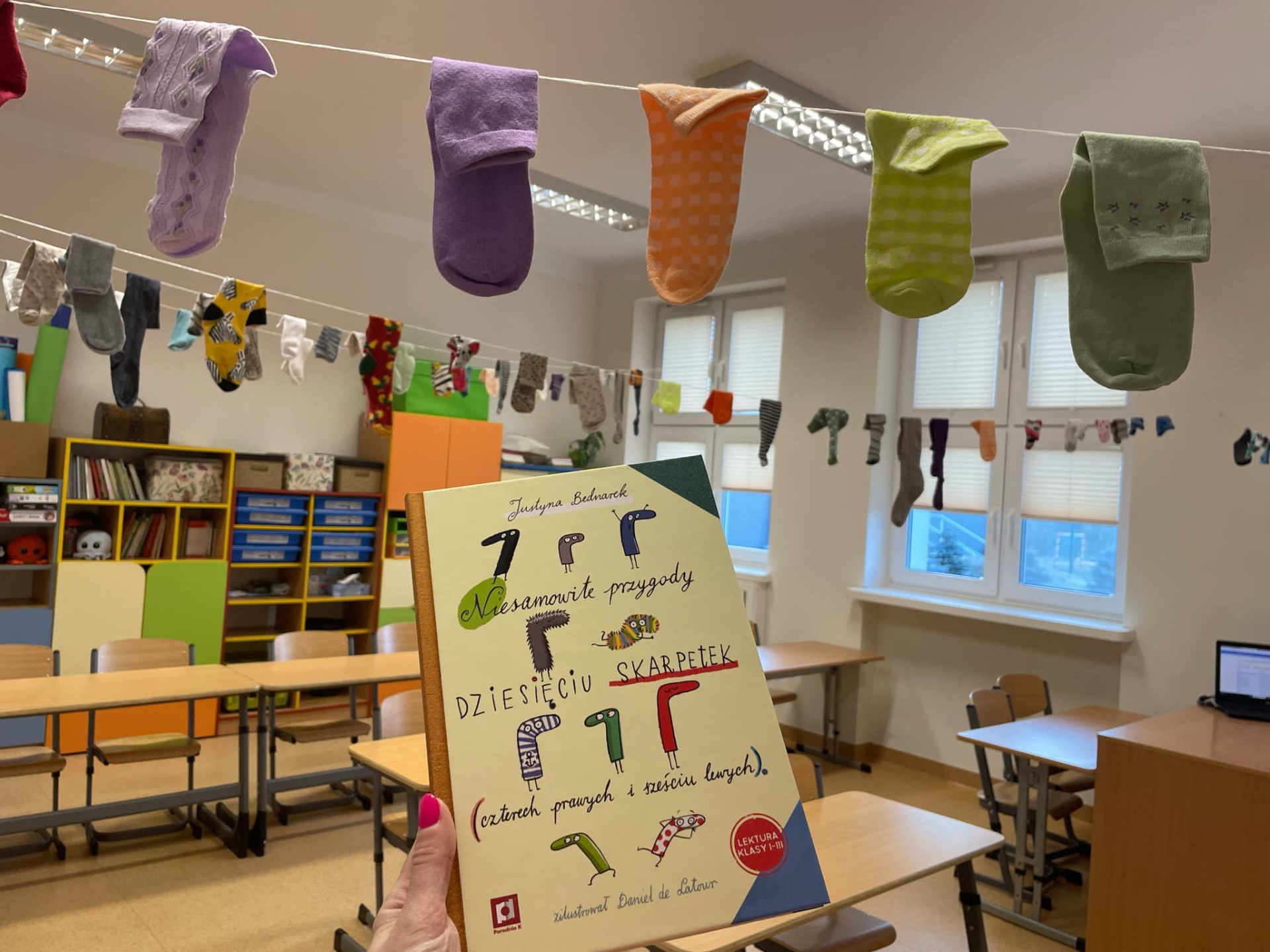 Po feriach klasa I rozpoczęła prace z lekturą w bardzo kreatywny sposób! Poniedziałkowy poranek okazał się dużym zaskoczeniem (po wejściu do klasy oczom uczniów ukazały się rozwieszone na sznurkach skarpetki! Było ich aż sto!) Wywołało to wiele zdziwienia, zaskoczenia i radości, a przede wszystkim znakomicie wprowadziło nas w nastrój czytanej lektury „Niesamowite przygody dziesięciu skarpetek”. Następnego dnia z kolei czekał na uczniów Escape Room i intensywna praca podsumowująca wiadomości z lektury: była praca wspólna, praca w grupach, łączenie puzzli w klasową pracę i na koniec niespodzianka - przygotowane przez panią skarpetkowe maskotki myszki w prezencie dla każdego ucznia.