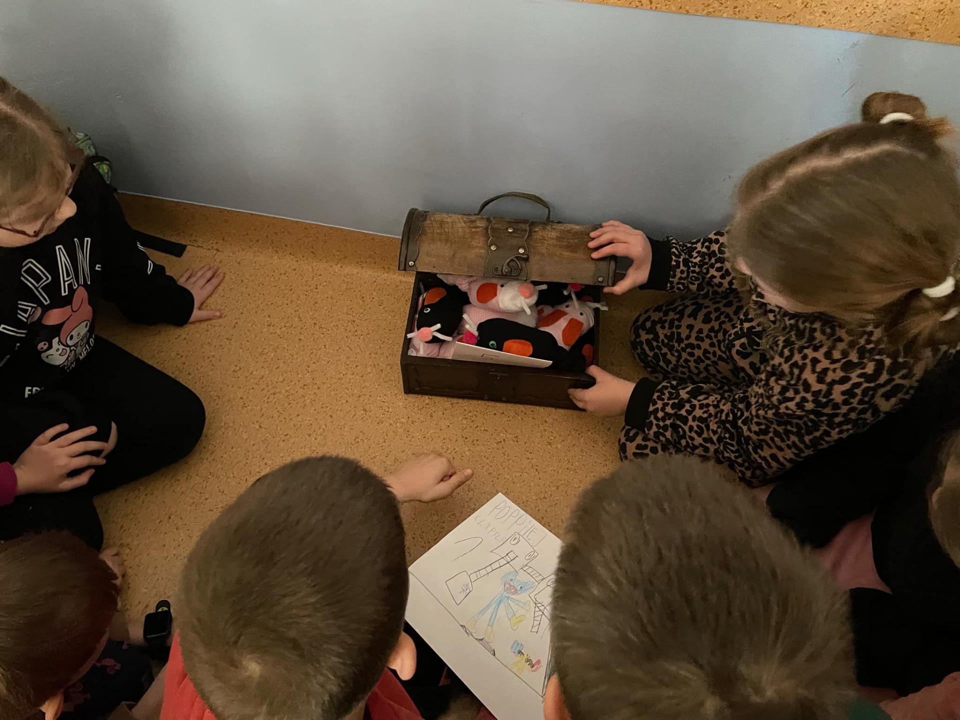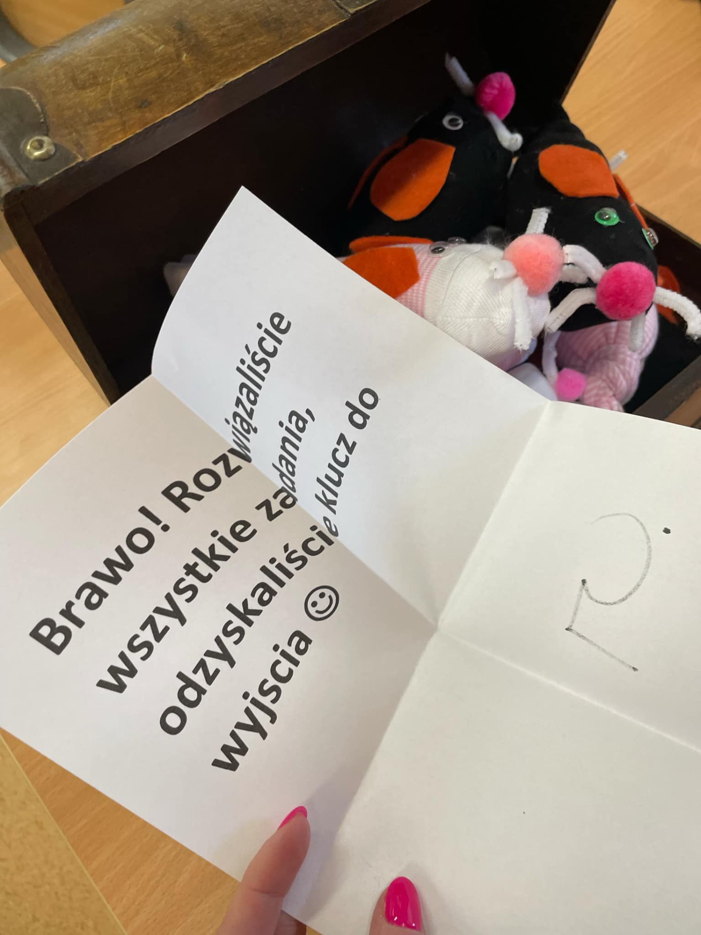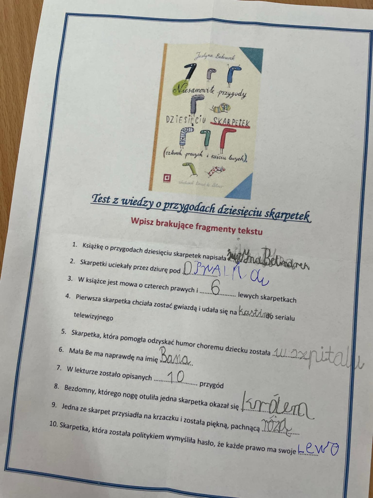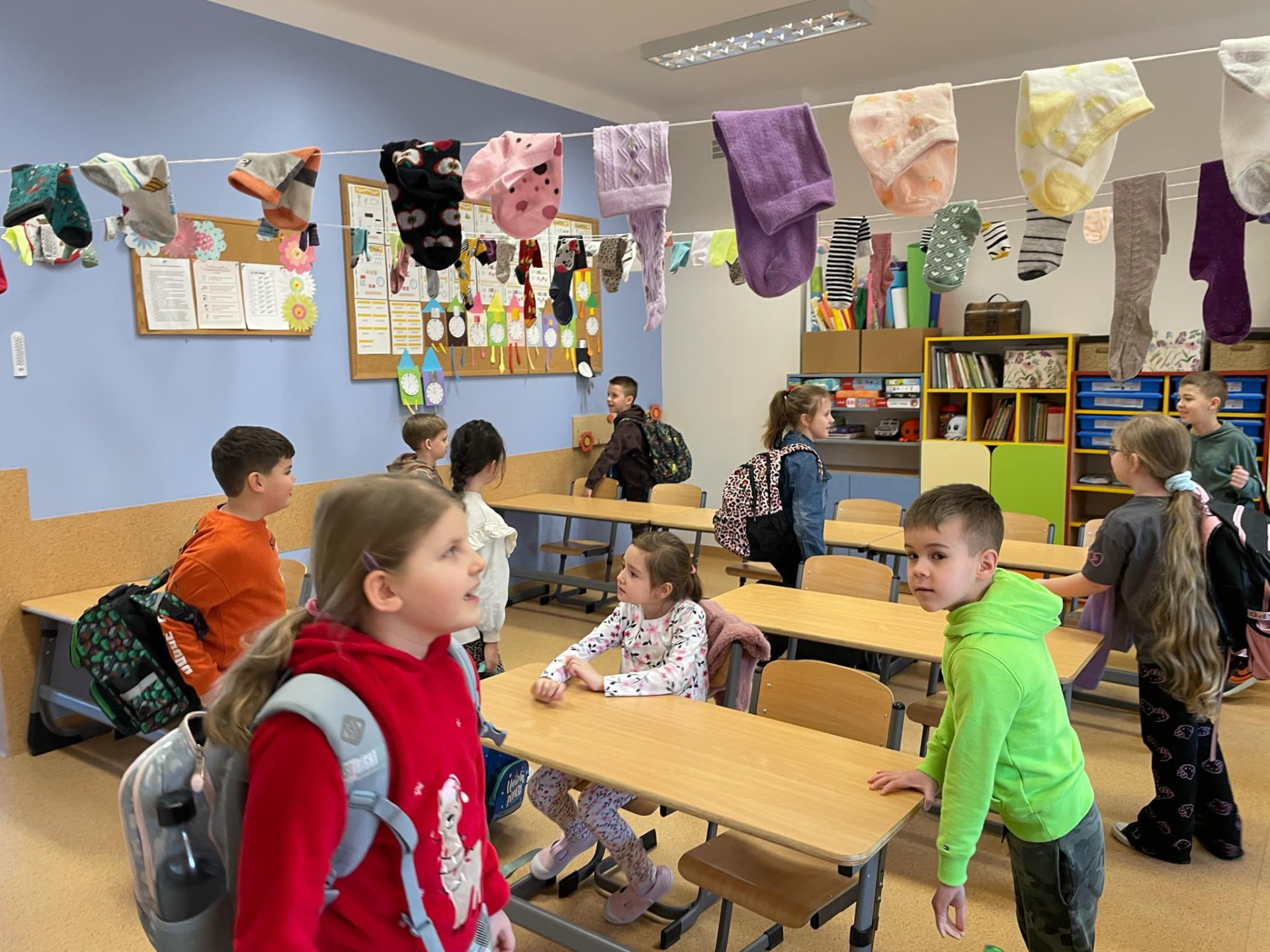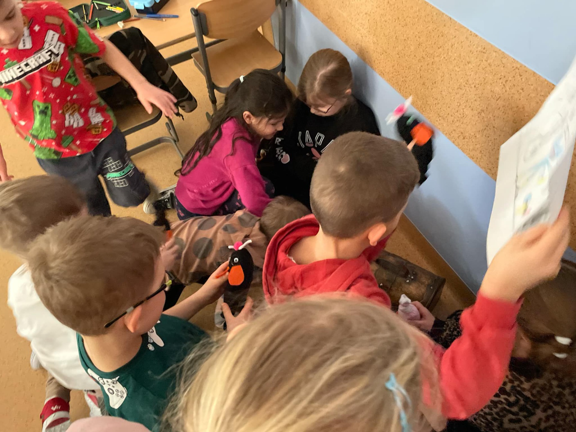 Po feriach klasa I rozpoczęła prace z lekturą w bardzo kreatywny sposób! Poniedziałkowy poranek okazał się dużym zaskoczeniem (po wejściu do klasy oczom uczniów ukazały się rozwieszone na sznurkach skarpetki! Było ich aż sto!) Wywołało to wiele zdziwienia, zaskoczenia i radości, a przede wszystkim znakomicie wprowadziło nas w nastrój czytanej lektury „Niesamowite przygody dziesięciu skarpetek”. Następnego dnia z kolei czekał na uczniów Escape Room i intensywna praca podsumowująca wiadomości z lektury: była praca wspólna, praca w grupach, łączenie puzzli w klasową pracę i na koniec niespodzianka - przygotowane przez panią skarpetkowe maskotki myszki w prezencie dla każdego ucznia.