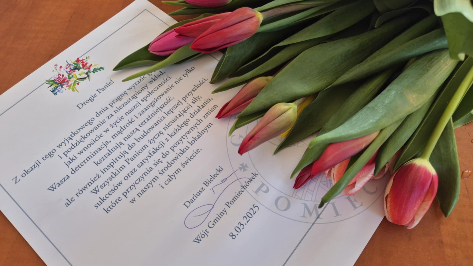 Żeńska kadra pedagogiczna oraz pracownicy obsługi dziękują za pamięć w tym dniu, również Wójtowi Gminy Pomiechówek p. Dariuszowi Bieleckiemu.