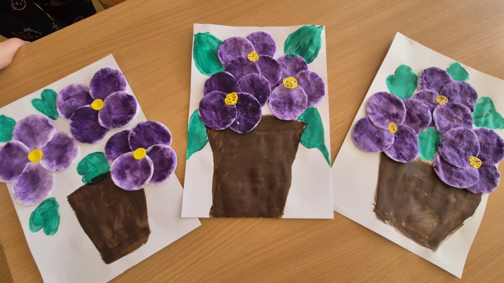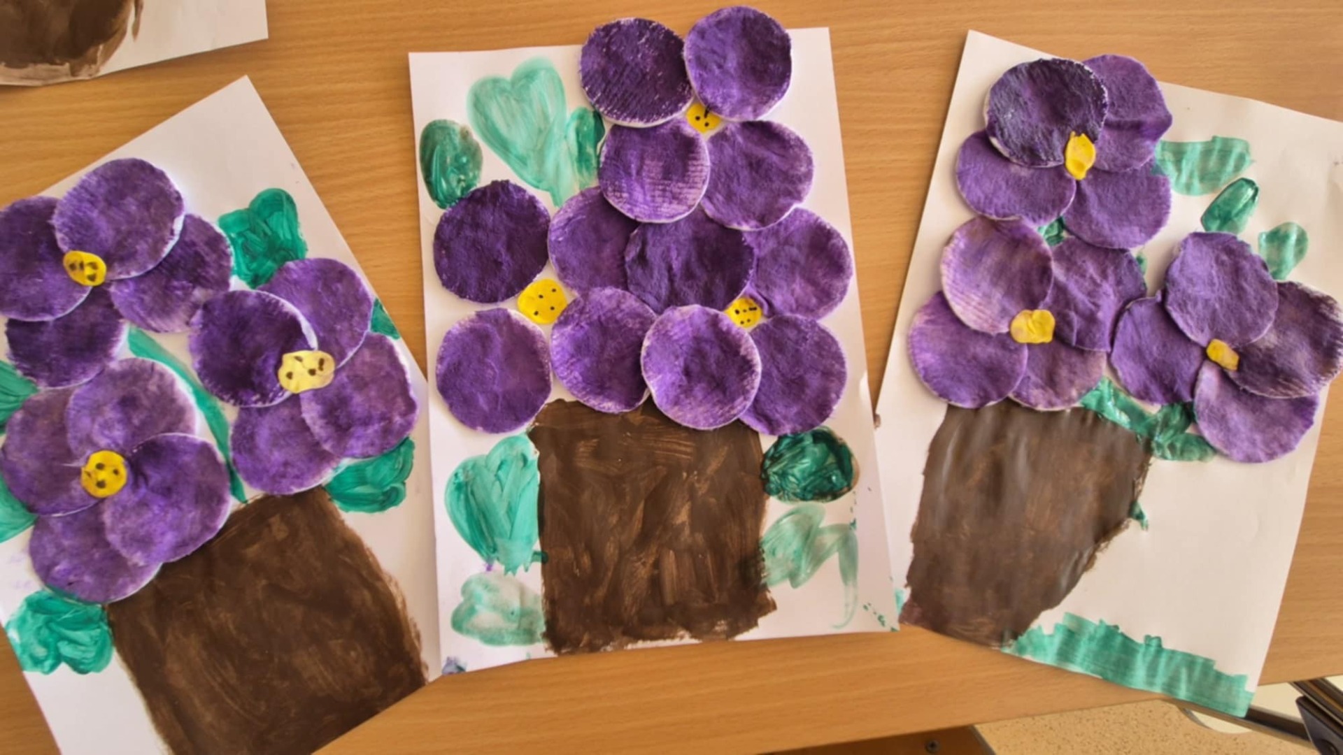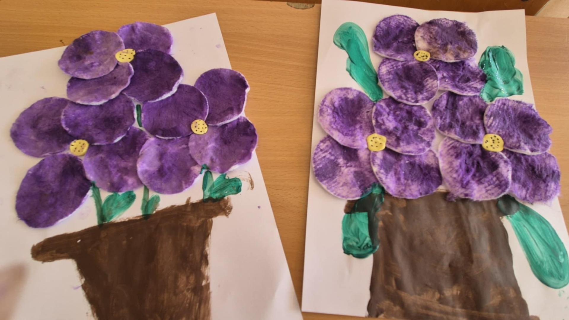 Na świetlicowych zajęciach plastycznych pracowaliśmy dziś techniką mieszaną. Stworzyliśmy fiołki z wacików kosmetycznych, plasteliny oraz przy pomocy farb. Zapraszamy do galerii.