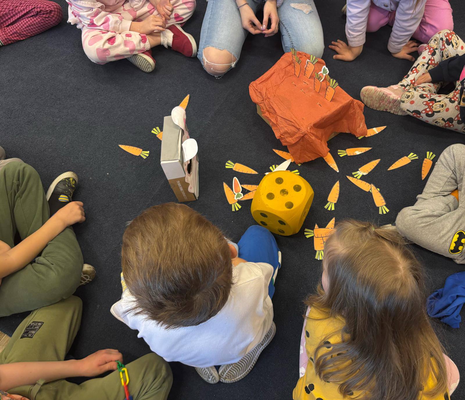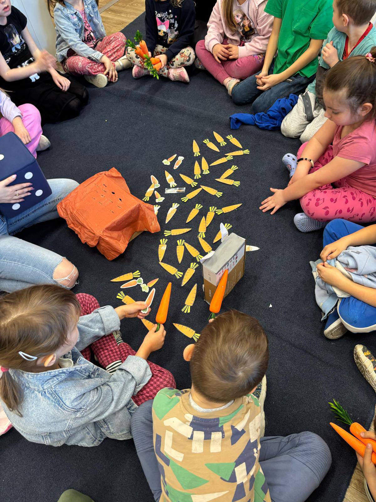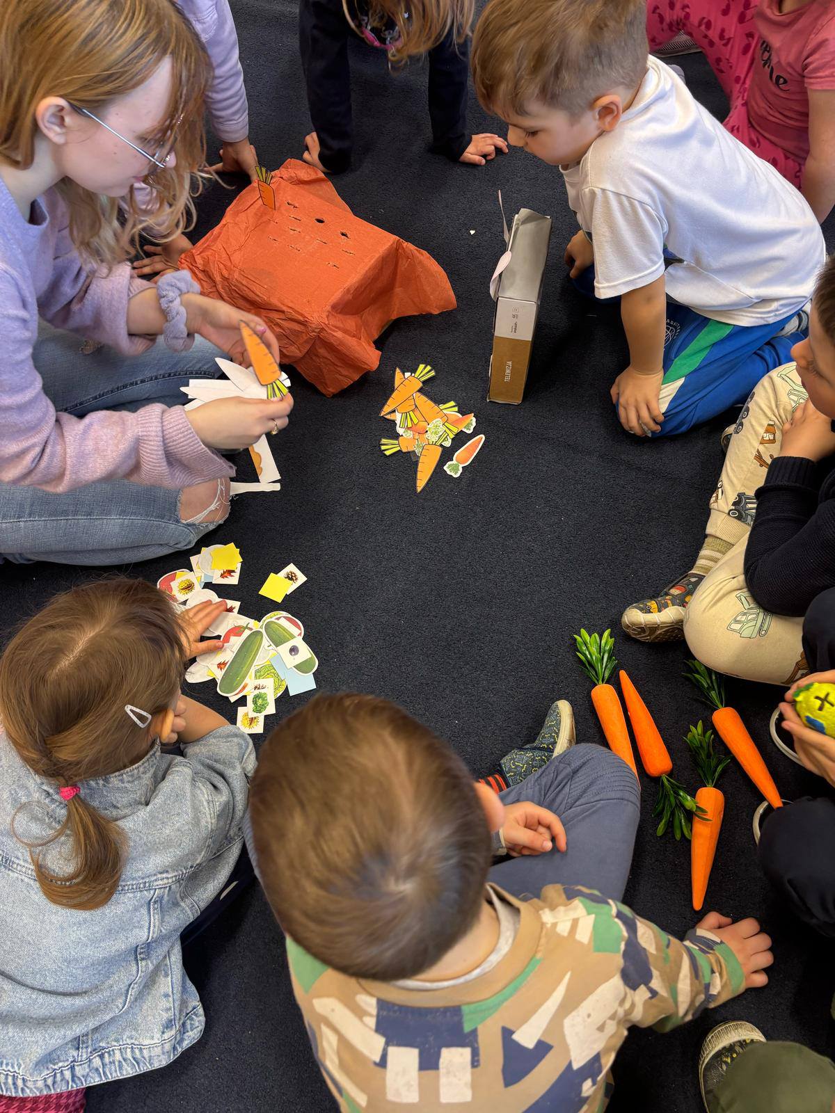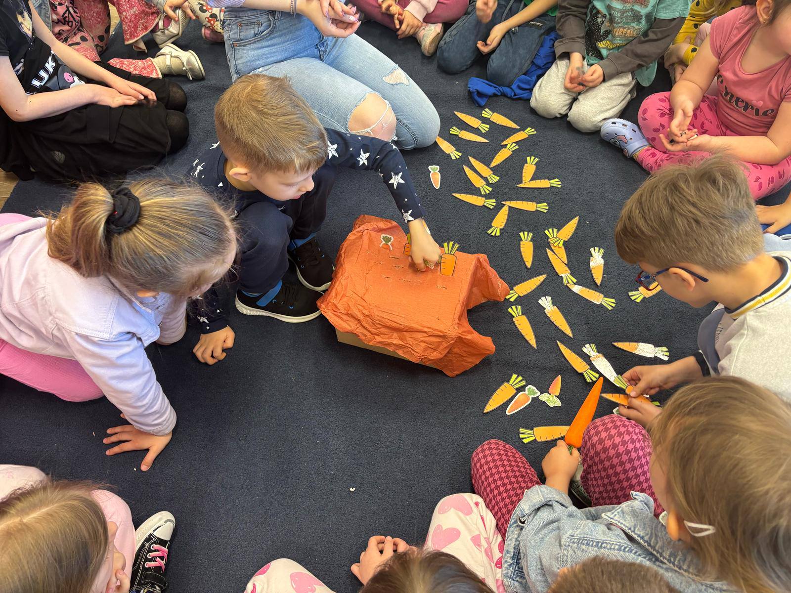 W przedszkolu obchodziliśmy dzień marchewki. Dzieci wyrzucały kostką ilości marchewki do posadzenia. Następnie szukały po sali ukrytych warzyw aby nakarmić królika. Na koniec zajęć stworzyły własne marchewki z papieru.