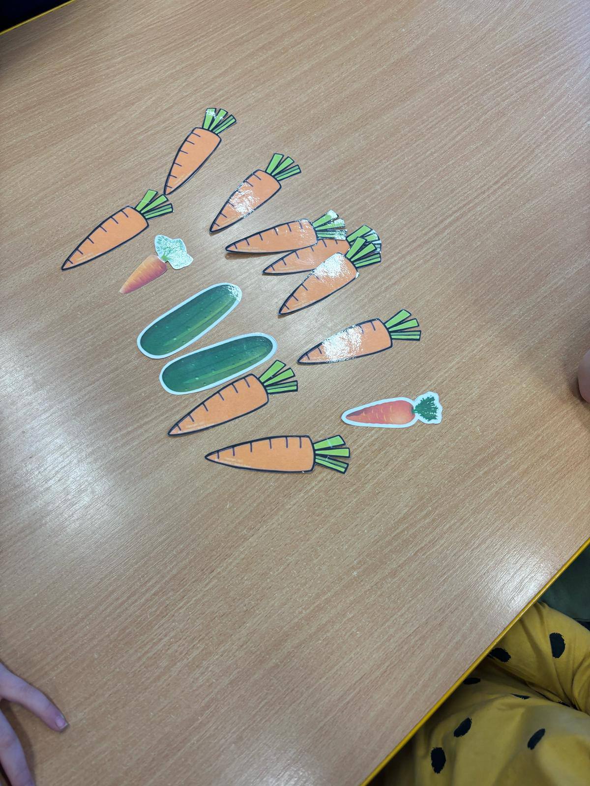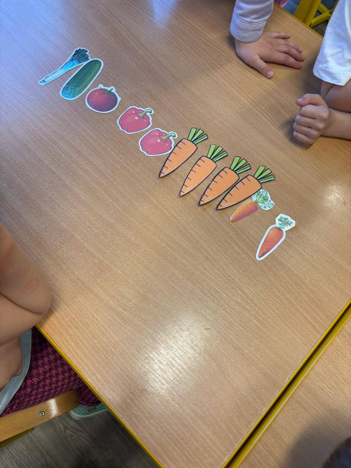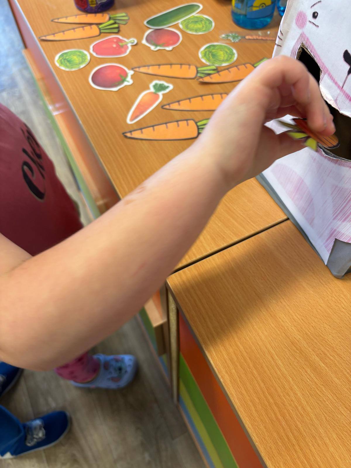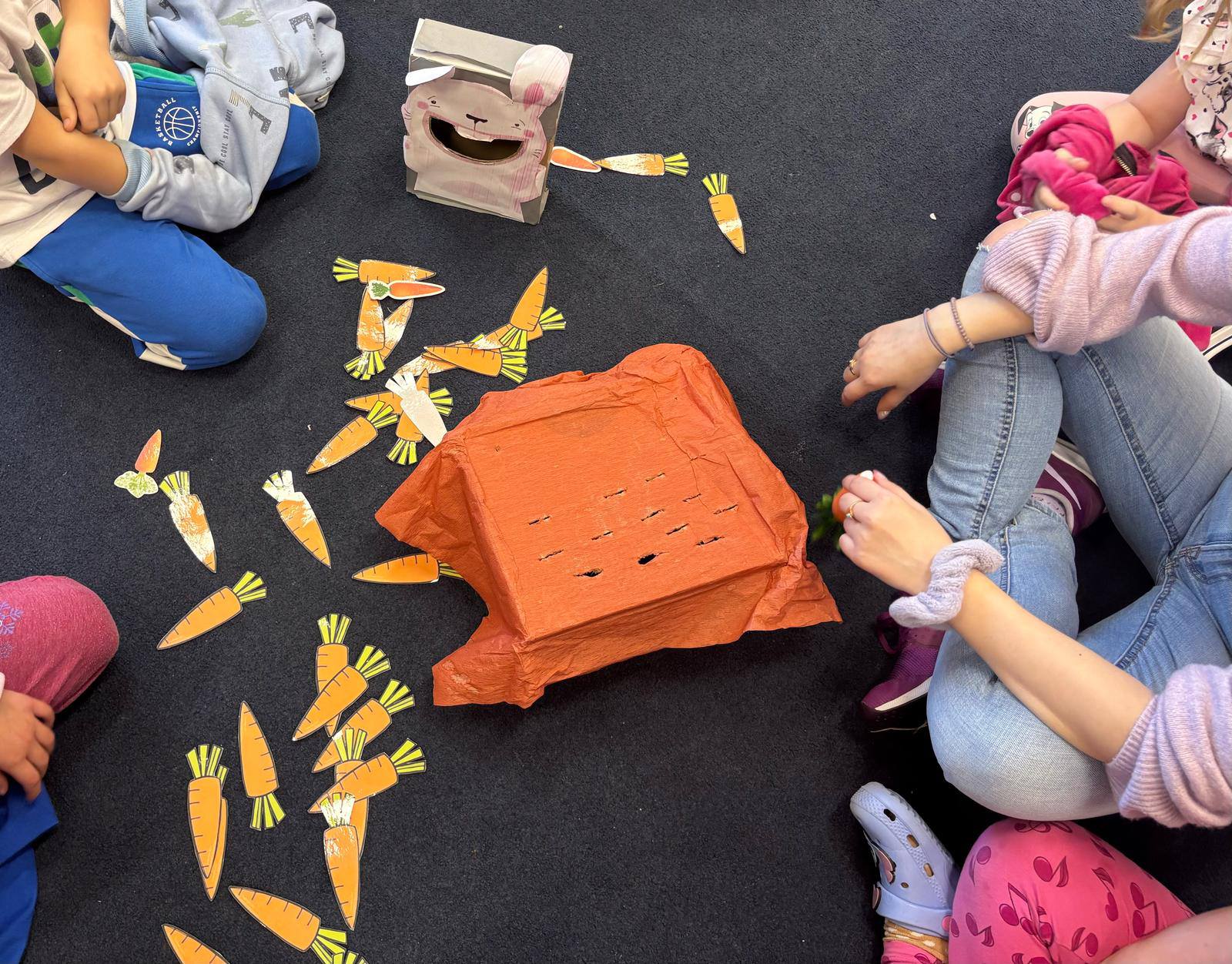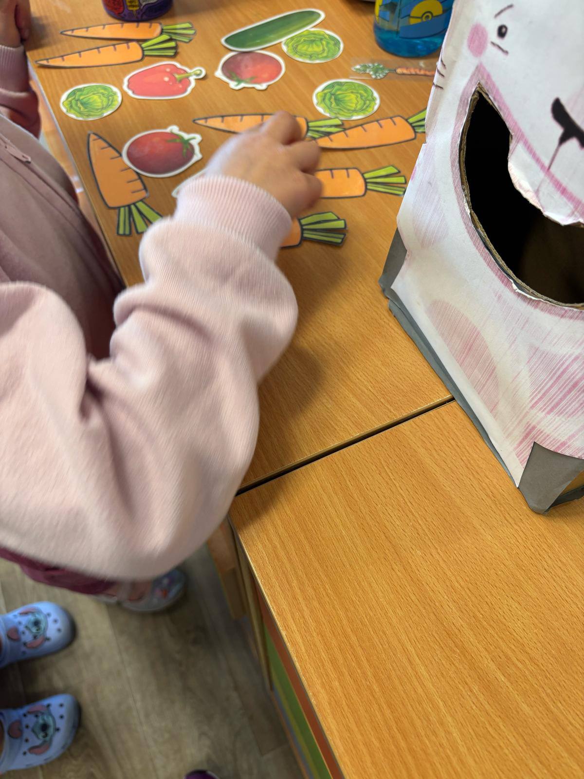 W przedszkolu obchodziliśmy dzień marchewki. Dzieci wyrzucały kostką ilości marchewki do posadzenia. Następnie szukały po sali ukrytych warzyw aby nakarmić królika. Na koniec zajęć stworzyły własne marchewki z papieru.