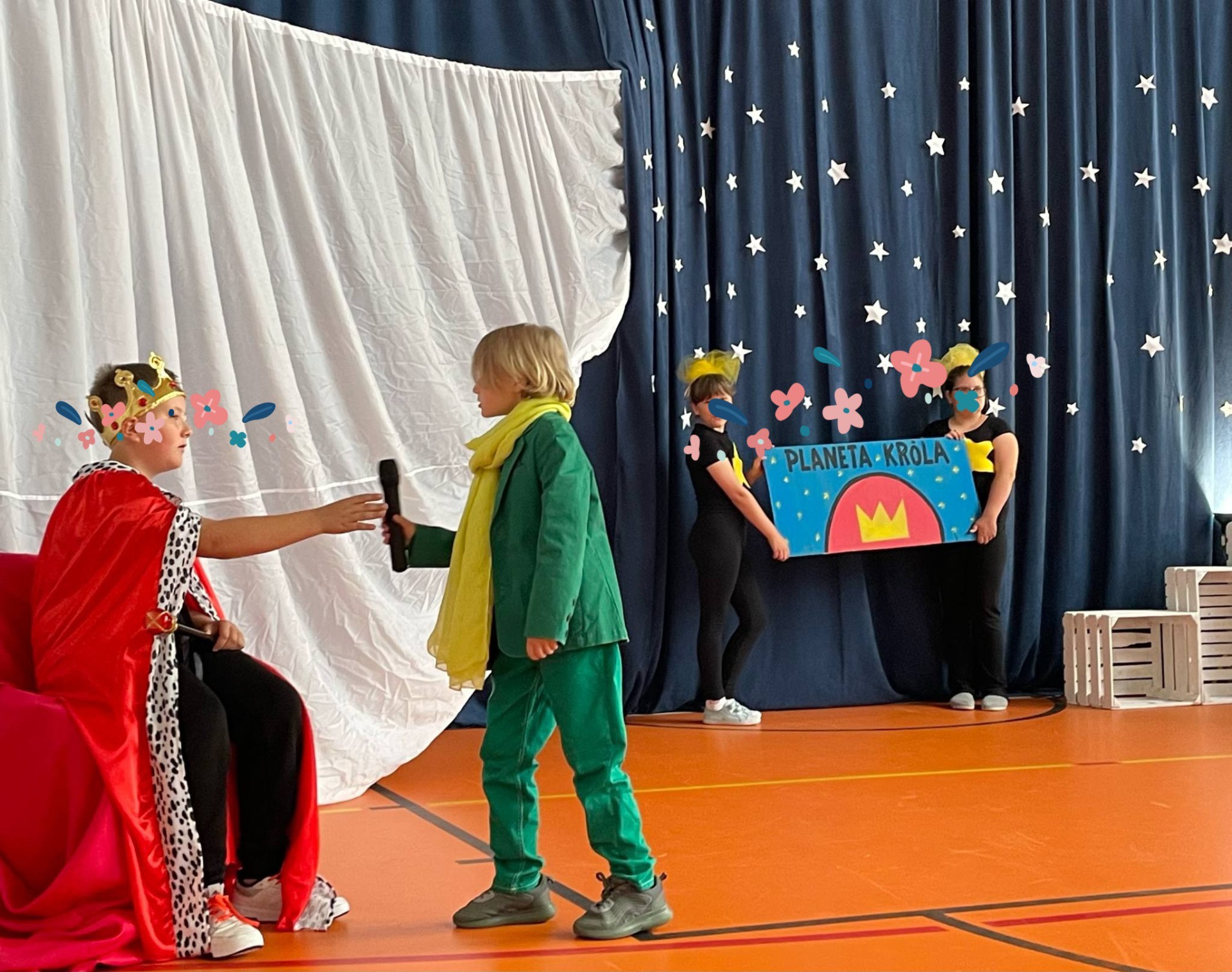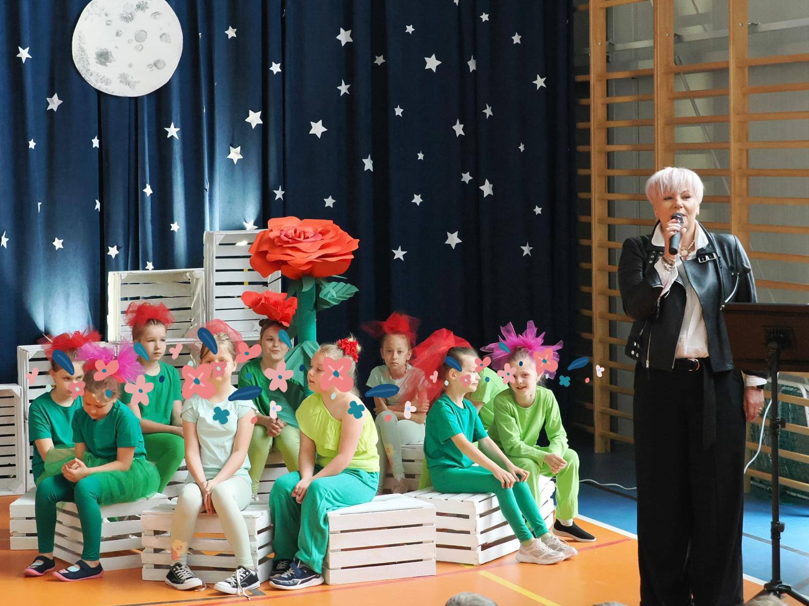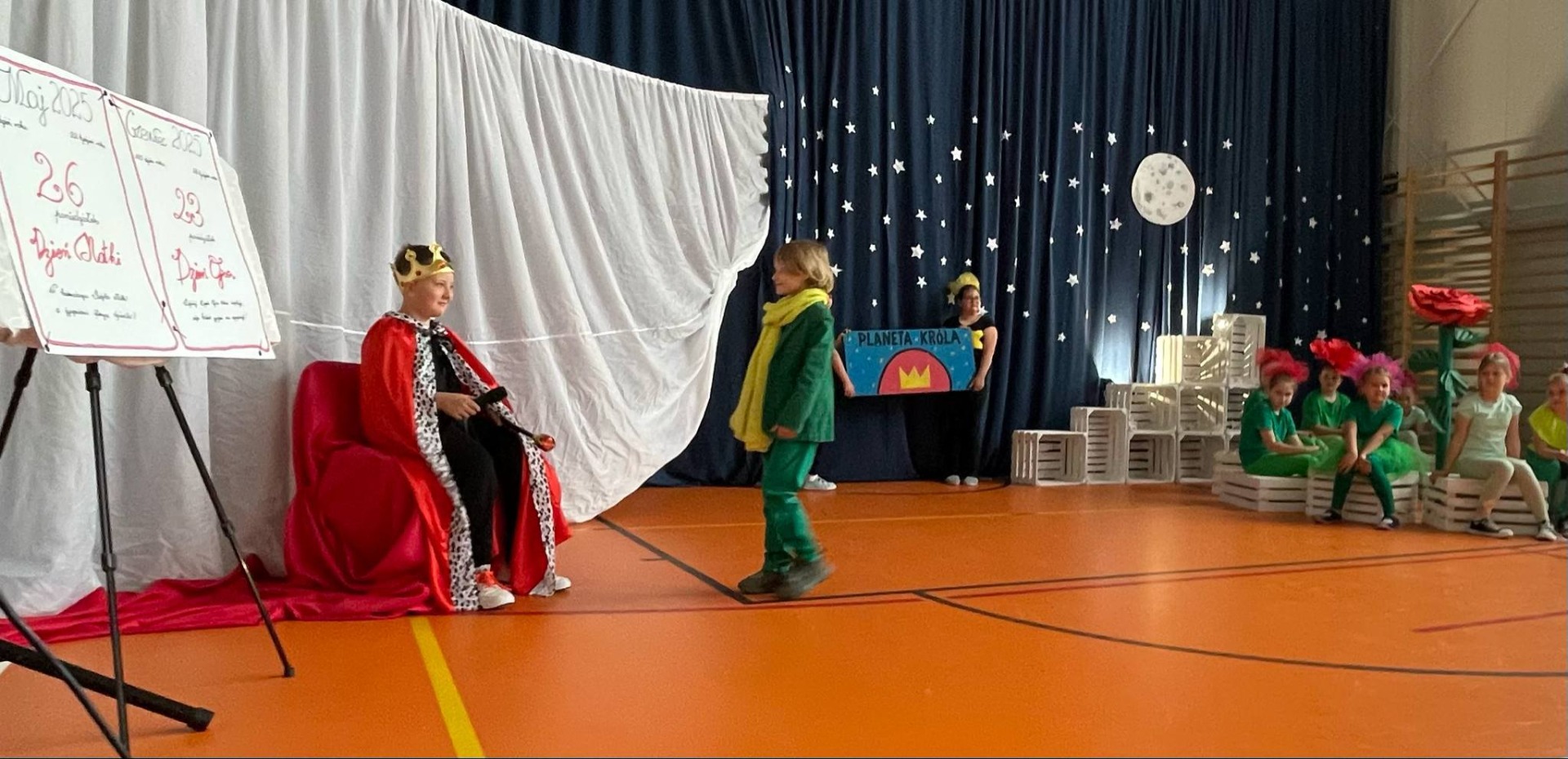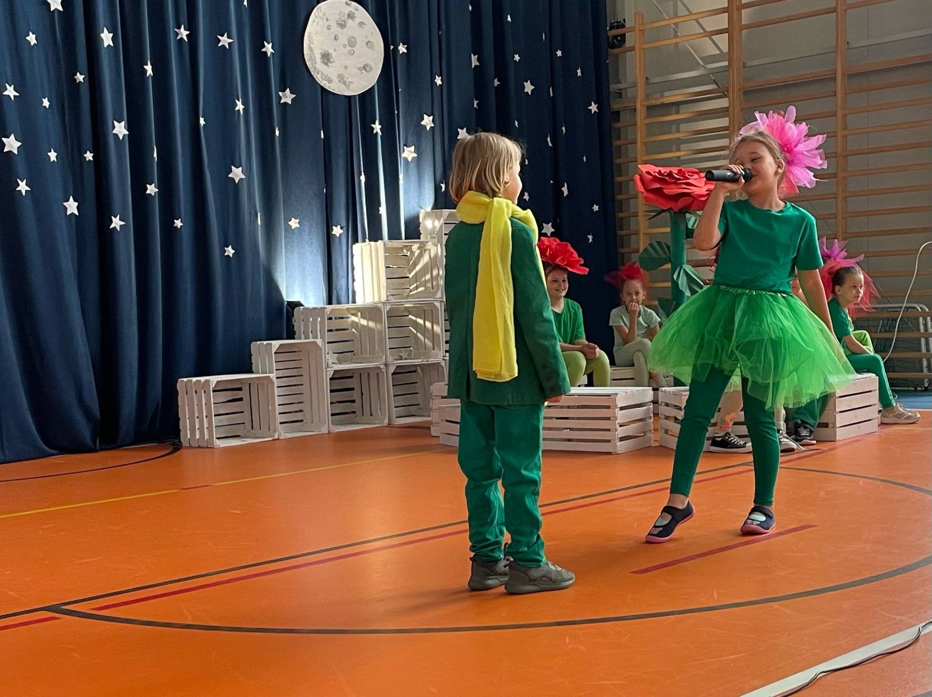 Na scenie zapanował niezwykły klimat – granatowa kurtyna z gwiazdami i księżycem, białe skrzynki ustawione jak planety oraz dzieci przebrane za postacie z tej ponadczasowej opowieści przeniosły widzów w inny wymiar. Mały Książę w charakterystycznym zielonym stroju z żółtym szalikiem spotykał kolejno mieszkańców planet: próżnego, króla, lisa, biznesmena i oczywiście – różę.