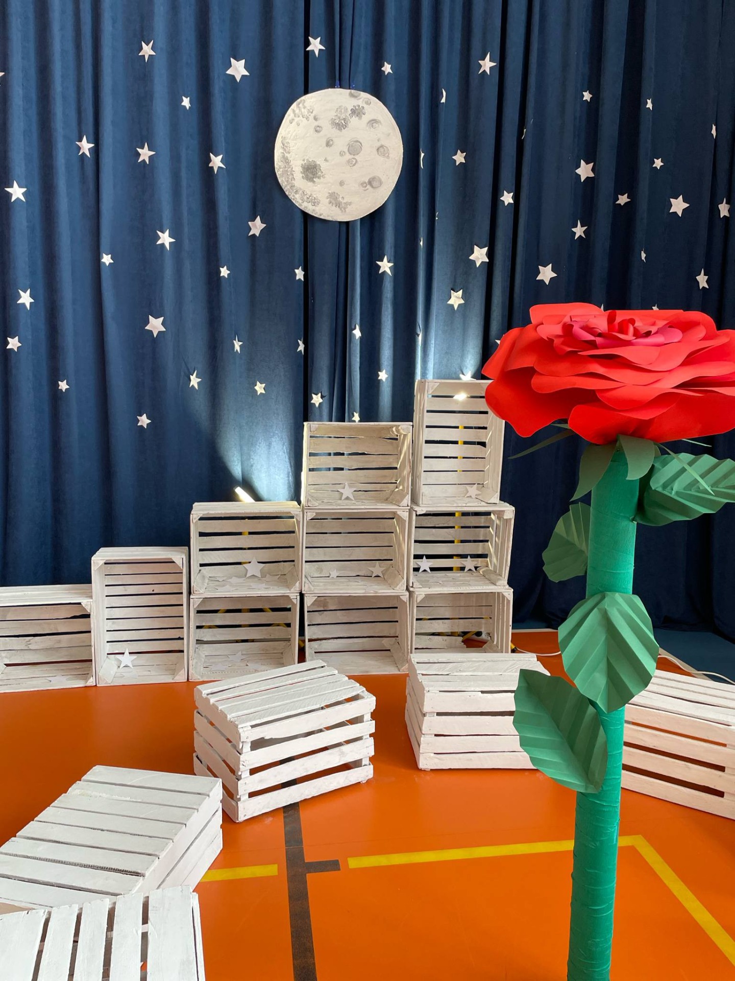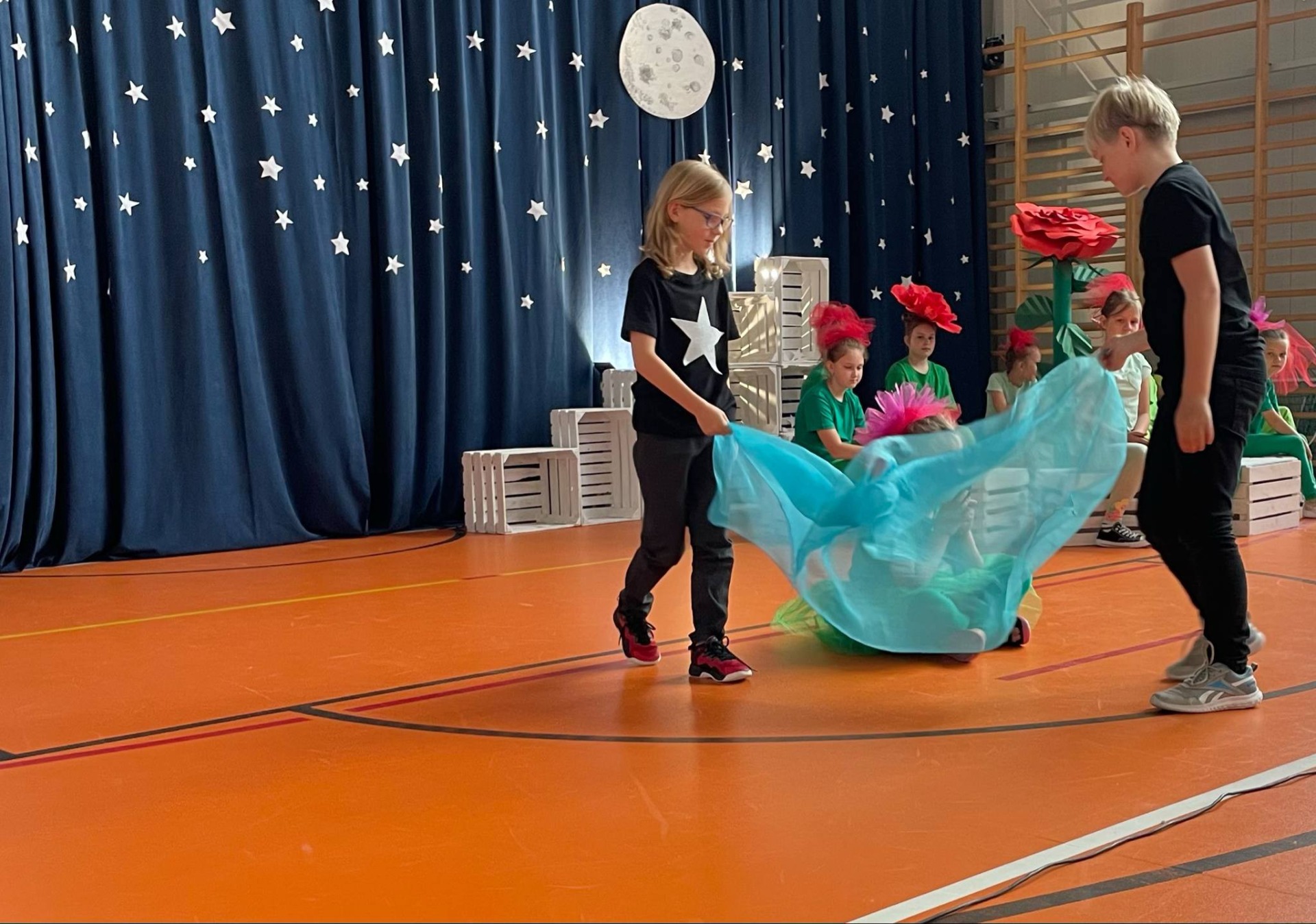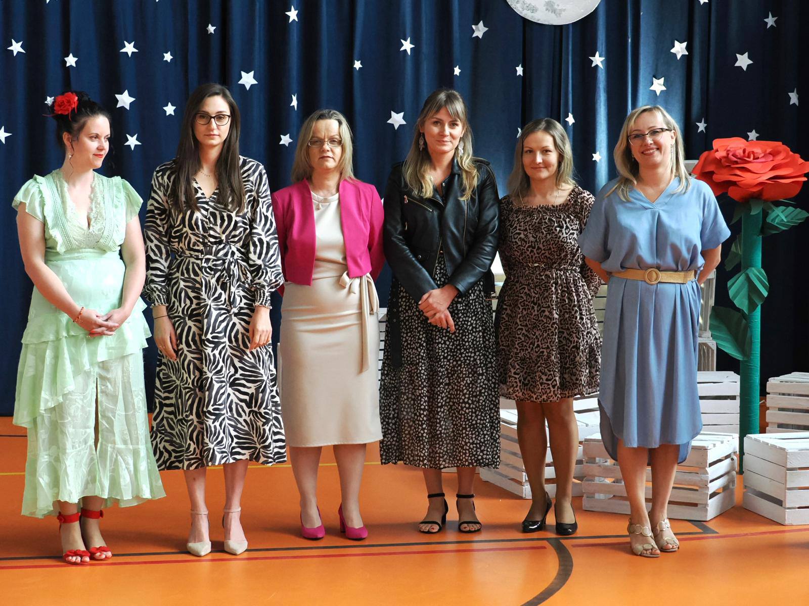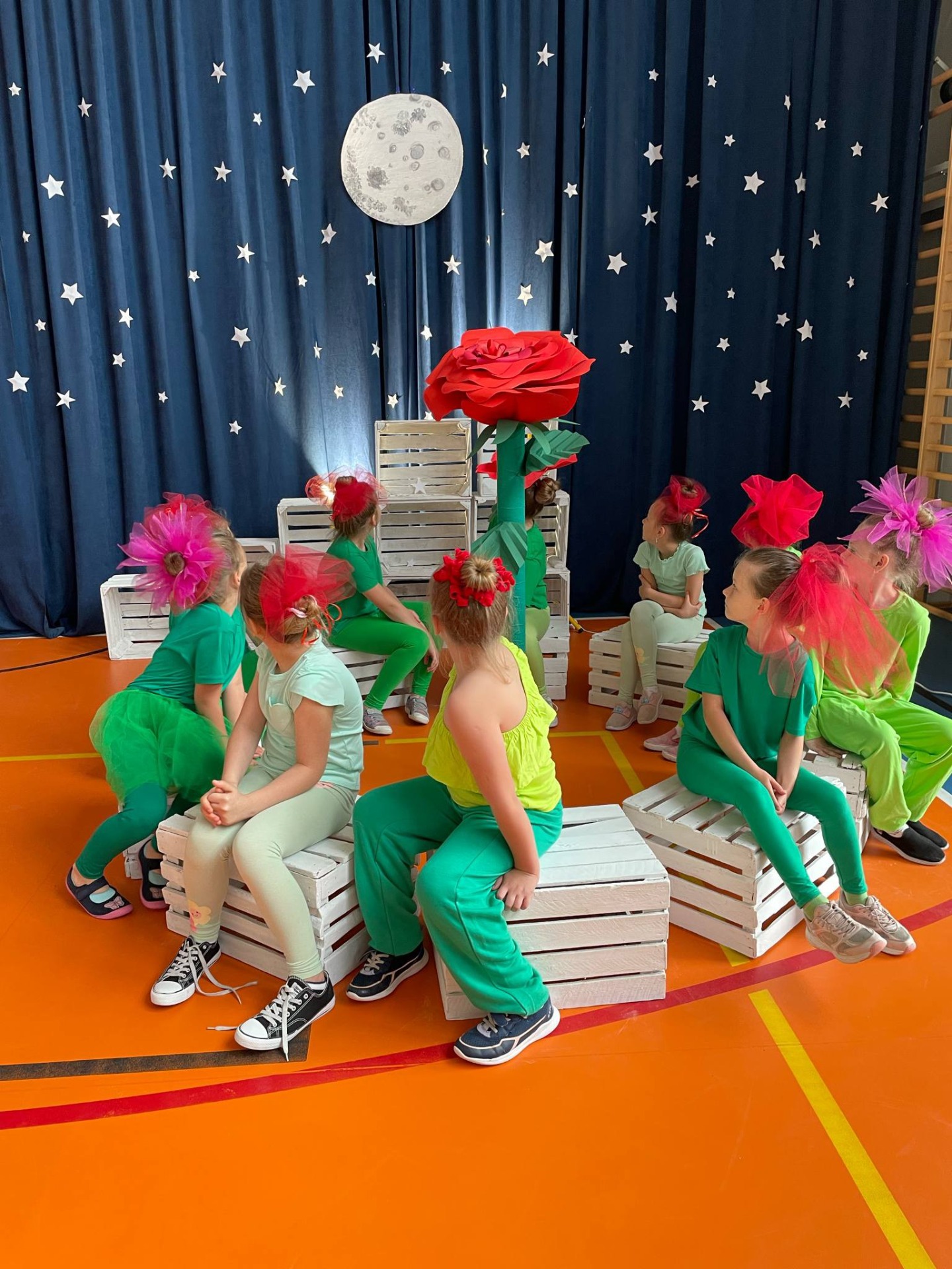 Na scenie zapanował niezwykły klimat – granatowa kurtyna z gwiazdami i księżycem, białe skrzynki ustawione jak planety oraz dzieci przebrane za postacie z tej ponadczasowej opowieści przeniosły widzów w inny wymiar. Mały Książę w charakterystycznym zielonym stroju z żółtym szalikiem spotykał kolejno mieszkańców planet: próżnego, króla, lisa, biznesmena i oczywiście – różę.