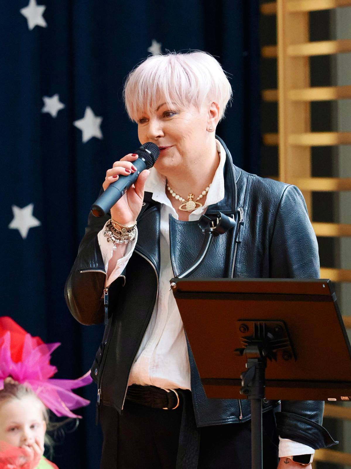 Kiedy cała grupa dzieci wystąpiła razem – ubrane na czarno z wielkimi, złotymi gwiazdami na piersiach – wypełniły przestrzeń radosnym śpiewem i piękną energią. Dzieci siedzące z różami w dłoniach, z koronami i pelerynami, wprowadzały elementy teatralne, które dorosłych chwytały za serce.