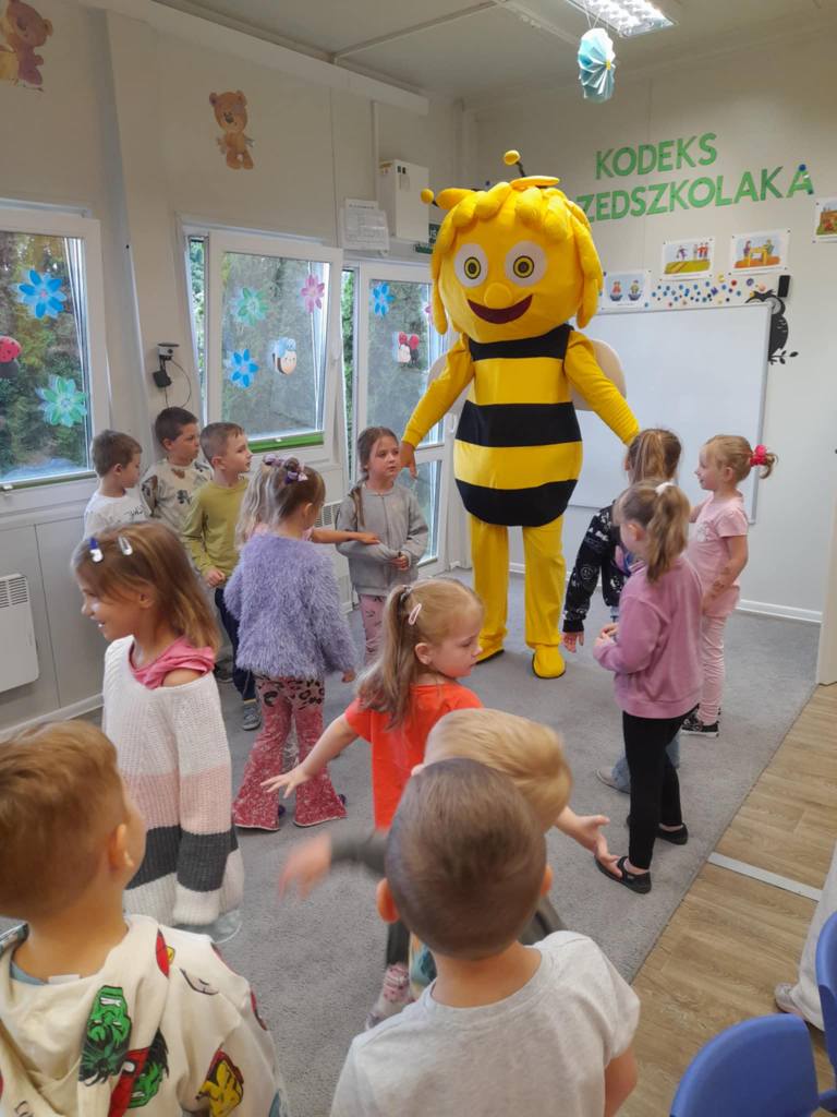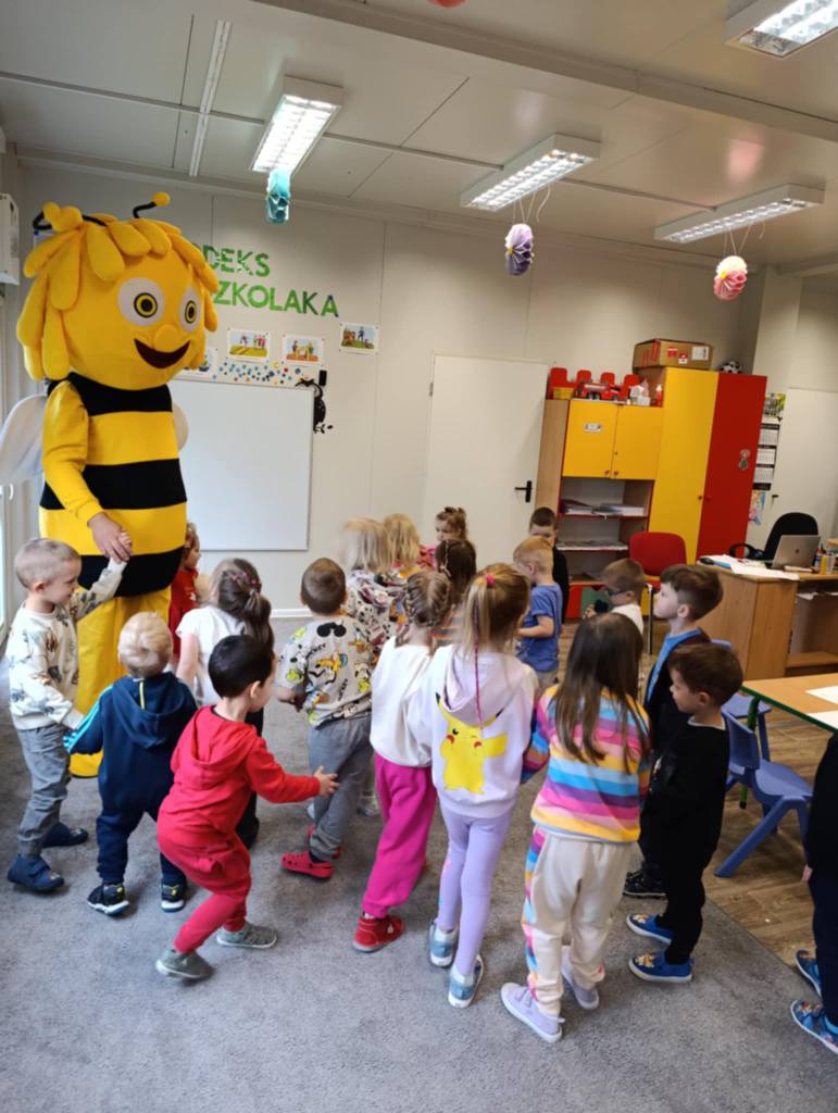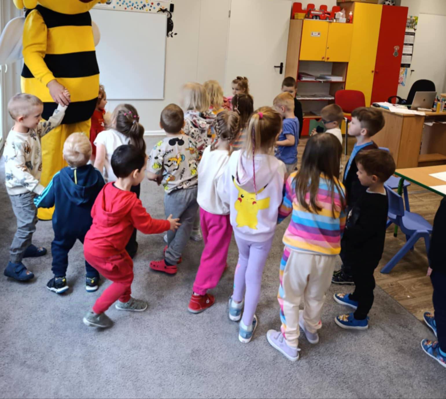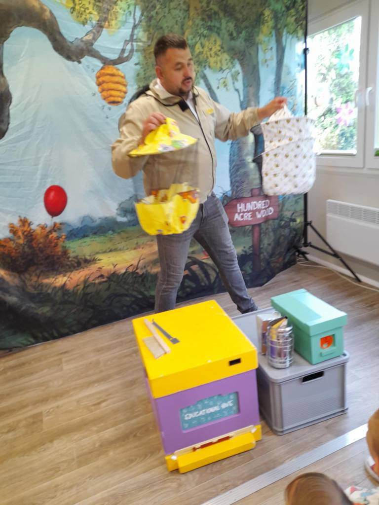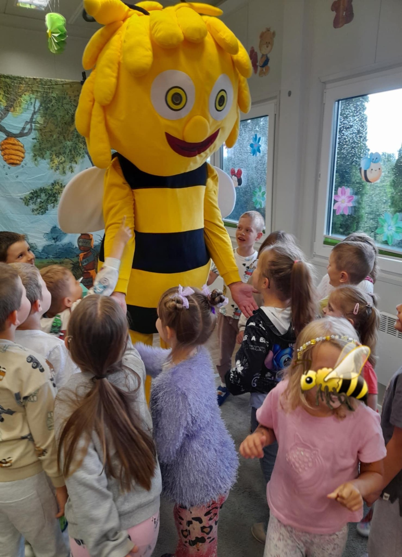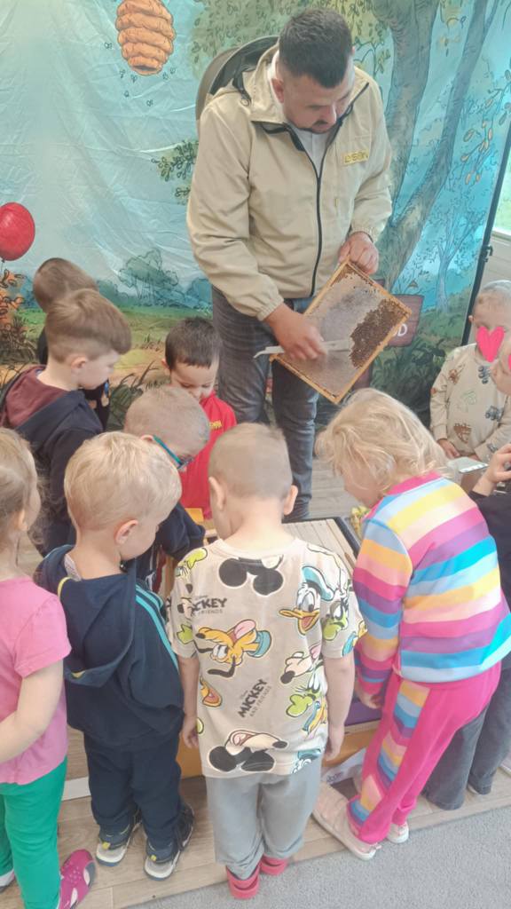 Nasze przedszkole odwiedził niezwykły gość – pan pszczelarz. Podczas pasjonującego spotkania opowiedział dzieciom o swojej pracy oraz zdradził wiele ciekawostek z życia ula. Przedszkolaki dowiedziały się, jak wygląda codzienne życie pszczół, jak powstaje miód, a także jak ważną rolę odgrywają pszczoły w przyrodzie. Dzieci miały również okazję samodzielnie wykonać świecę z wosku pszczelego, co sprawiło im ogromną radość. Na zakończenie wspólnie zatańczyły z Pszczółką Mają – było wesoło, kolorowo i miodowo!