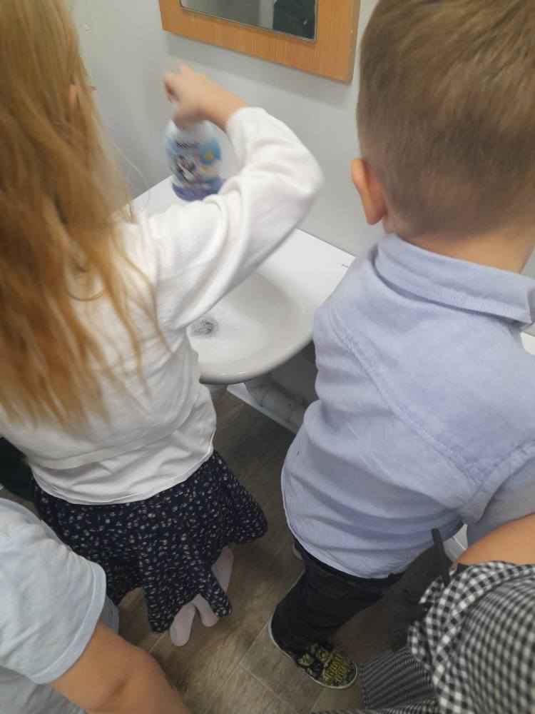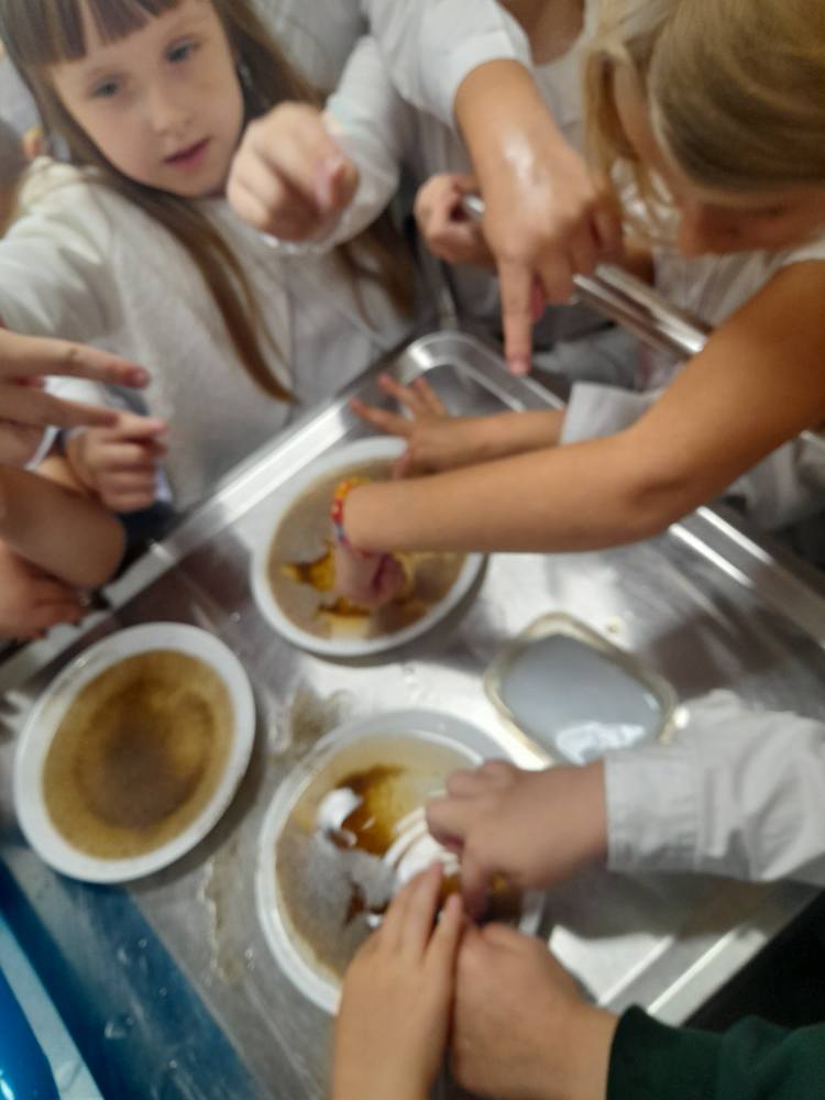 Dzieci uczestniczyły w ciekawych eksperymentach, dzięki którym zobaczyły, jak „uciekają” drobnoustroje od mydła 🧪✨ Podczas zajęć odbył się również instruktaż dokładnego mycia rąk oraz trening praktyczny – każdy przedszkolak mógł pochwalić się prawidłową techniką! 💦