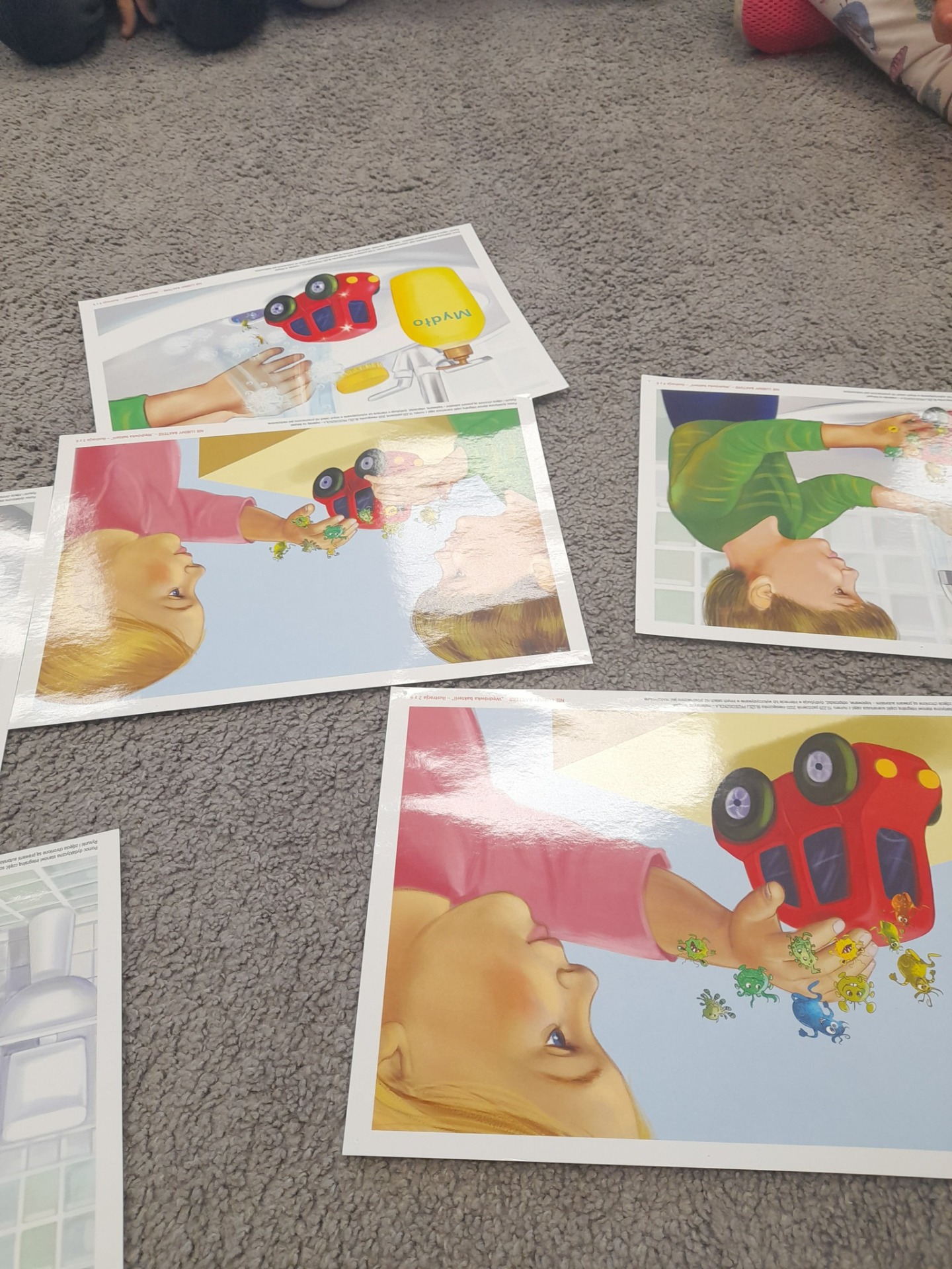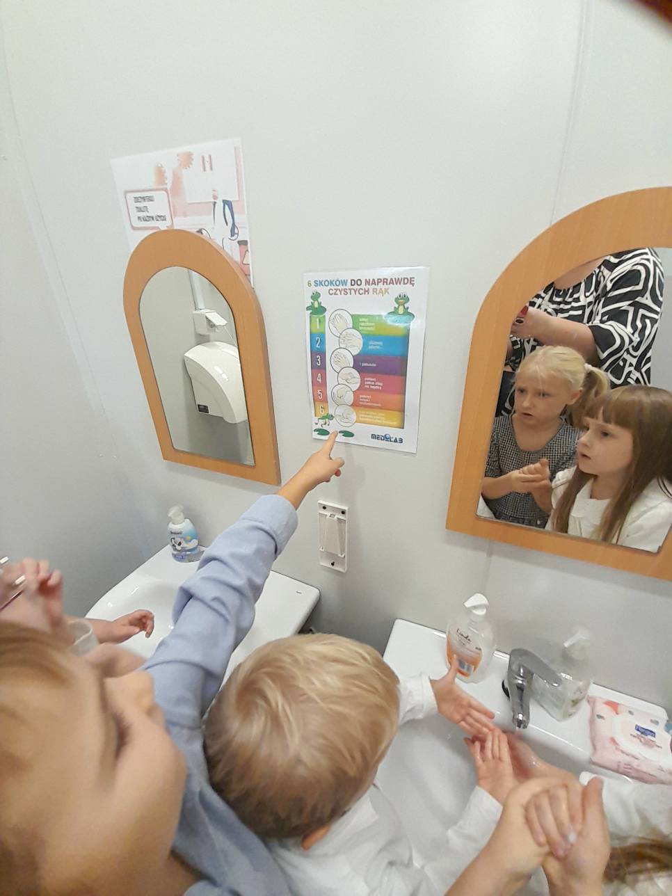 Na zakończenie dzieci wysłuchały bajki o przenoszeniu wirusów i bakterii na rękach, opowiadanej przez nauczyciela. Dzięki temu wszyscy już wiedzą, dlaczego warto myć ręce często i dokładnie!