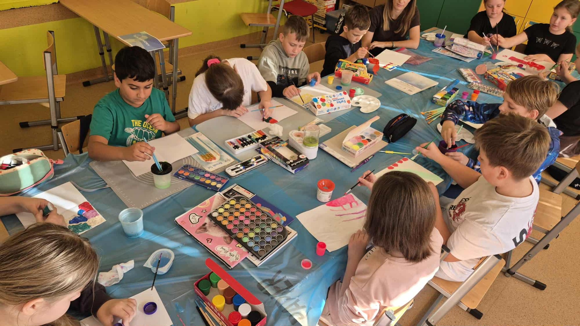 W plastyce plamy są nie do przecenienia. Właśnie takie zadanie dostała klasa 4 i poradziła sobie z nim wyśmienicie. Uczniowie byli bardzo zaangażowani w pracę i stworzyli piękne dzieła. Po naszej lekcji w klasie było tak czysto, że nikt by się nawet nie domyślił, że chwilę wcześniej chlapalismy tam do woli. Podczas naszych zajęć uczymy się również dbałości o nasze miejsce pracy.