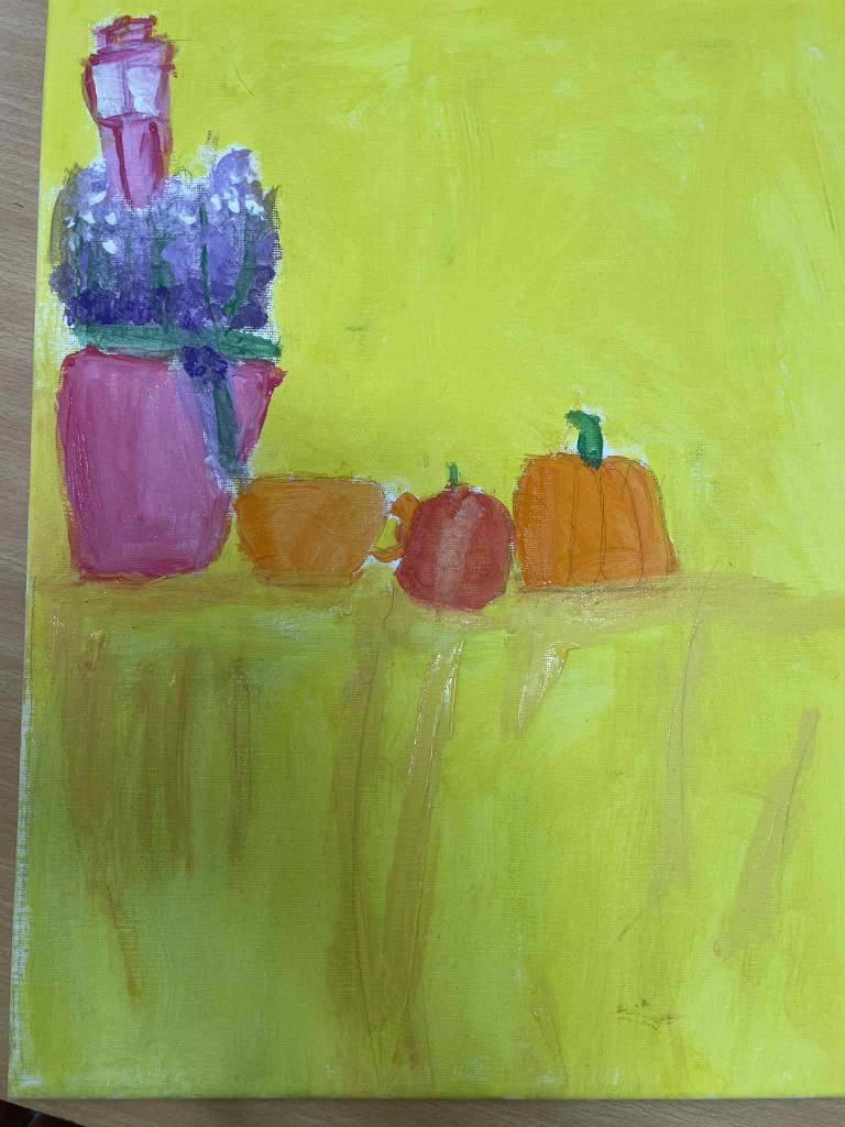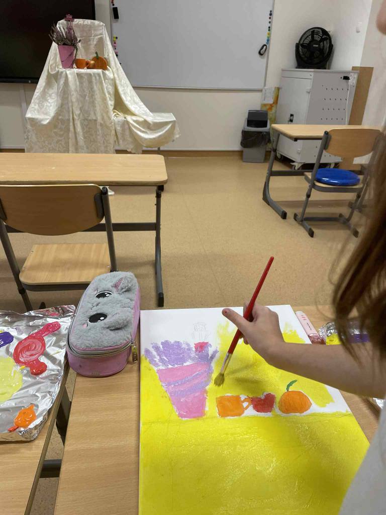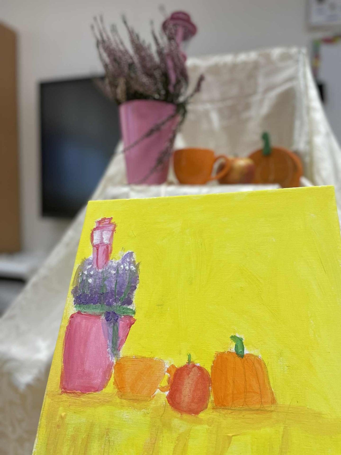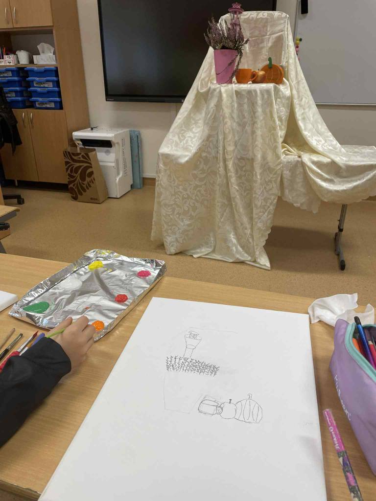 Dziś na zajęciach naszego Koła Artystycznego przenieśliśmy się w świat ciepłych barw i jesiennej melancholii. Uczniowie tworzyli martwą naturę na płótnach, inspirując się jesienią – dynią, jabłkiem i wrzosami. Każdy uczestnik mógł rozwijać spostrzegawczość, wrażliwość estetyczną i umiejętność komponowania przestrzeni obrazu. Praca na płótnie uczy też odpowiedzialności za własny proces twórczy – tu nie da się nic „wytrzeć” jak w zeszycie, trzeba zaufać sobie i swojej intuicji. Wspólne malowanie w jesiennym klimacie sprzyjało relaksowi i koncentracji, a także budowało poczucie sprawczości – bo każdy obraz był inny, wyjątkowy i pełen osobistego wyrazu. KK.