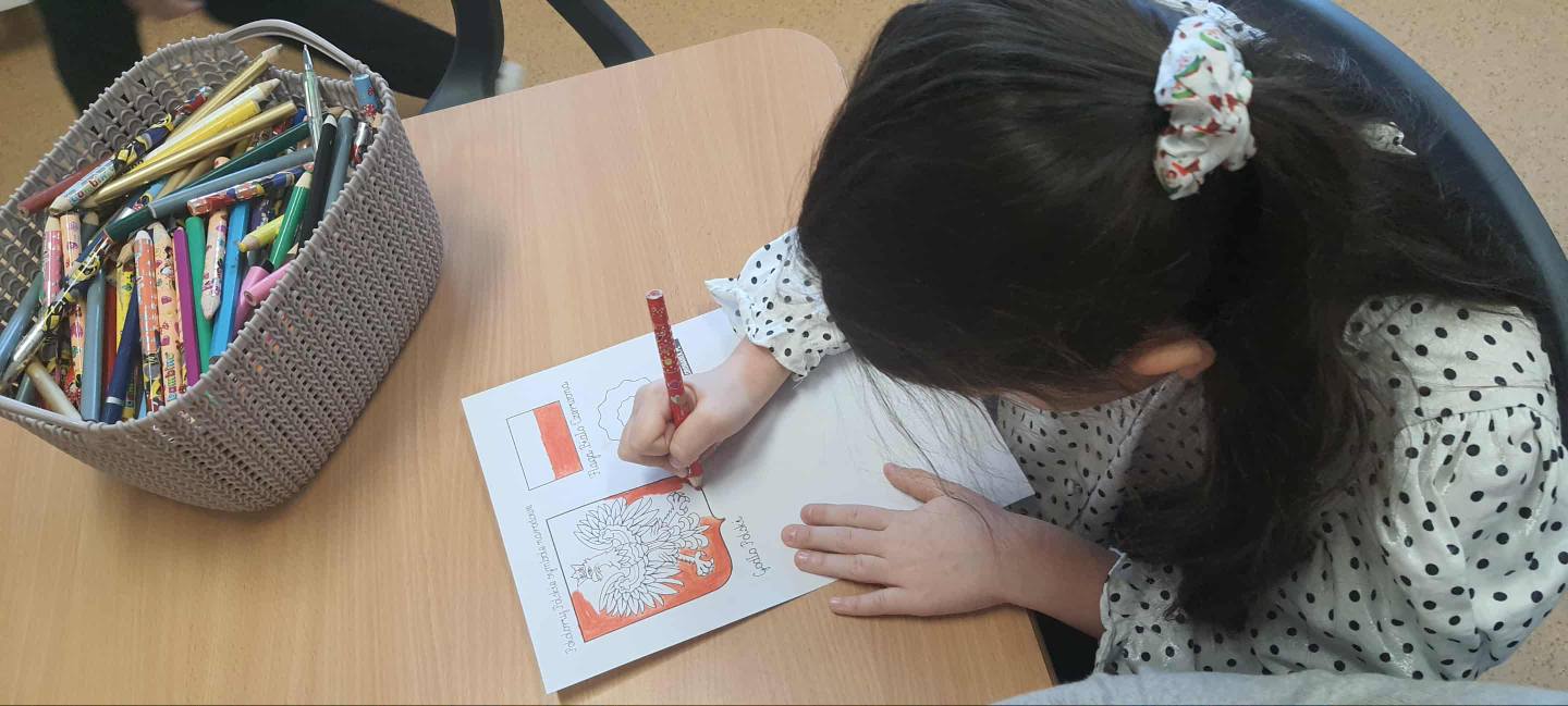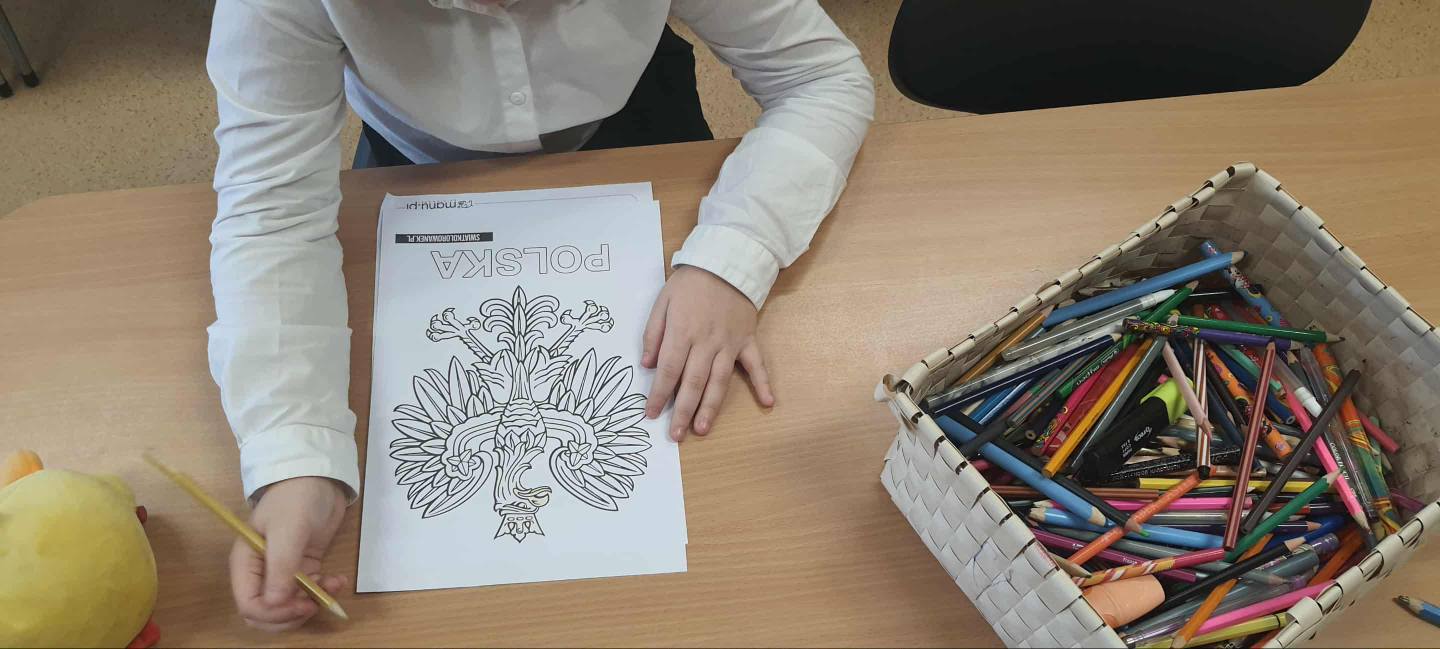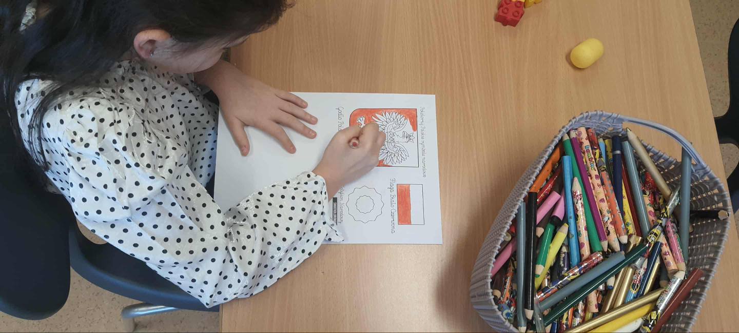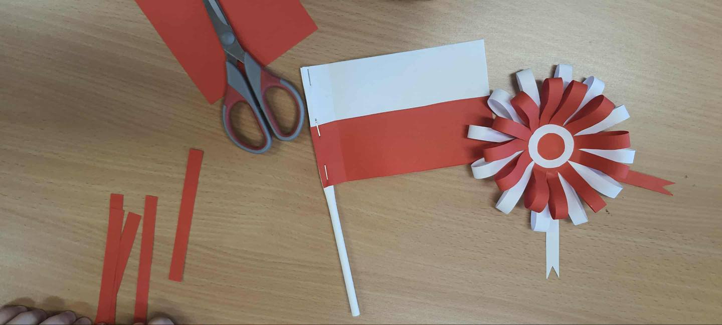 Podczas zajęć plastycznych w świetlicy dzieci wykonywały symbole narodowe - flagi, godła oraz wstążki narodowe - aby w ten sposób uczcić Narodowe Święto Niepodległości i wyrazić swój szacunek do Ojczyzny.