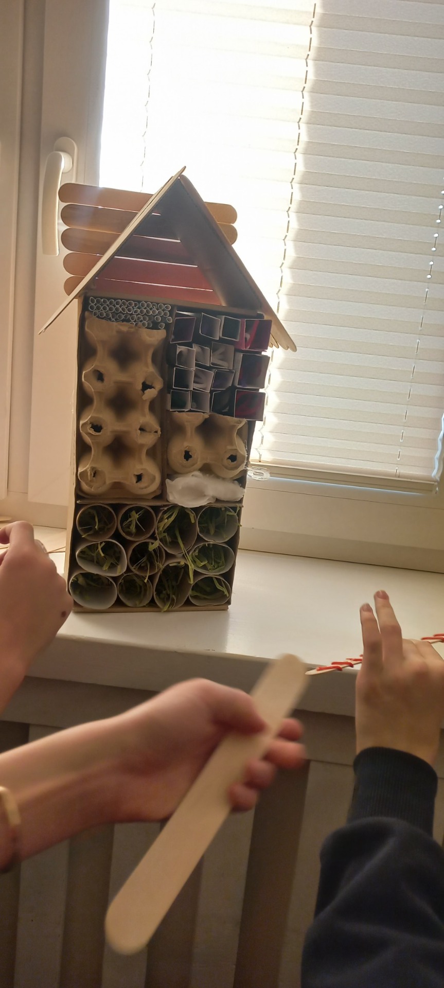 🐝 Przyjazne domki dla owadów – małe schronienia, wielka pomoc naturze W ramach projektu " Mazowsze oddycha ciszej" nasi uczniowie tworzyli domki przyjazne owadom – kolorowe, pomysłowe i wykonane z naturalnych materiałów. Ich zadaniem jest nie tylko zwabienie pożytecznych owadów do ogrodu, ale także zapewnienie im bezpiecznego schronienia na zimę. Podczas pracy uczniowie poznawali znaczenie owadów w przyrodzie, dowiadywali się, jak ważną rolę pełnią w zapylaniu roślin i utrzymywaniu równowagi ekologicznej. Wspólnie zastanawiali się, jak można pomóc przyrodzie w prosty, praktyczny sposób. Projekt połączył naukę z kreatywnością – dzieci samodzielnie planowały wygląd domków, wykorzystywały materiały ekologiczne, a przy tym rozwijały swoje umiejętności manualne i współpracę w grupie. Powstałe domki stały się nie tylko ozdobą szkolnego ogrodu, ale przede wszystkim bezpiecznym azylem dla pszczół, biedronek i innych małych mieszkańców przyrody.