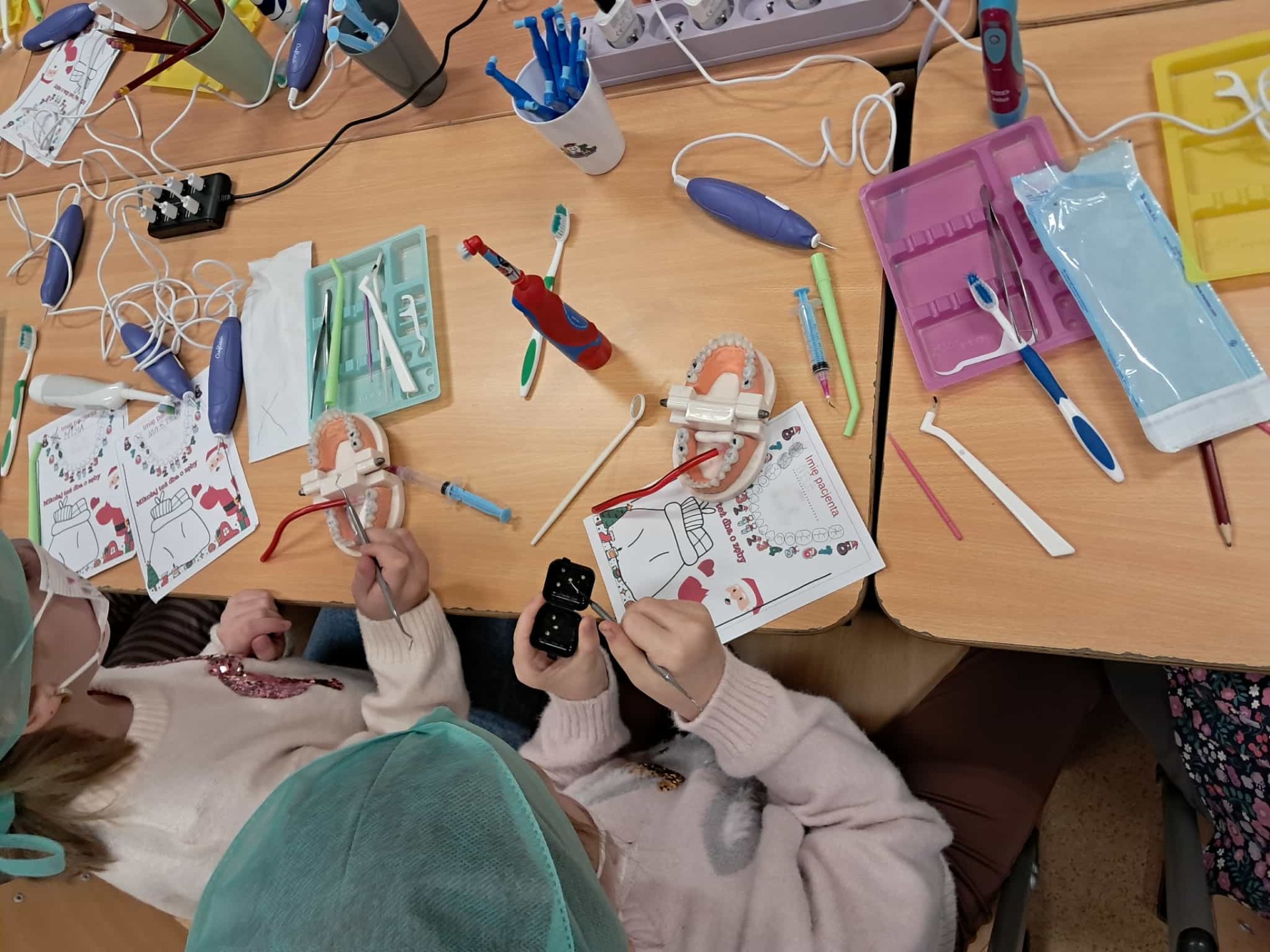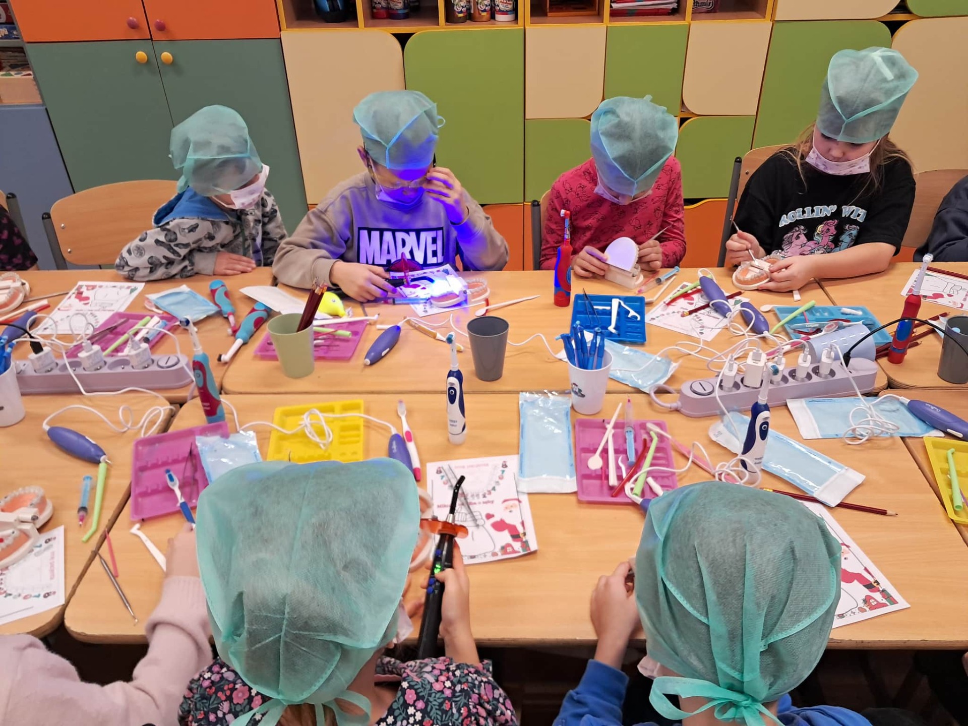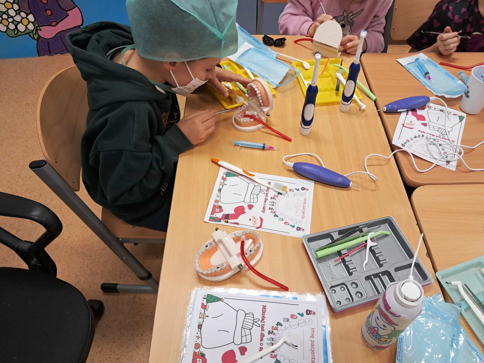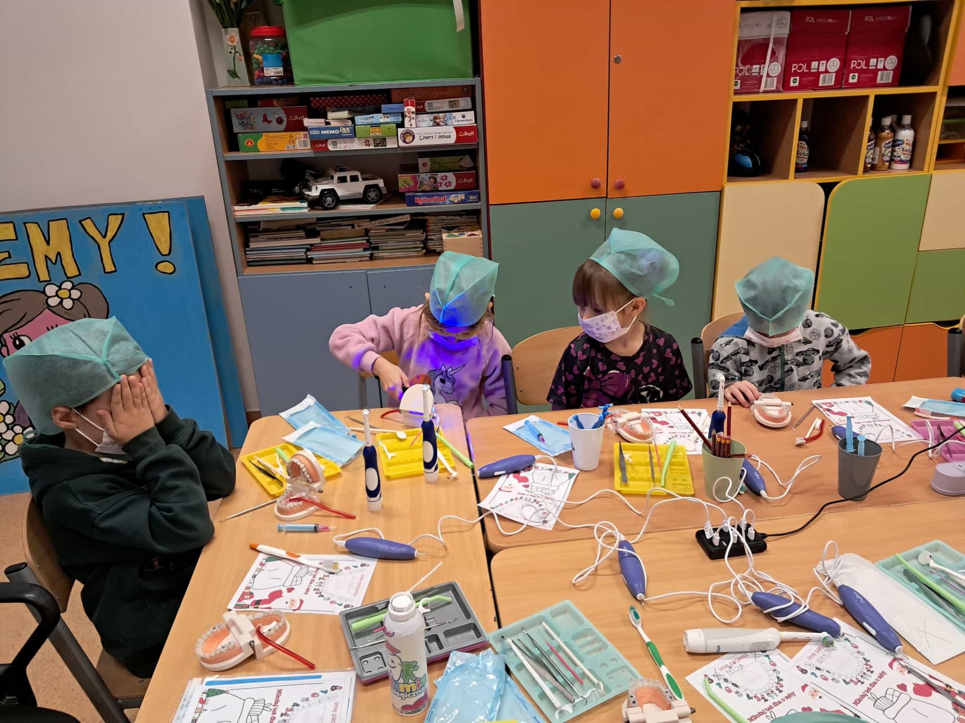 Dzieci dowiedziały się, jak prawidłowo dbać o zęby, poznały budowę jamy ustnej oraz przyczyny powstawania próchnicy. Ćwiczyły także szczotkowanie i nitkowanie, a następnie – wcielając się w rolę małych dentystów – wykonywały „przegląd pacjenta”, lakierowanie zębów i zakładanie plomby na specjalnych modelach. To świetny sposób, aby pokazać, że gabinet dentystyczny może być miejscem ciekawym, a nie strasznym! 🎓