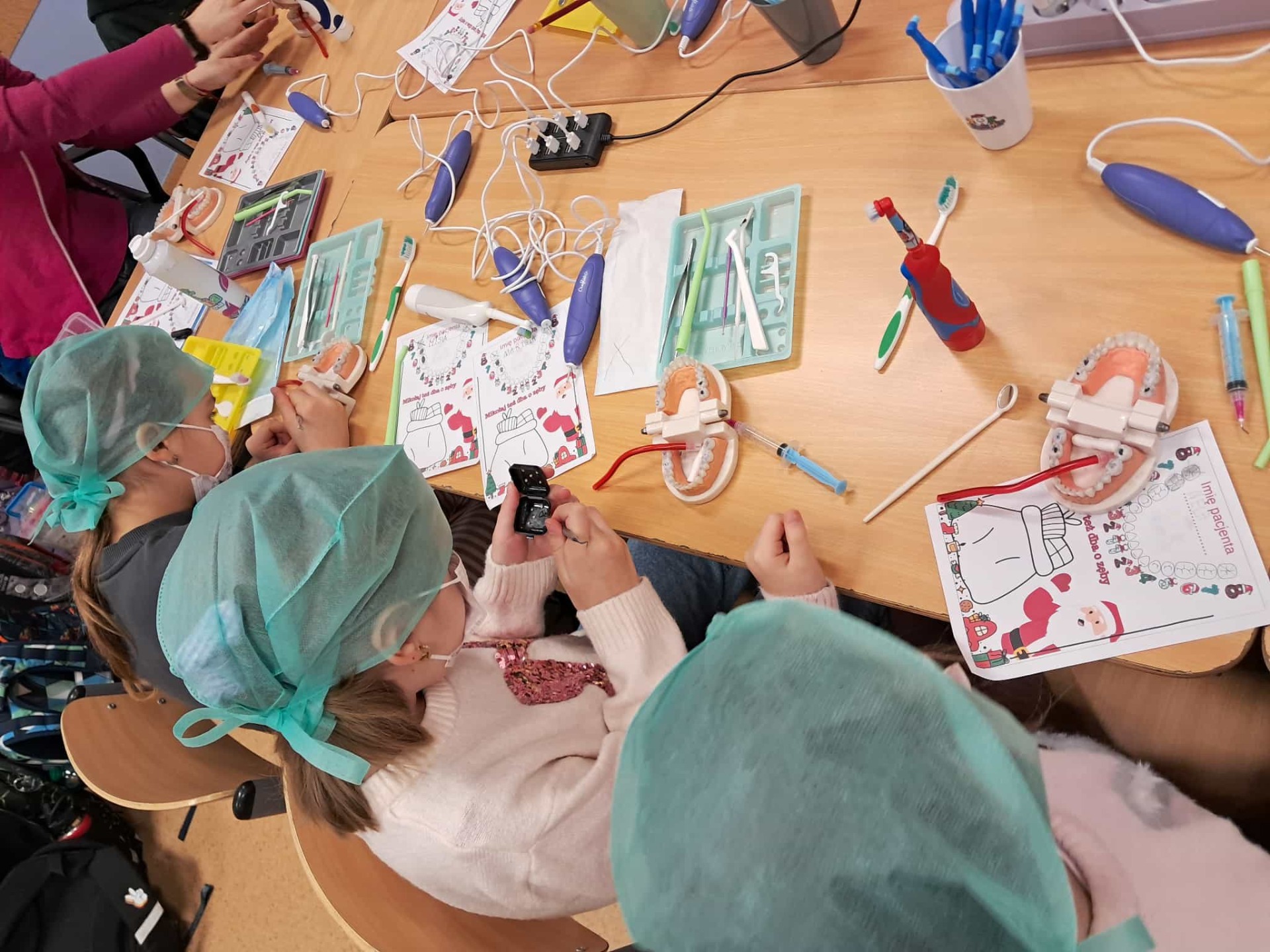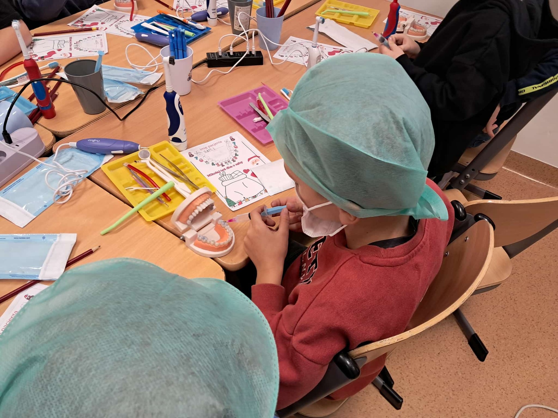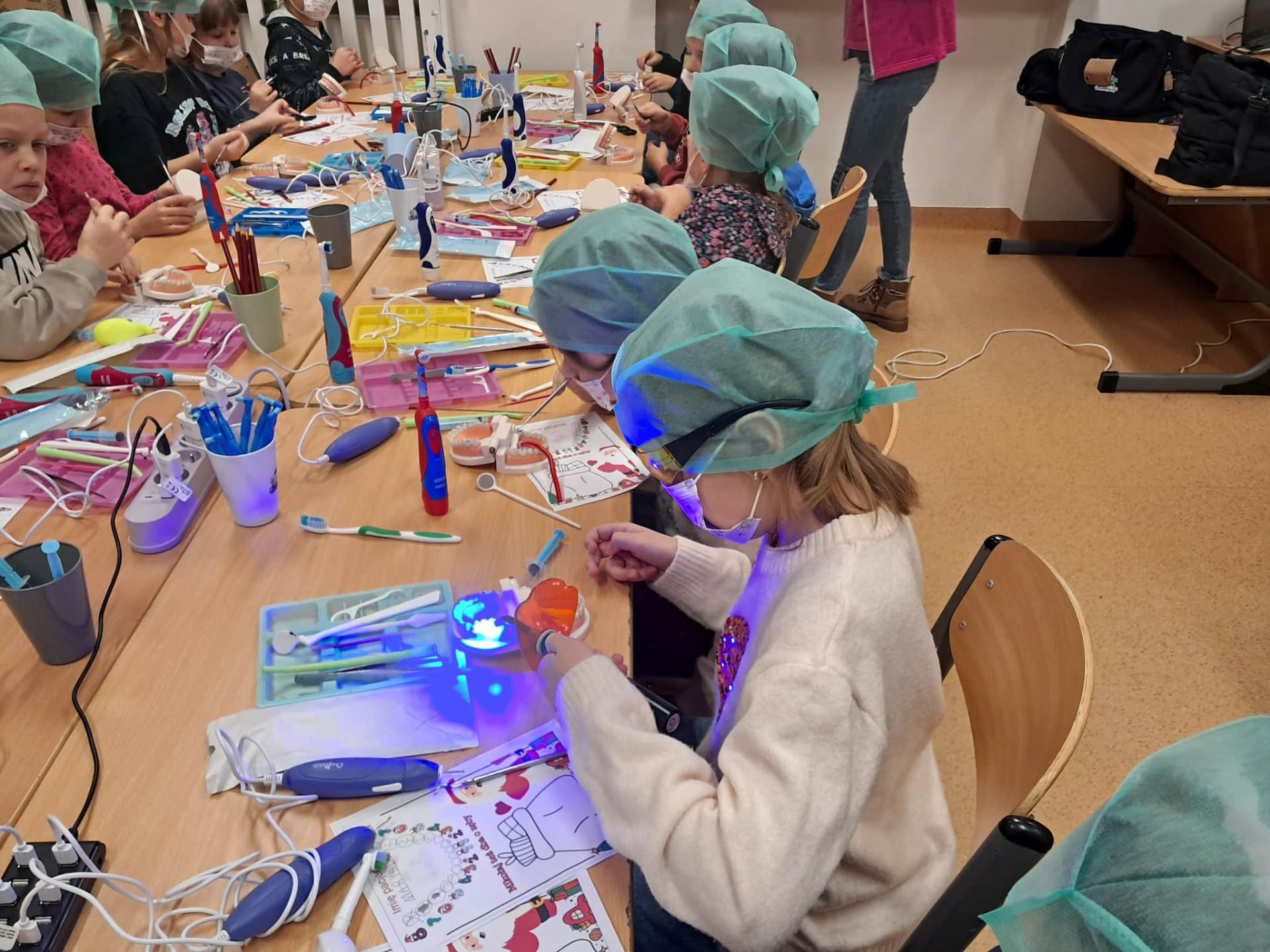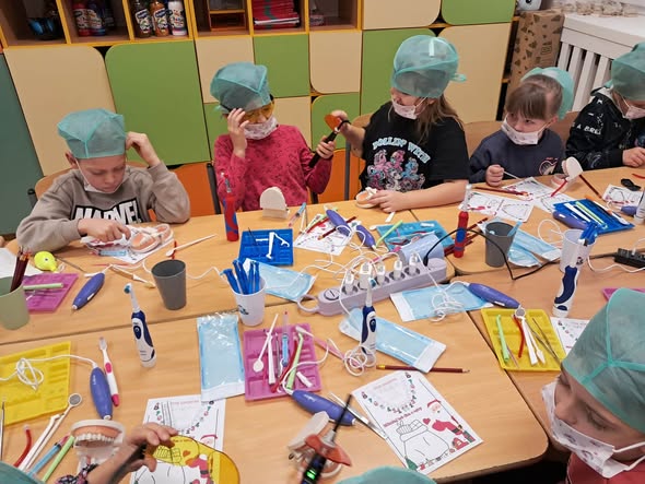 Dzieci dowiedziały się, jak prawidłowo dbać o zęby, poznały budowę jamy ustnej oraz przyczyny powstawania próchnicy. Ćwiczyły także szczotkowanie i nitkowanie, a następnie – wcielając się w rolę małych dentystów – wykonywały „przegląd pacjenta”, lakierowanie zębów i zakładanie plomby na specjalnych modelach. To świetny sposób, aby pokazać, że gabinet dentystyczny może być miejscem ciekawym, a nie strasznym! 🎓